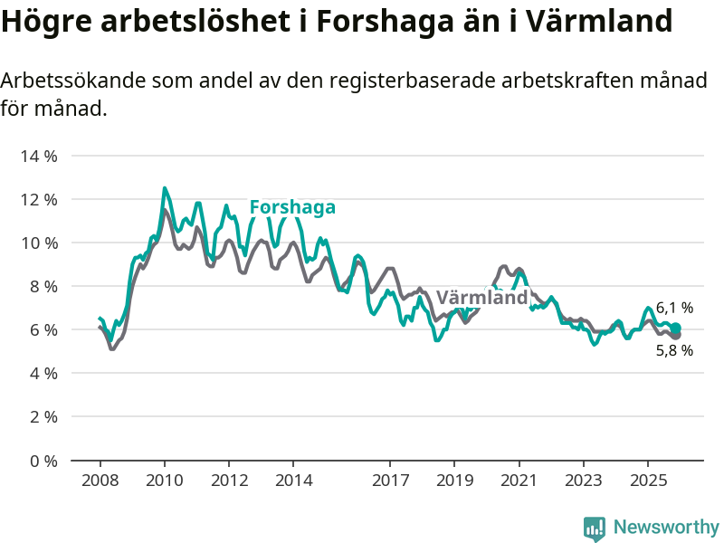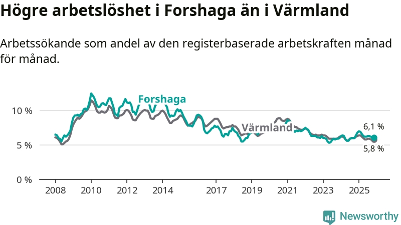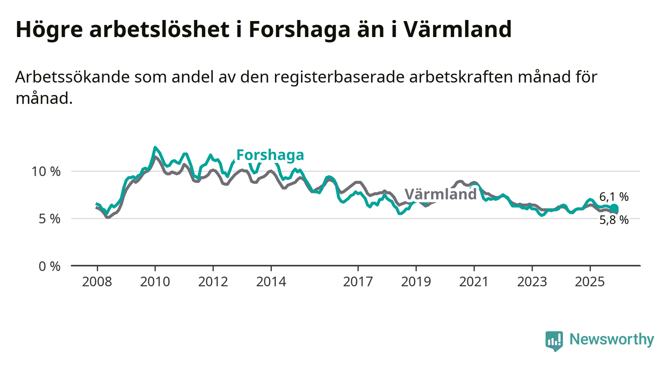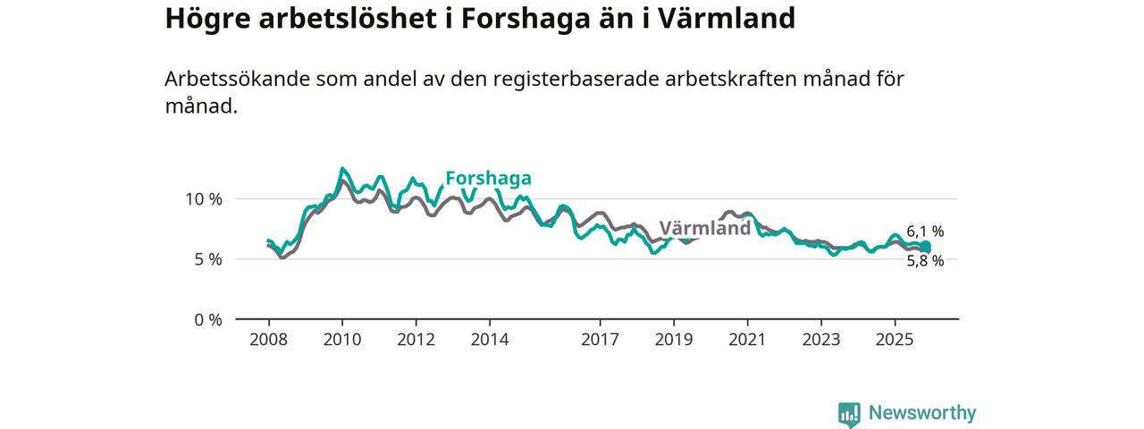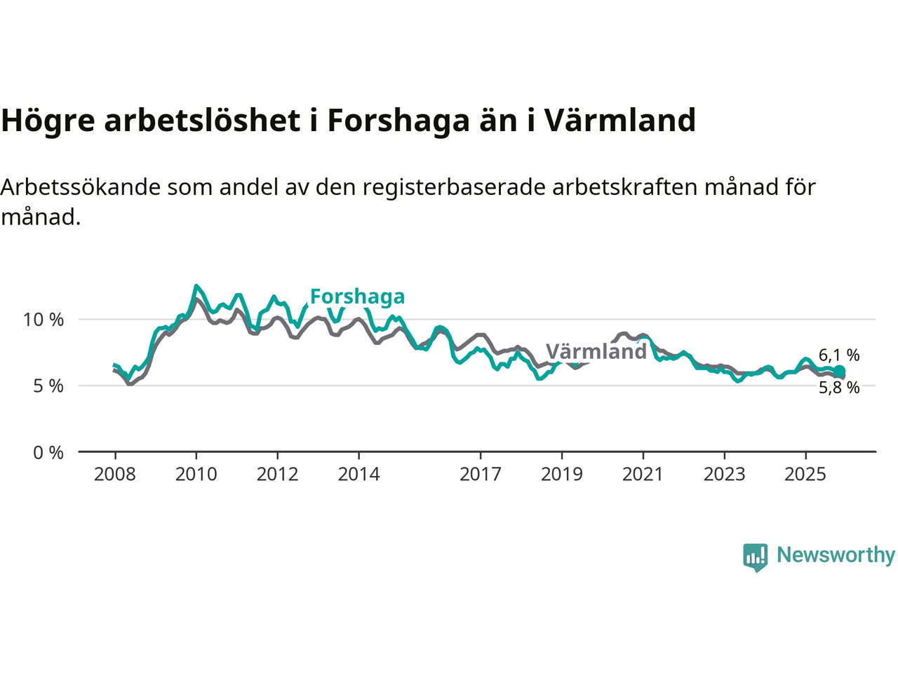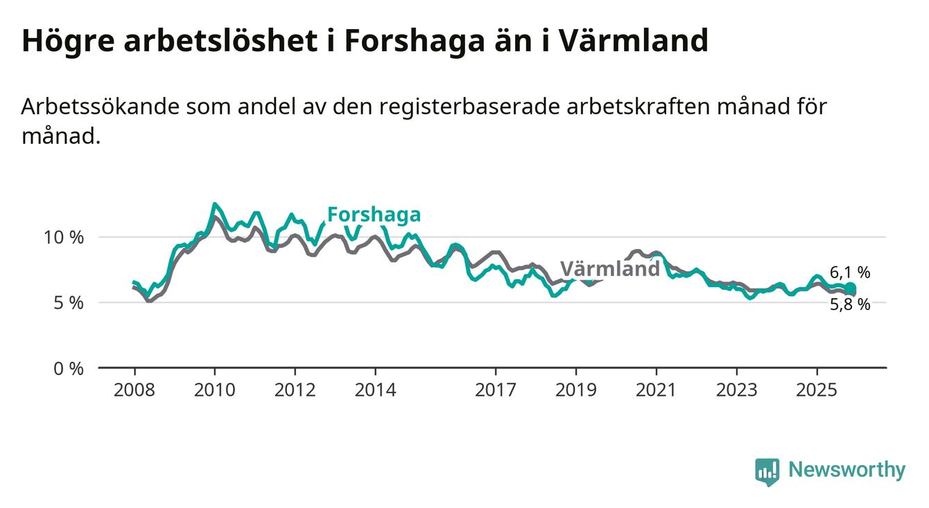 Under november månad rapporterade Forshaga kommun en total arbetslöshet på 6,1 procent. Det är en minskning jämfört med samma tidpunkt i fjol (−0,3 procentenheter). Även i Värmlands län sjunker arbetslösheten .