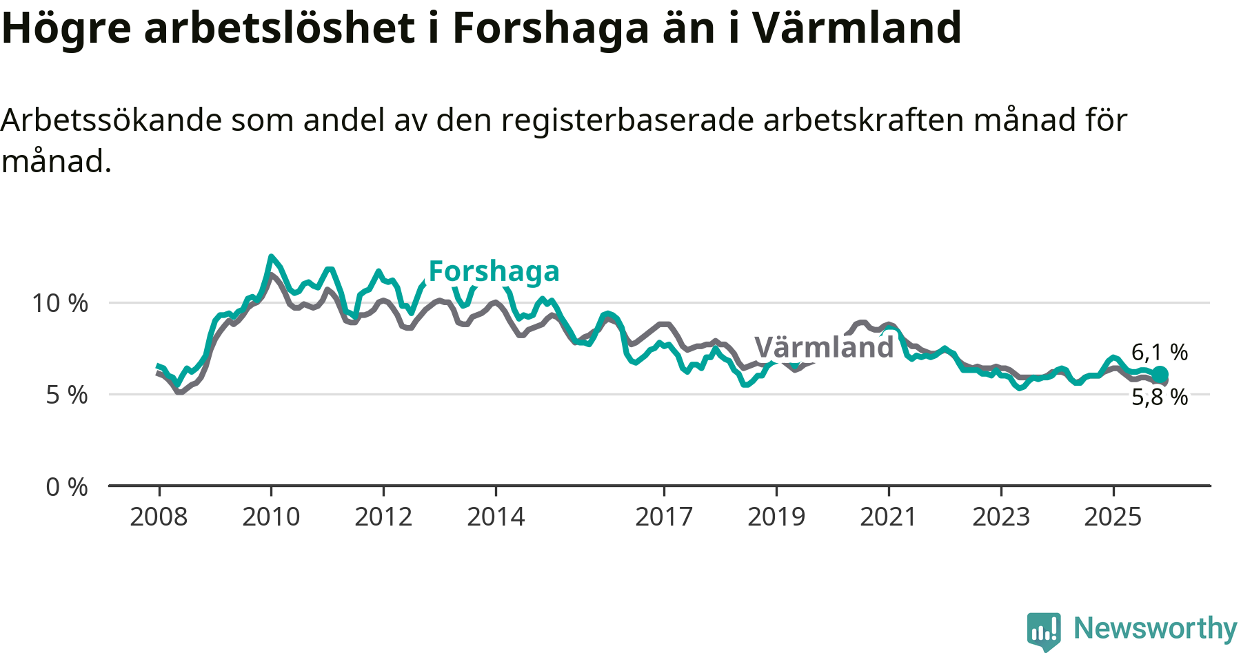 Även om arbetslösheten i Forshaga alltså minskar, så ligger den fortfarande över snittet i hela Värmlands län (6,1 procent i kommunen, jämfört med 5,8 procent i hela länet). Torsby har den lägsta arbetslösheten i länet (3,5 procent), medan Filipstad har den högsta (8,5 procent). För att Forshaga skulle komma ner i samma arbetslöshetsnivå som Torsby skulle 139 personer behöva sysselsättas.