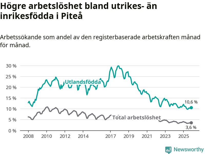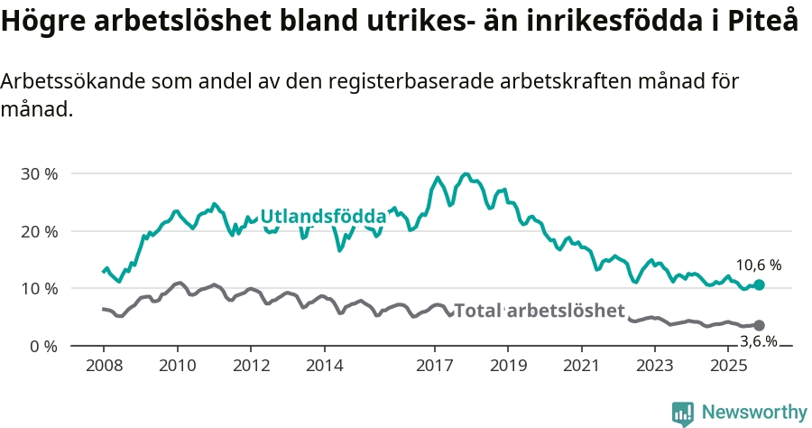 Arbetslösheten bland utlandsfödda var 10,6 procent i Piteå under november månad, motsvarande 208 av 1 962 personer. Det är 0,4 procentenheter färre än vid samma tidpunkt i fjol (±0 om man räknar personer). Därmed har de utlandsföddas arbetslöshet varit lägre än vid samma tidpunkt i fjol i över två år i sträck.