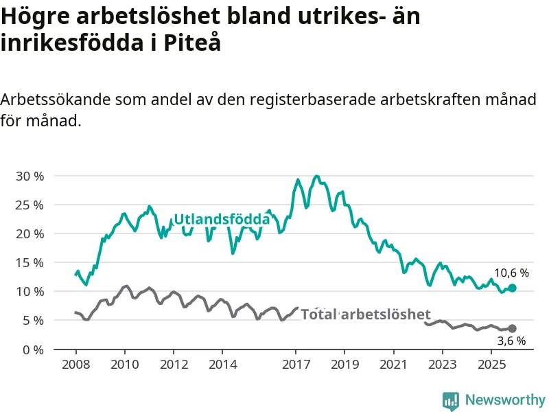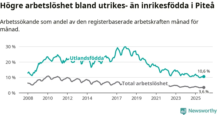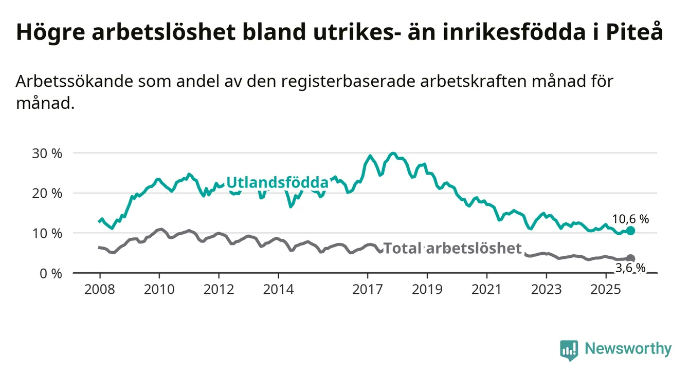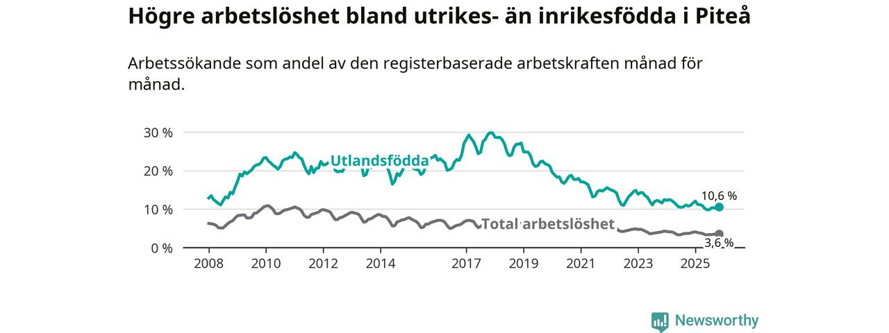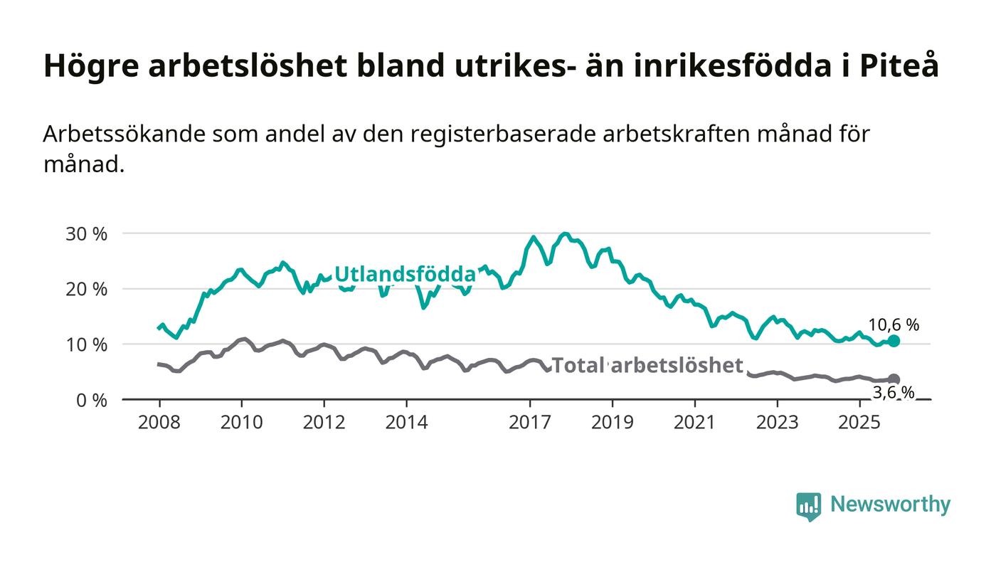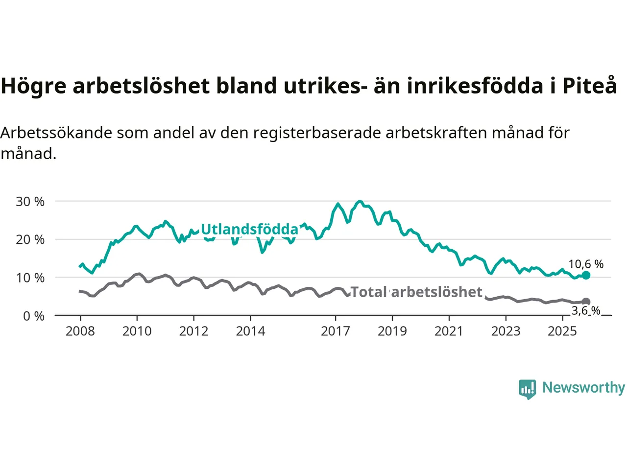 Den senaste månadsstatistiken från Arbetsförmedlingen visar på en nedgång i arbetslöshet bland utlandsfödda i Piteå kommun med 0,4 procentenheter. Arbetslösheten bland invånare födda i ett annat land låg i november på 10,6 procent.