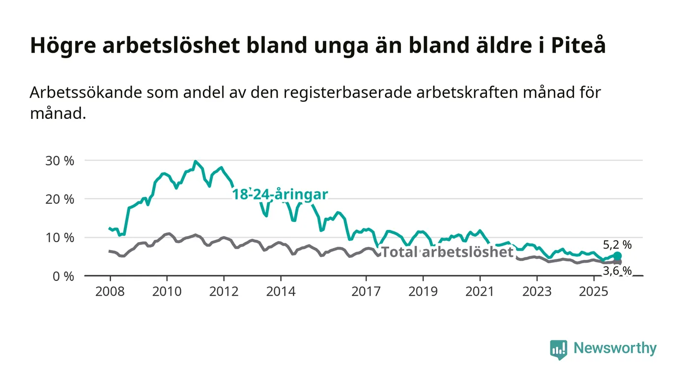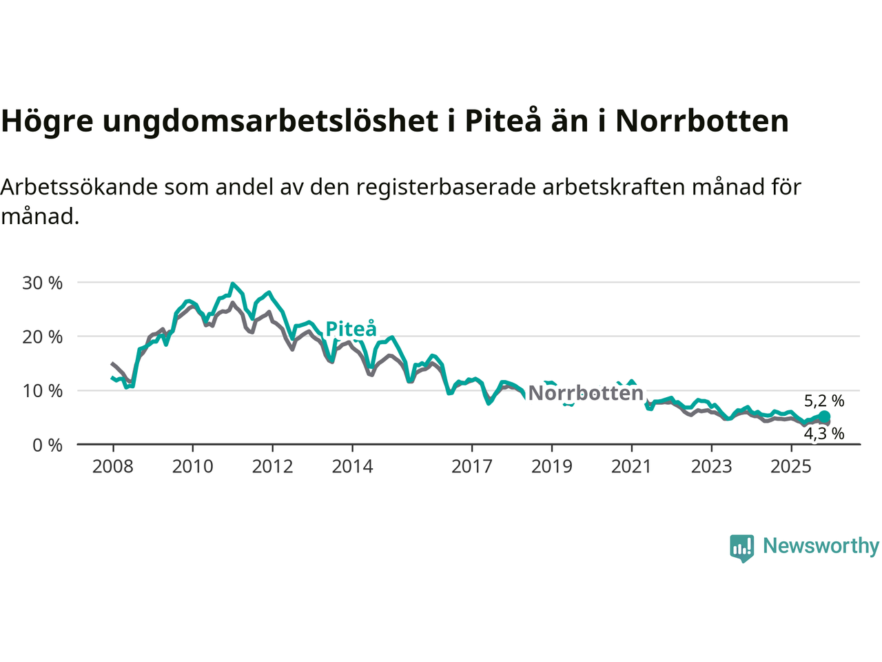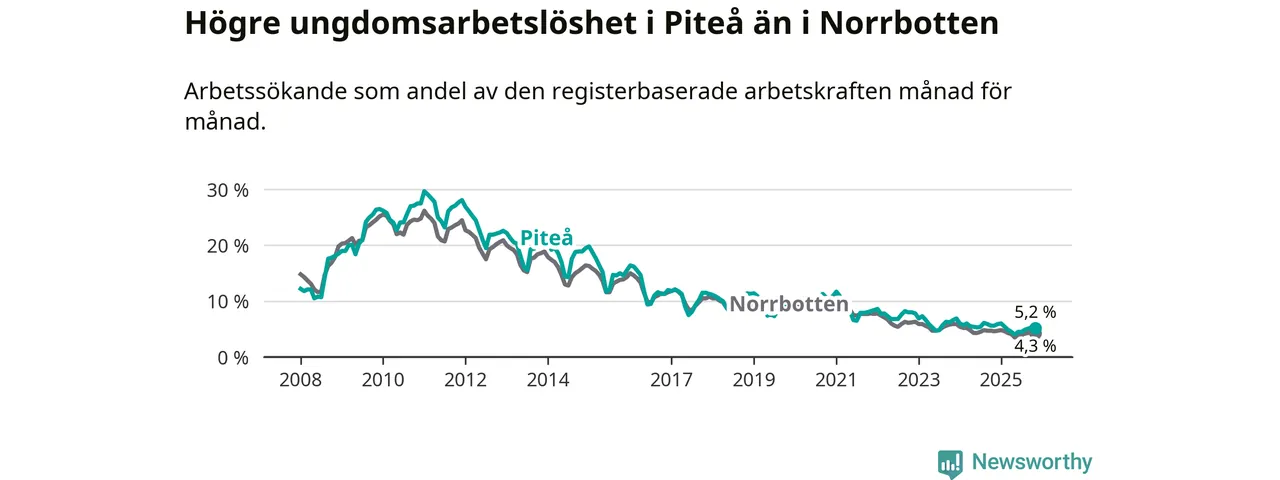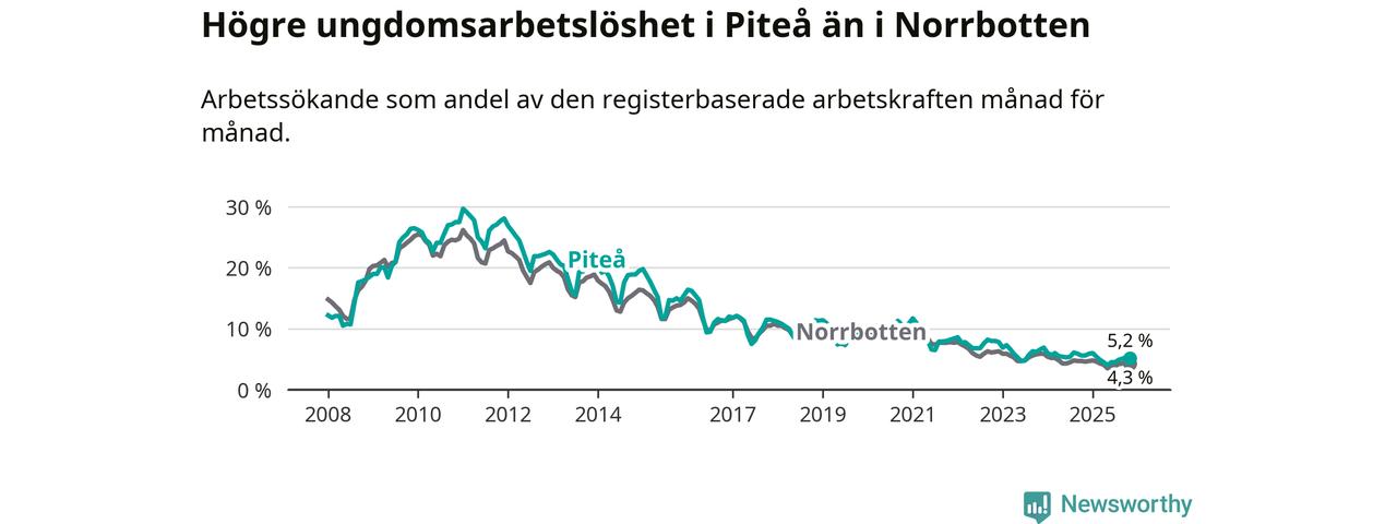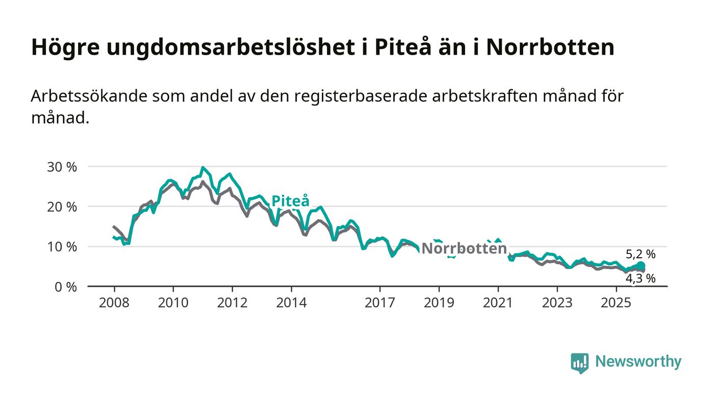 Medan Piteå har lägre total arbetslöshet än Norrbotten, ligger ungdomsarbetslösheten 0,9 procentenheter högre i Piteå.