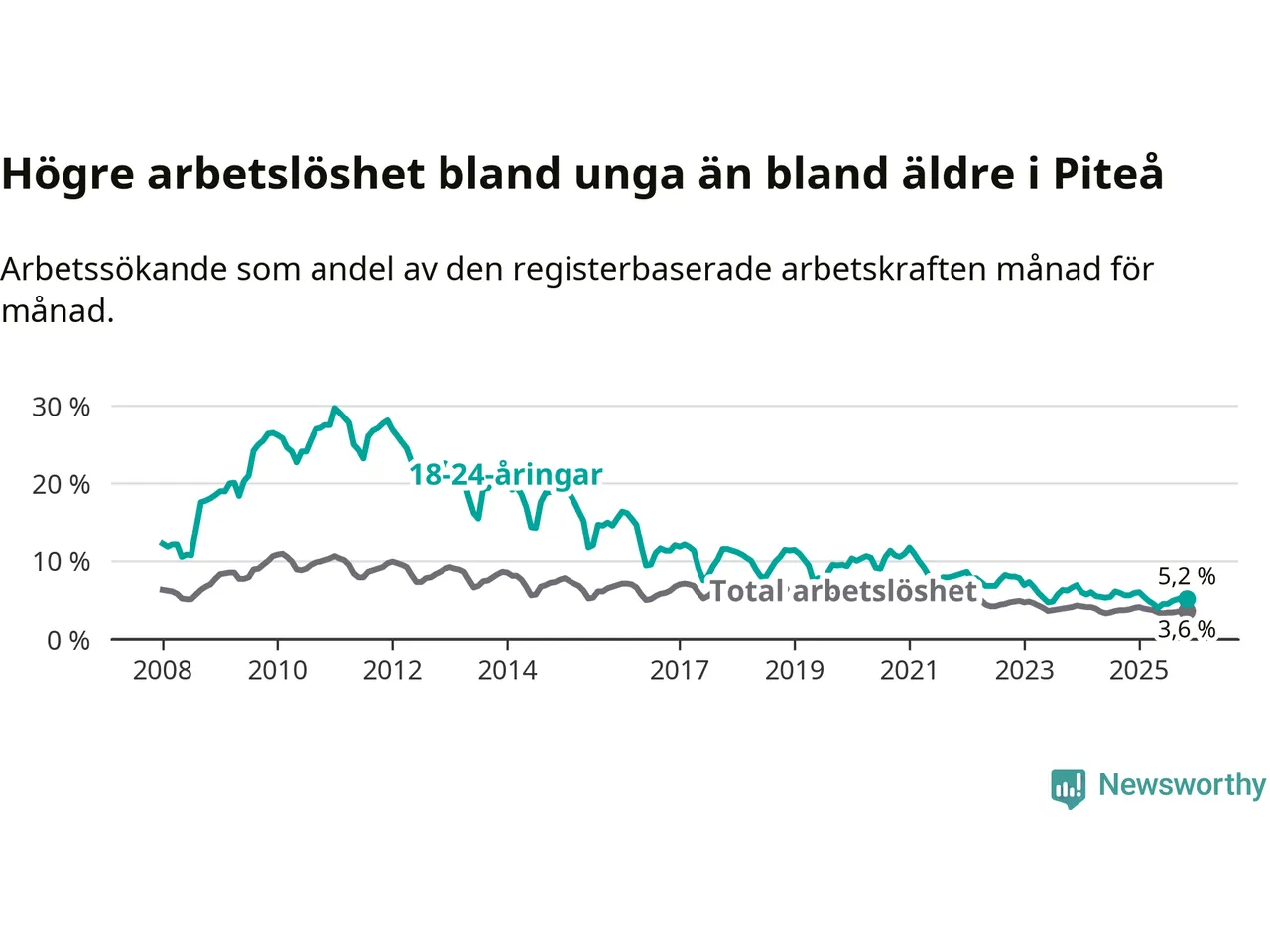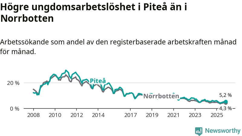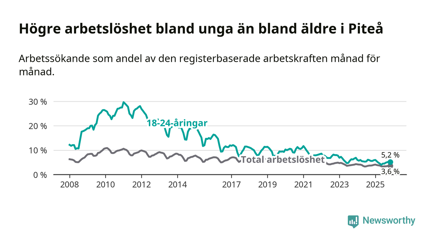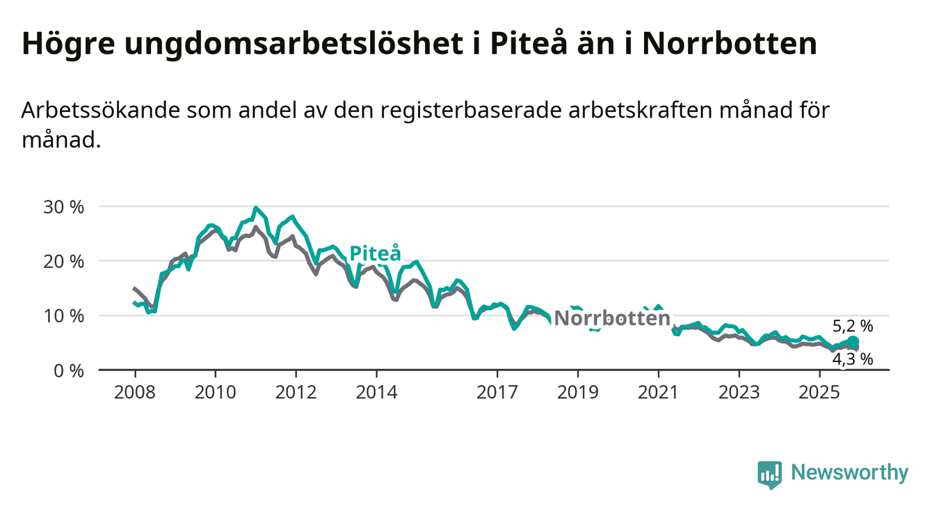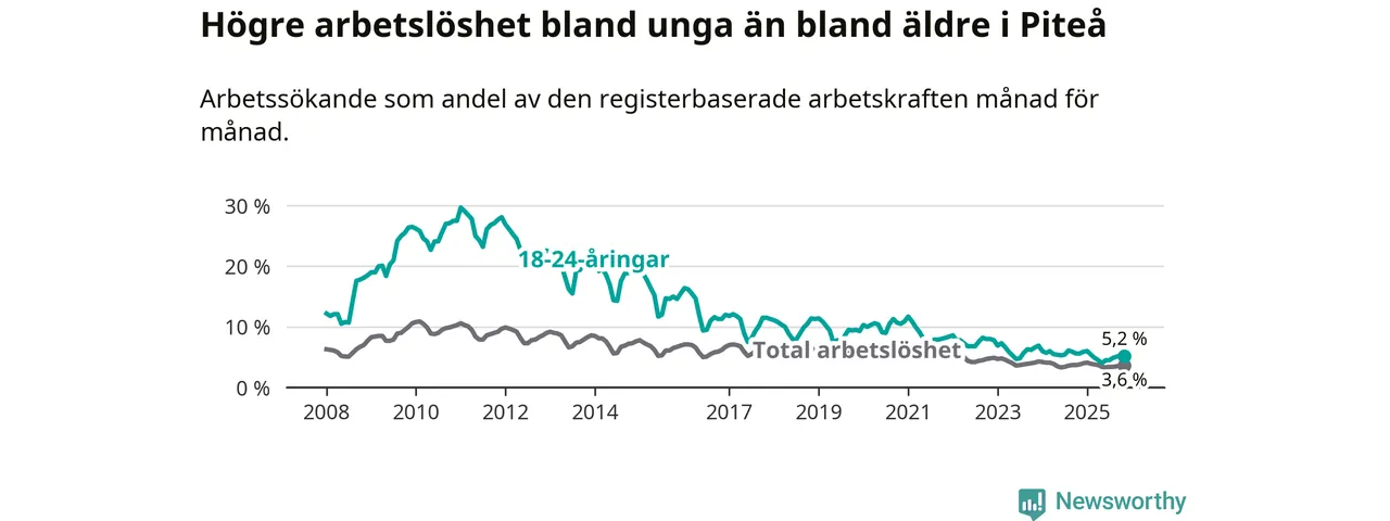 Medan Piteå har lägre total arbetslöshet än Norrbotten, ligger ungdomsarbetslösheten 0,9 procentenheter högre i Piteå.