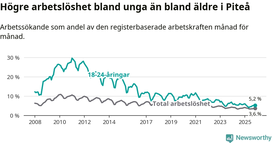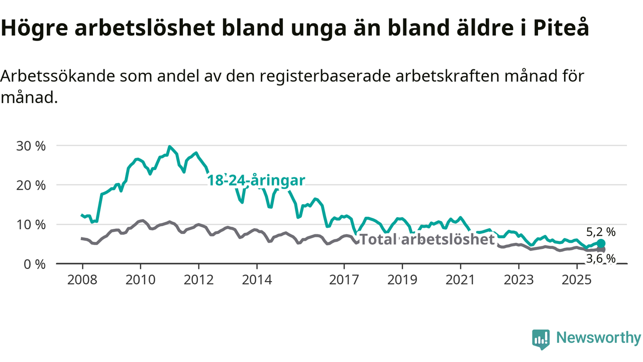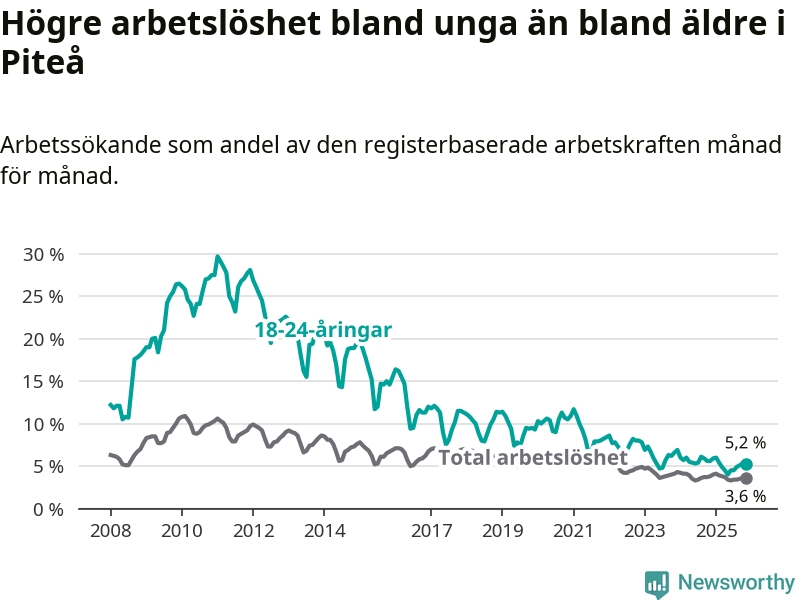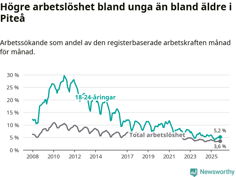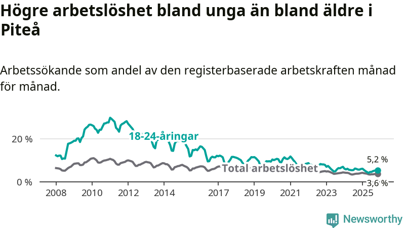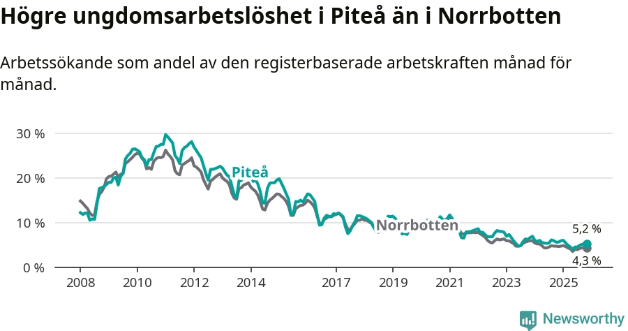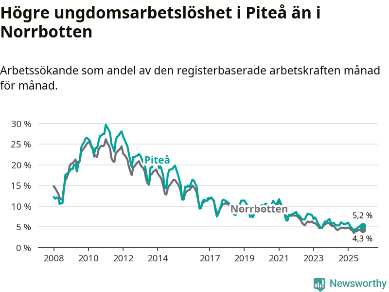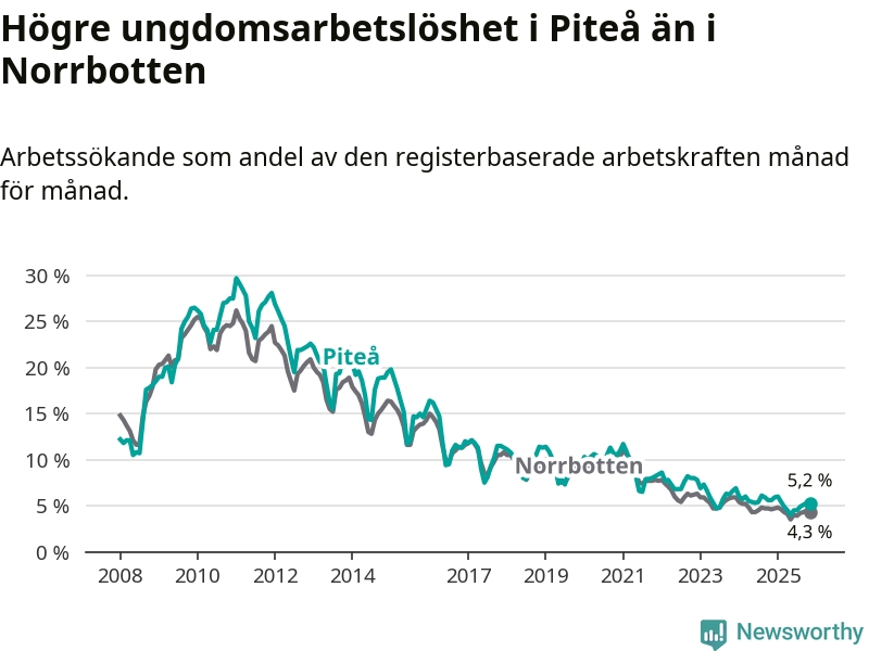 Medan Piteå har lägre total arbetslöshet än Norrbotten, ligger ungdomsarbetslösheten 0,9 procentenheter högre i Piteå.