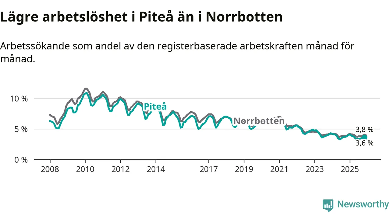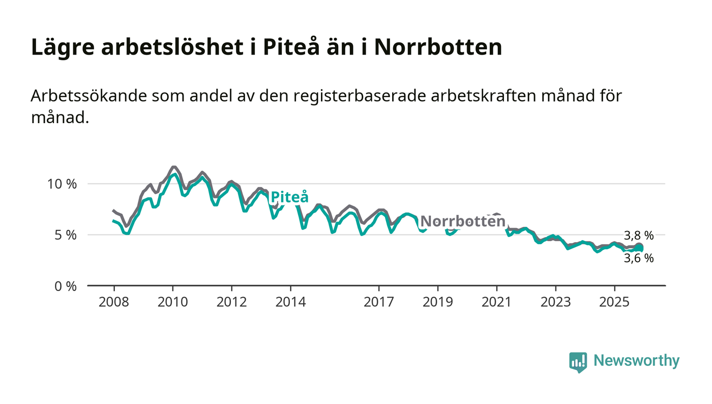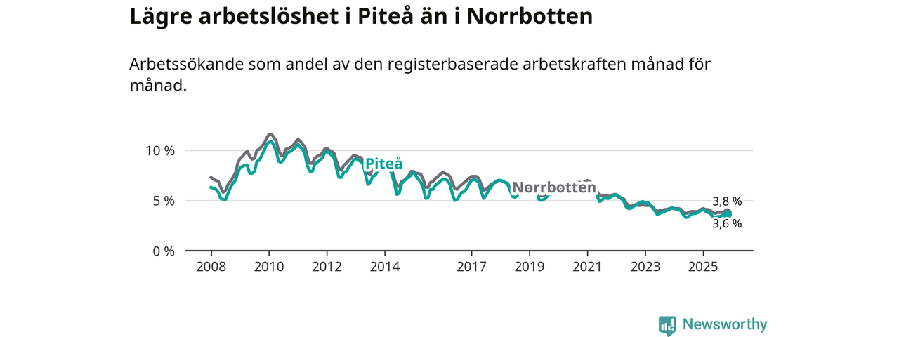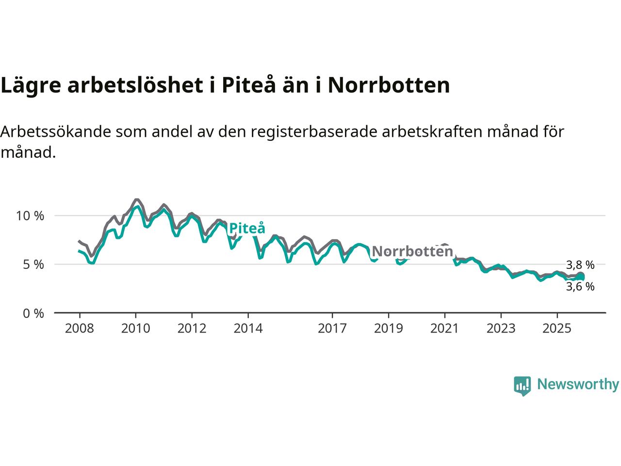 Under november månad rapporterade Piteå kommun en total arbetslöshet på 3,6 procent. Det är en minskning jämfört med samma tidpunkt i fjol (−0,2 procentenheter). Även i Norrbottens län sjunker arbetslösheten något.
