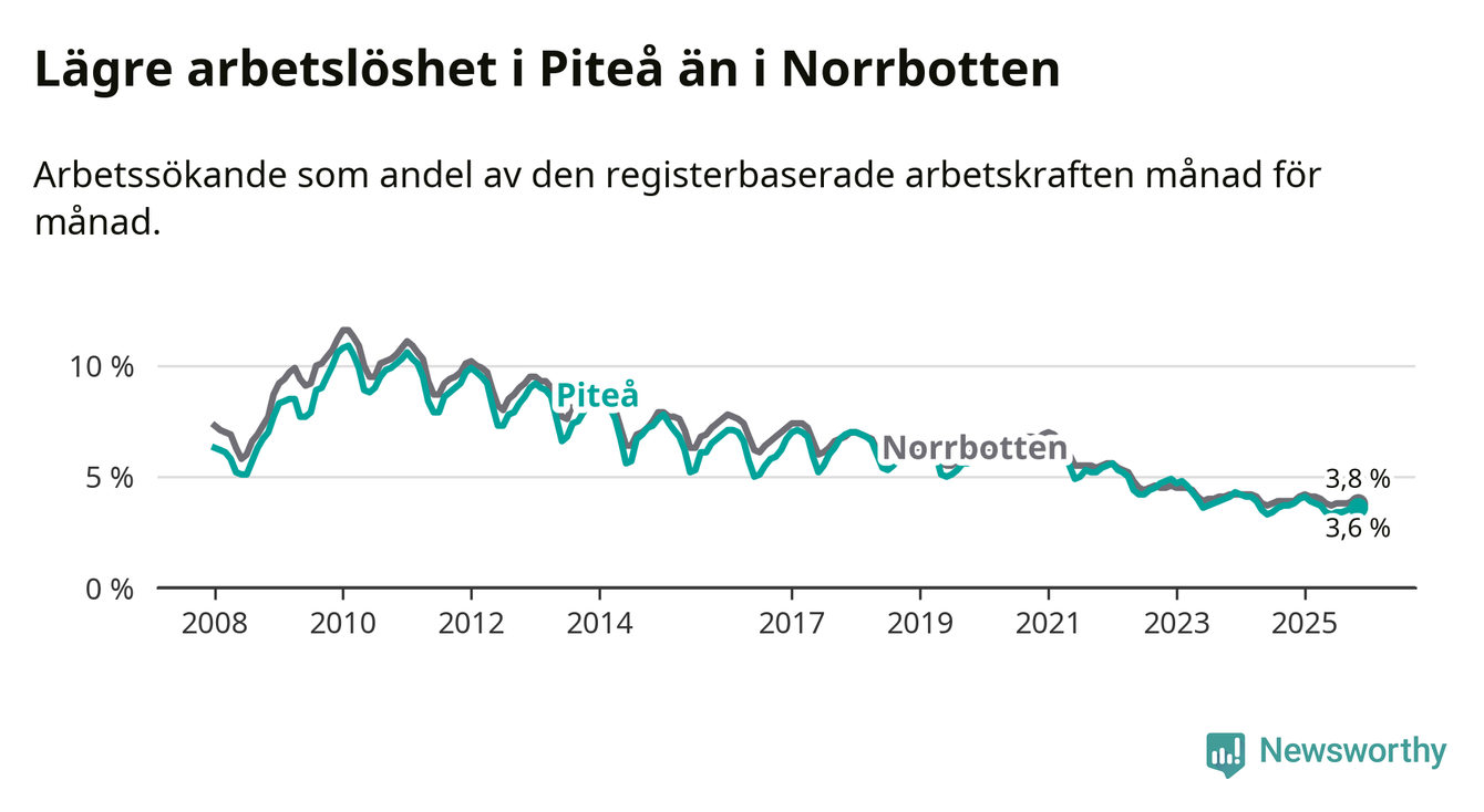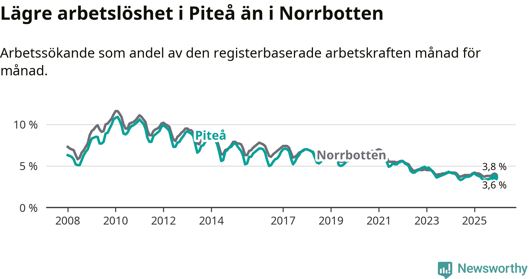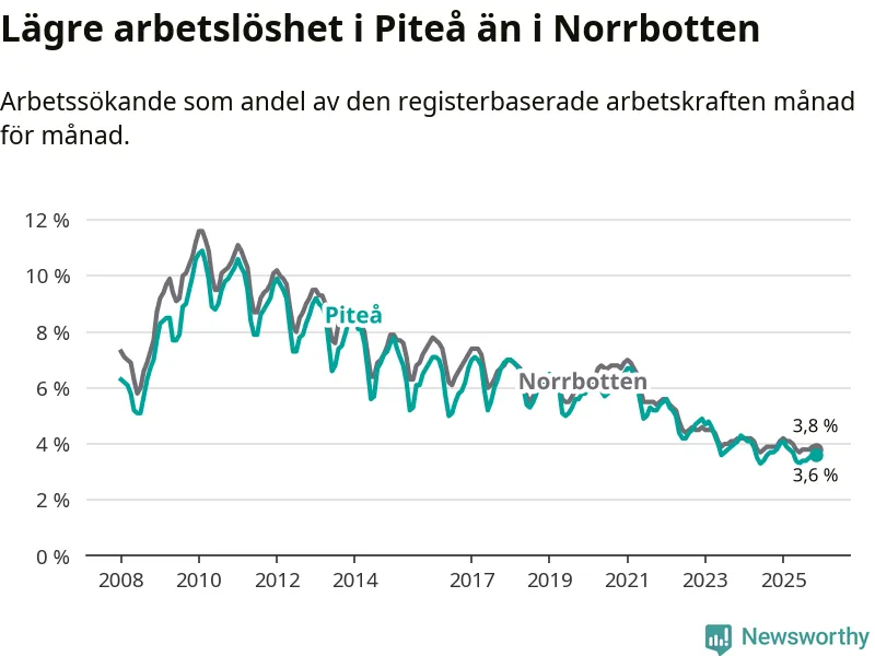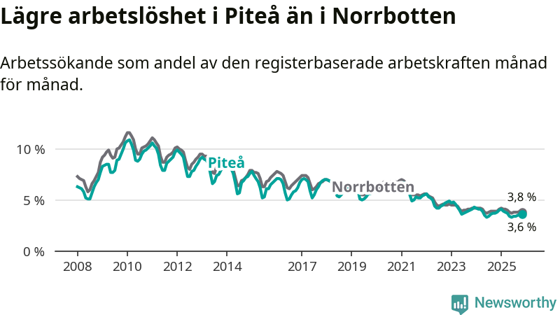 Under november månad rapporterade Piteå kommun en total arbetslöshet på 3,6 procent. Det är en minskning jämfört med samma tidpunkt i fjol (−0,2 procentenheter). Även i Norrbottens län sjunker arbetslösheten något.