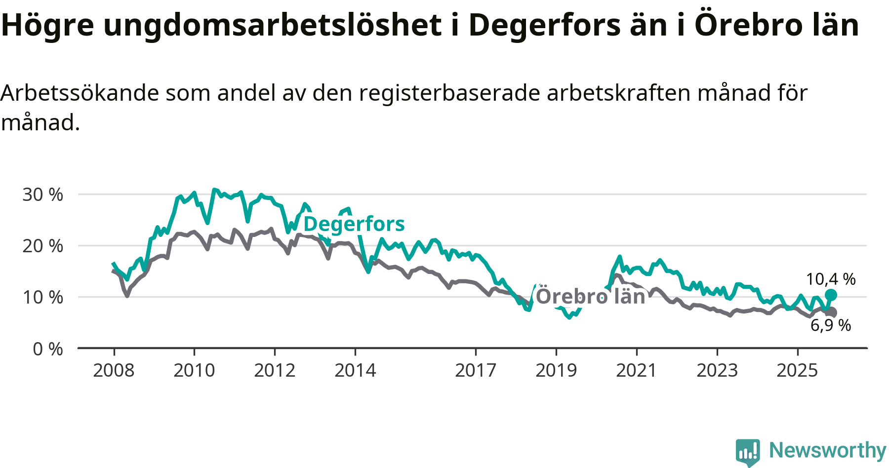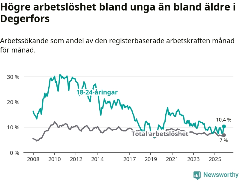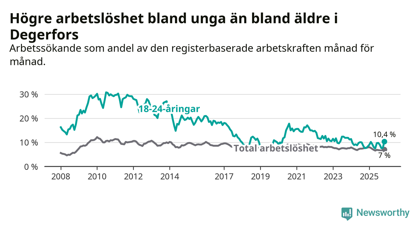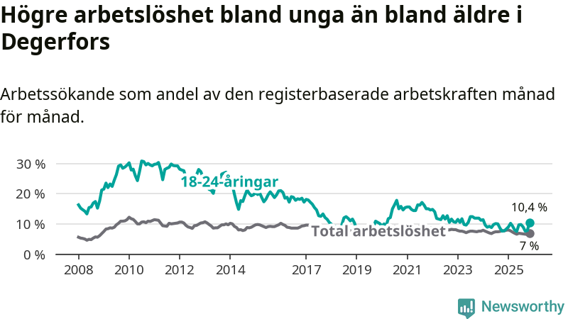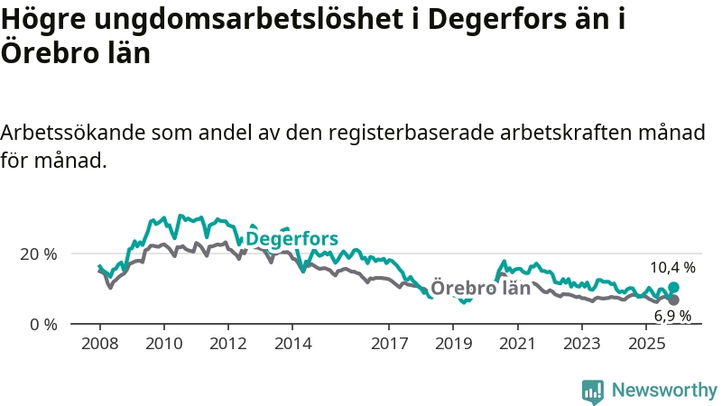 Precis som den totala arbetslösheten ligger ungdomsarbetslösheten i Degerfors högre än i Örebro som helhet. Skillnaden mellan kommunen och länet är 3,5 procentenheter.