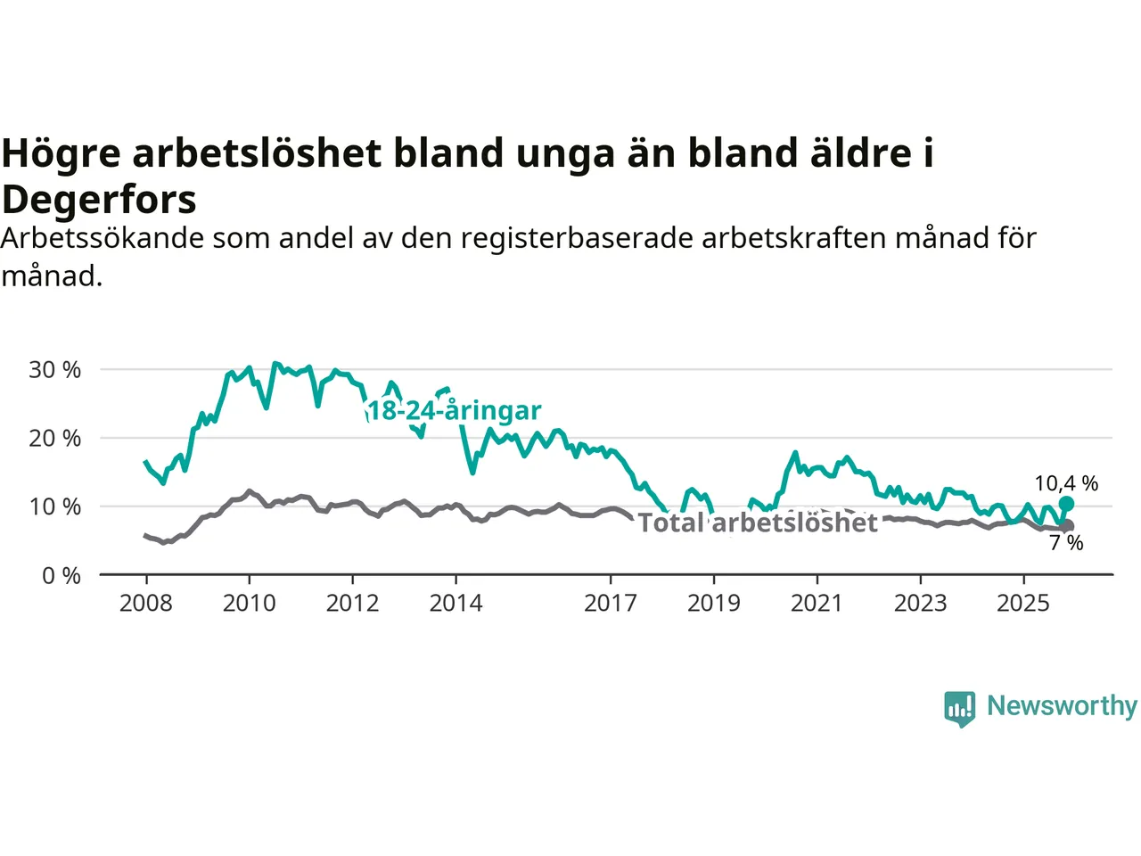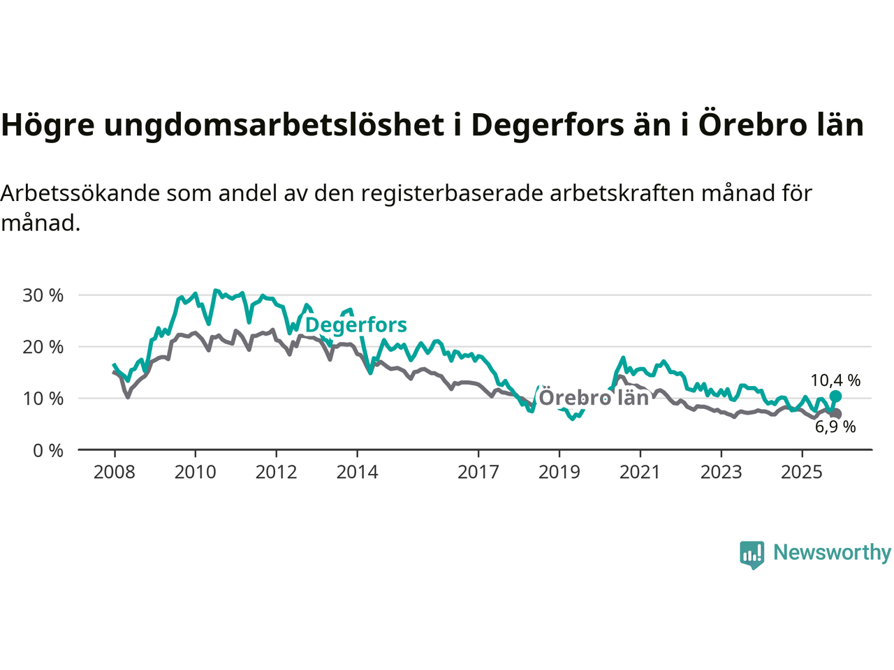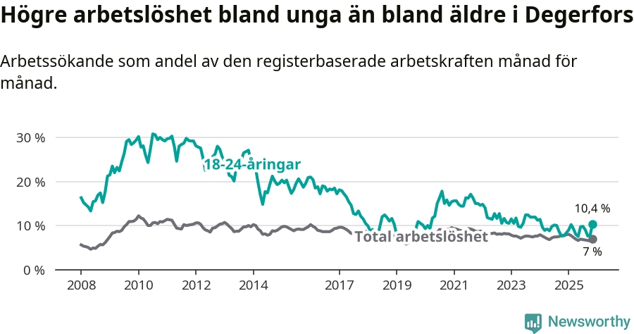 Precis som den totala arbetslösheten ligger ungdomsarbetslösheten i Degerfors högre än i Örebro som helhet. Skillnaden mellan kommunen och länet är 3,5 procentenheter.