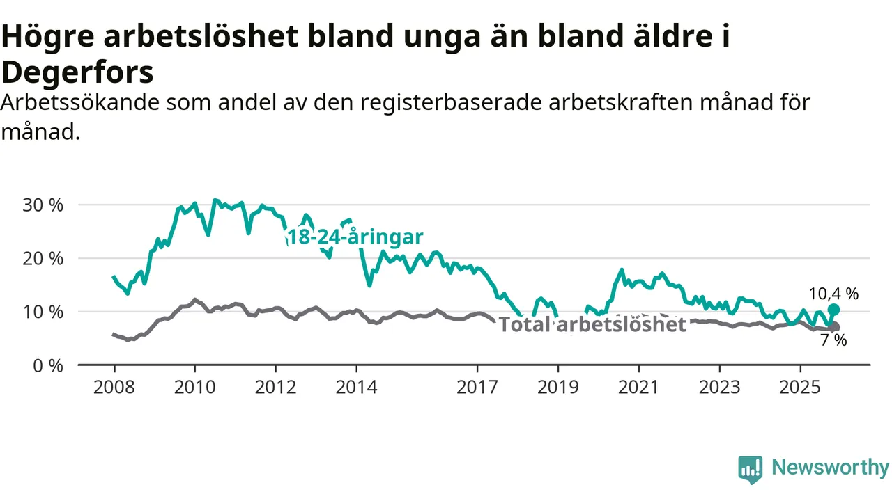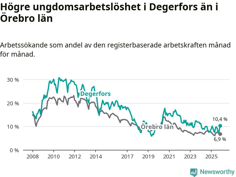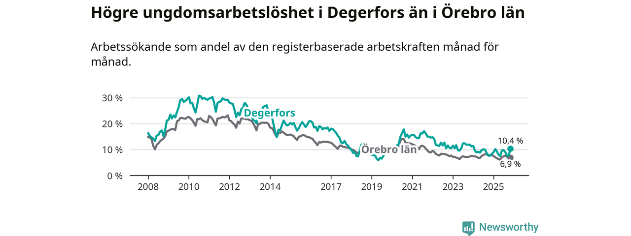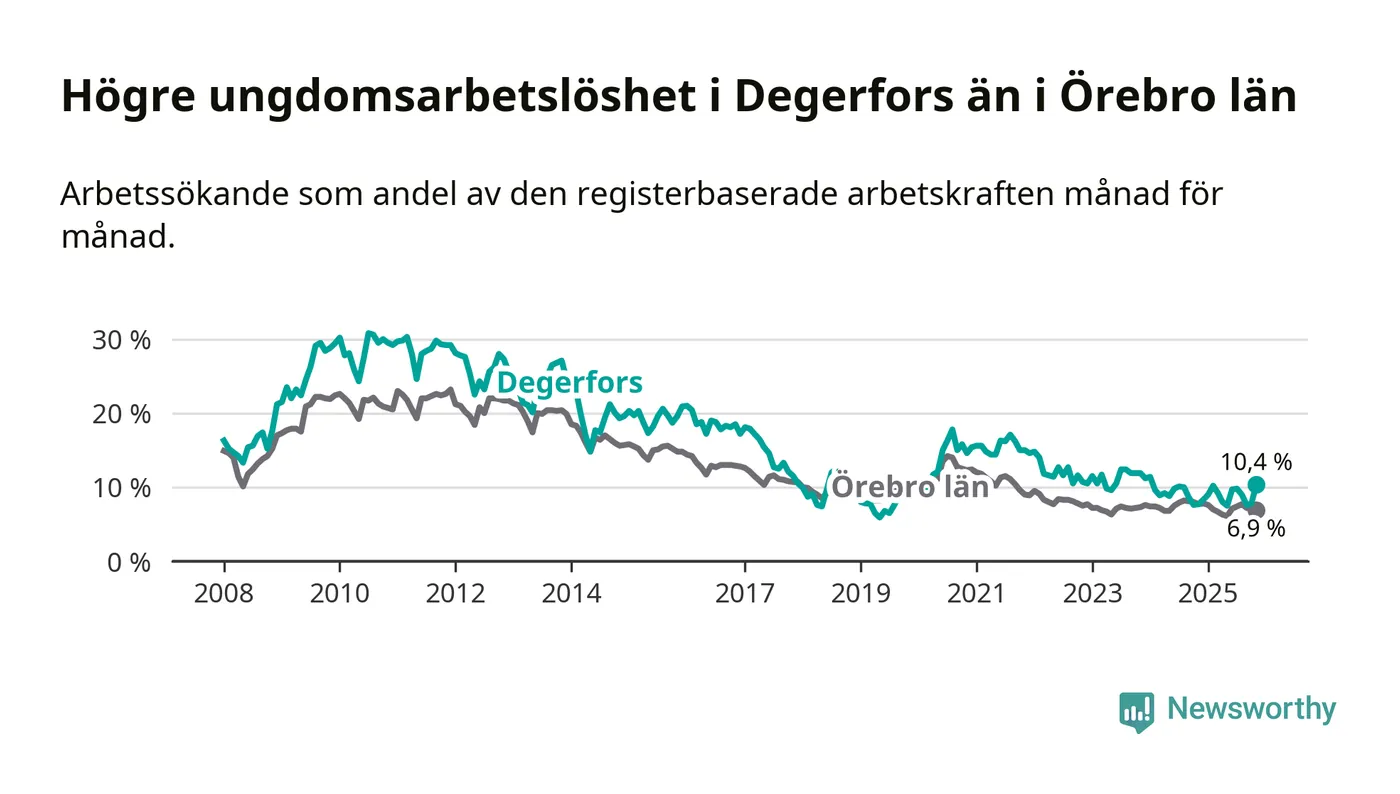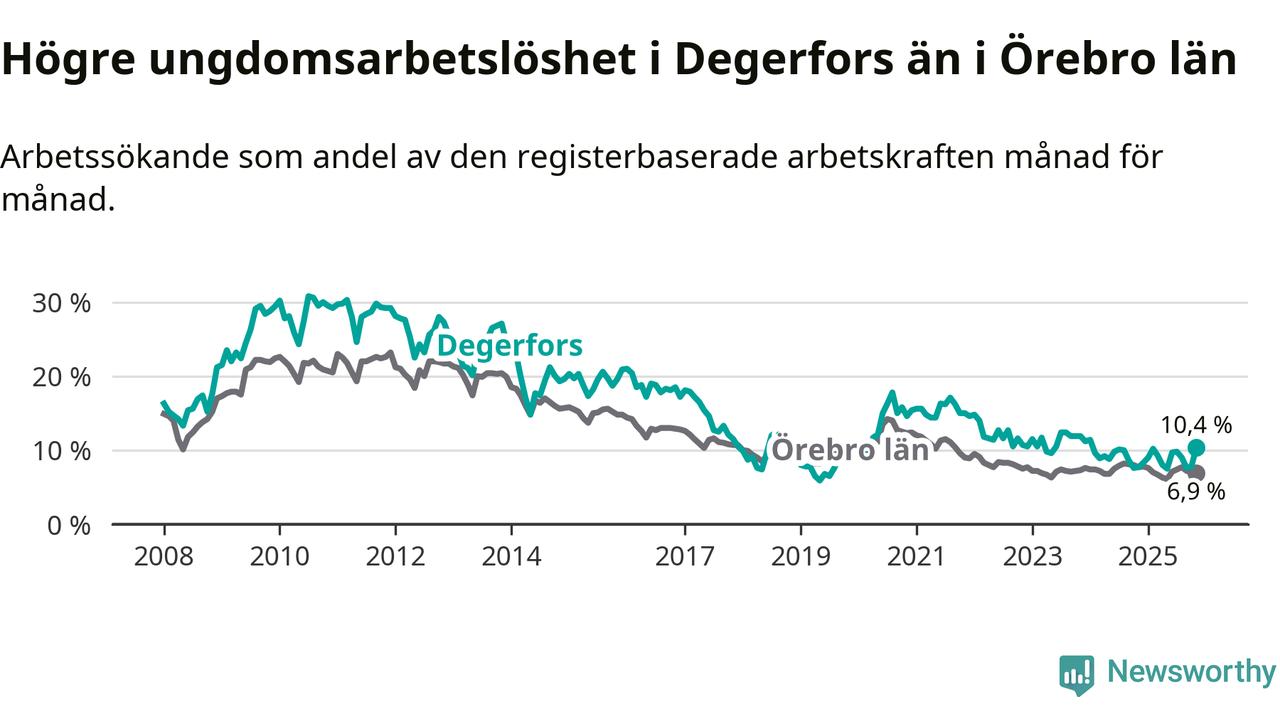 Graf: Arbetslöshet bland unga i Degerfors kommun och Örebro län