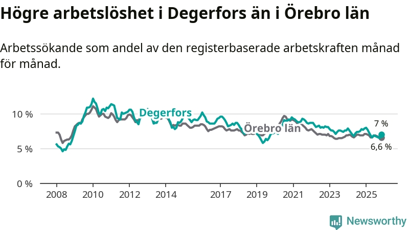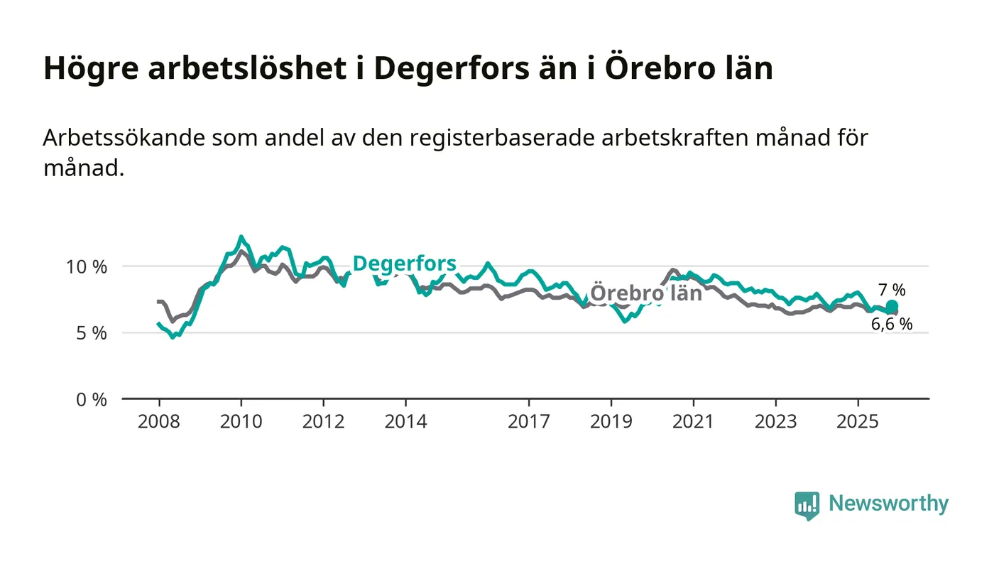 Även om arbetslösheten i Degerfors alltså minskar, så ligger den fortfarande över snittet i hela Örebro län (7,0 procent i kommunen, jämfört med 6,6 procent i hela länet). Askersund har den lägsta arbetslösheten i länet (4,1 procent), medan Örebro har den högsta (7,4 procent). För att Degerfors skulle komma ner i samma arbetslöshetsnivå som Askersund skulle 119 personer behöva sysselsättas.