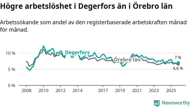 Under november månad rapporterade Degerfors kommun en total arbetslöshet på 7,0 procent. Det är en minskning jämfört med samma tidpunkt i fjol (−0,7 procentenheter). Även i Örebro län sjunker arbetslösheten .
