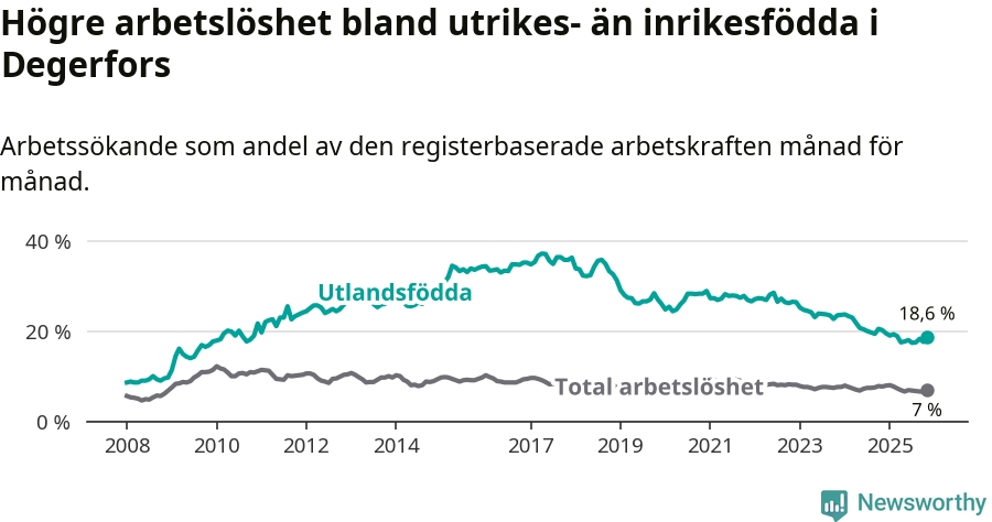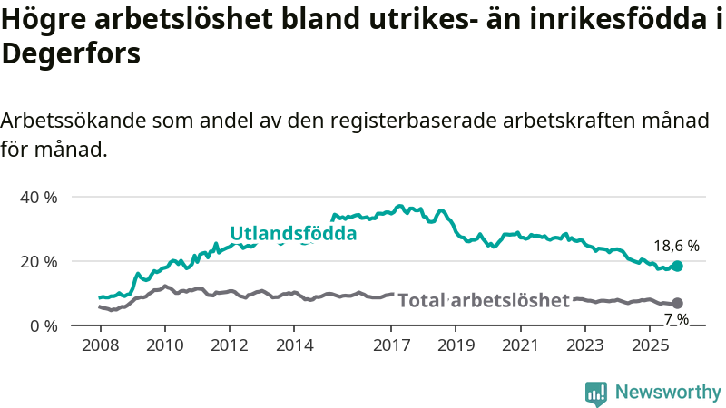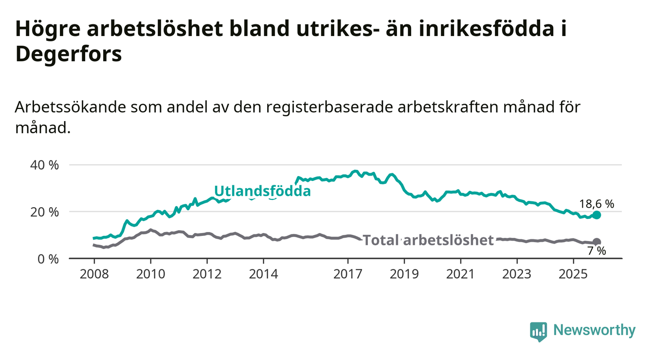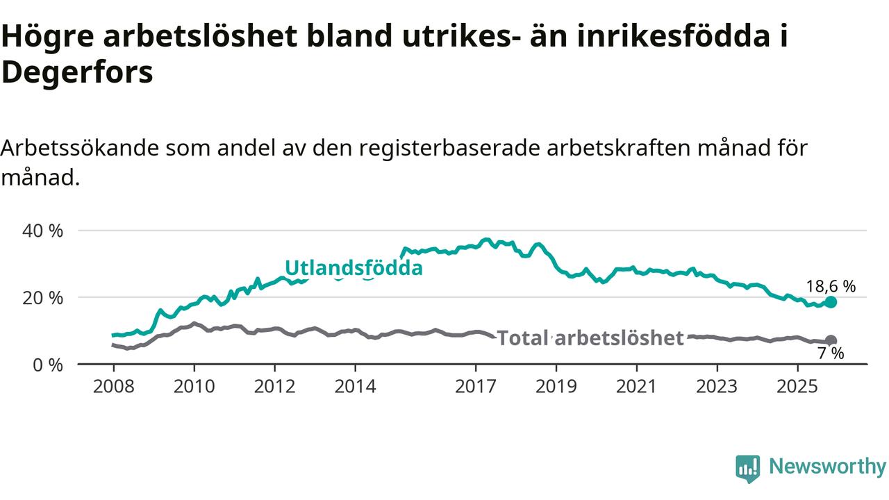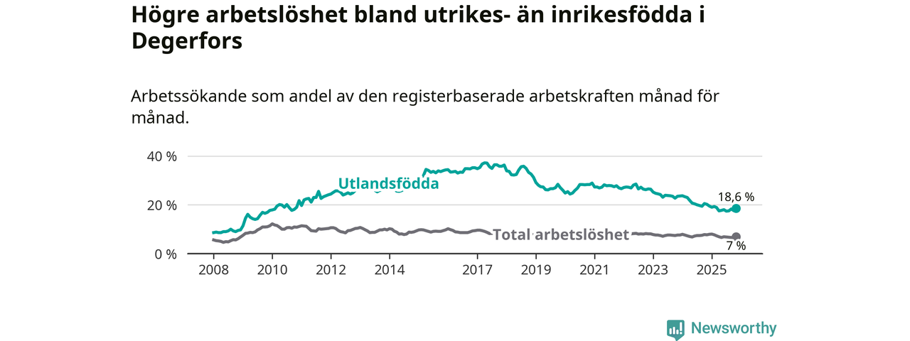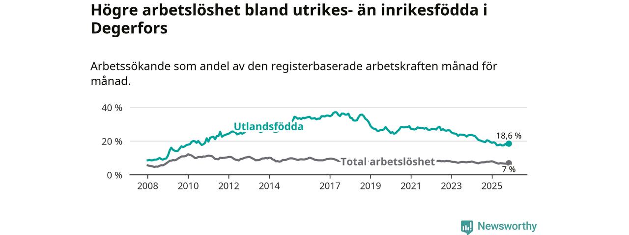 Skillnaden i arbetslöshet mellan utrikesfödda och hela befolkningen är 11,6 procentenheter i Degerfors. Det är en mindre skillnad än för ett år sedan (−0,9 procentenheter).