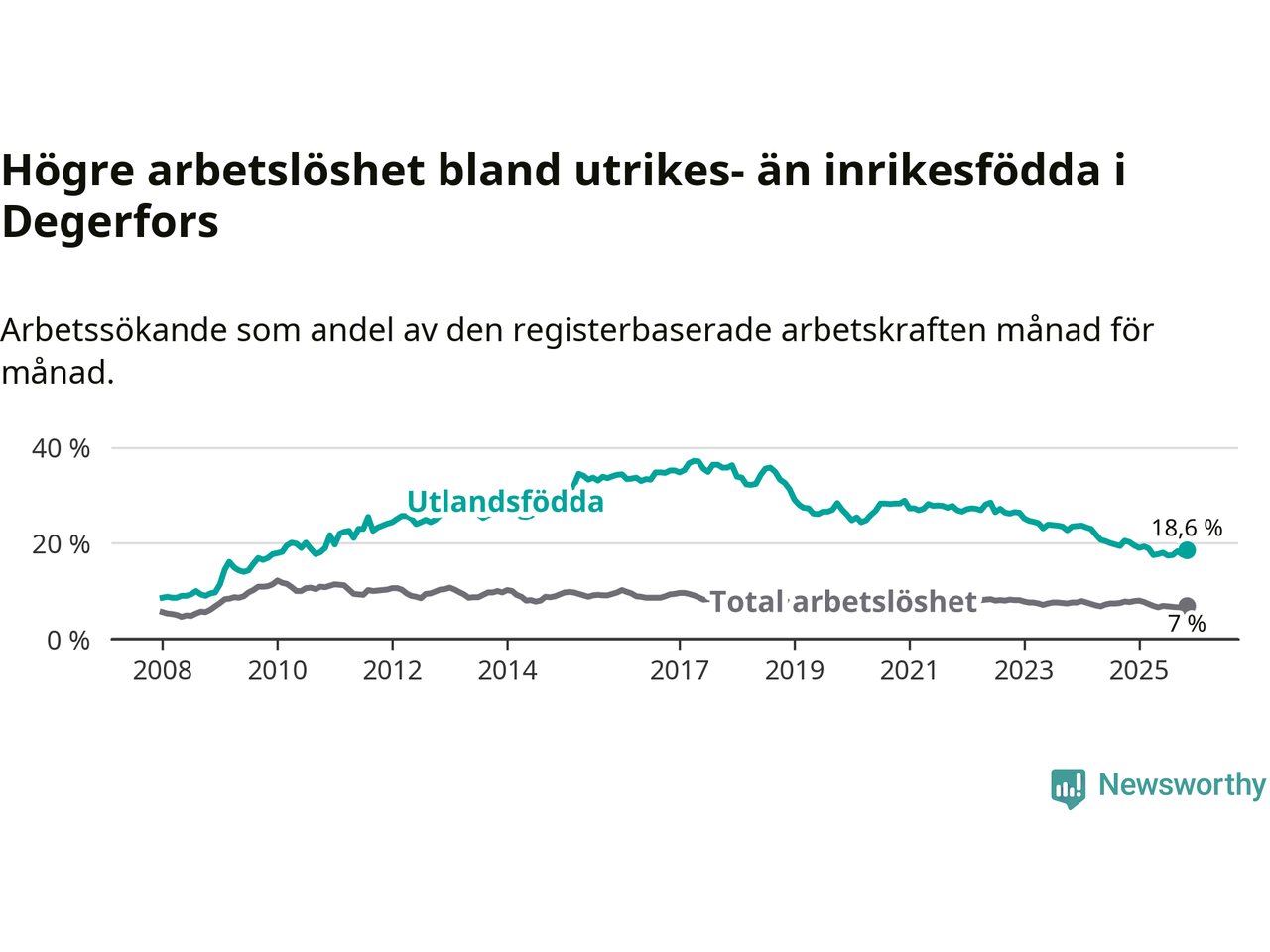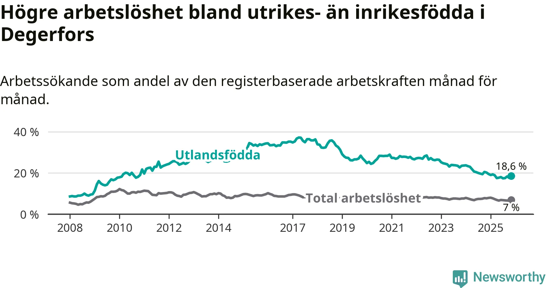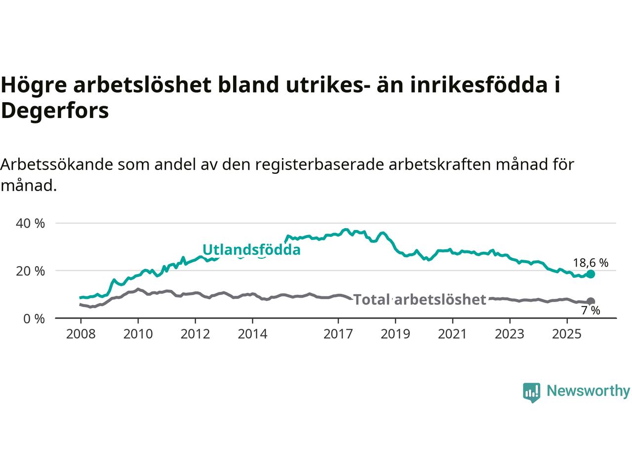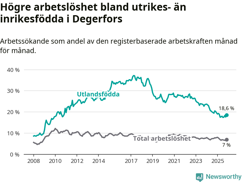 Skillnaden i arbetslöshet mellan utrikesfödda och hela befolkningen är 11,6 procentenheter i Degerfors. Det är en mindre skillnad än för ett år sedan (−0,9 procentenheter).