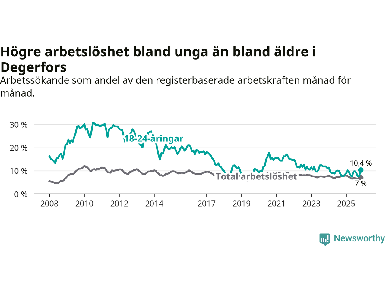 Till skillnad från den totala arbetslösheten stiger arbetslösheten bland unga (+2,7 procentenheter). I november var 10,4 procent av 18–24-åringarna inskrivna som arbetssökande (motsvarande 37 personer). Mäter vi antalet inskrivna ser vi en ökning med sju personer på ett års sikt.