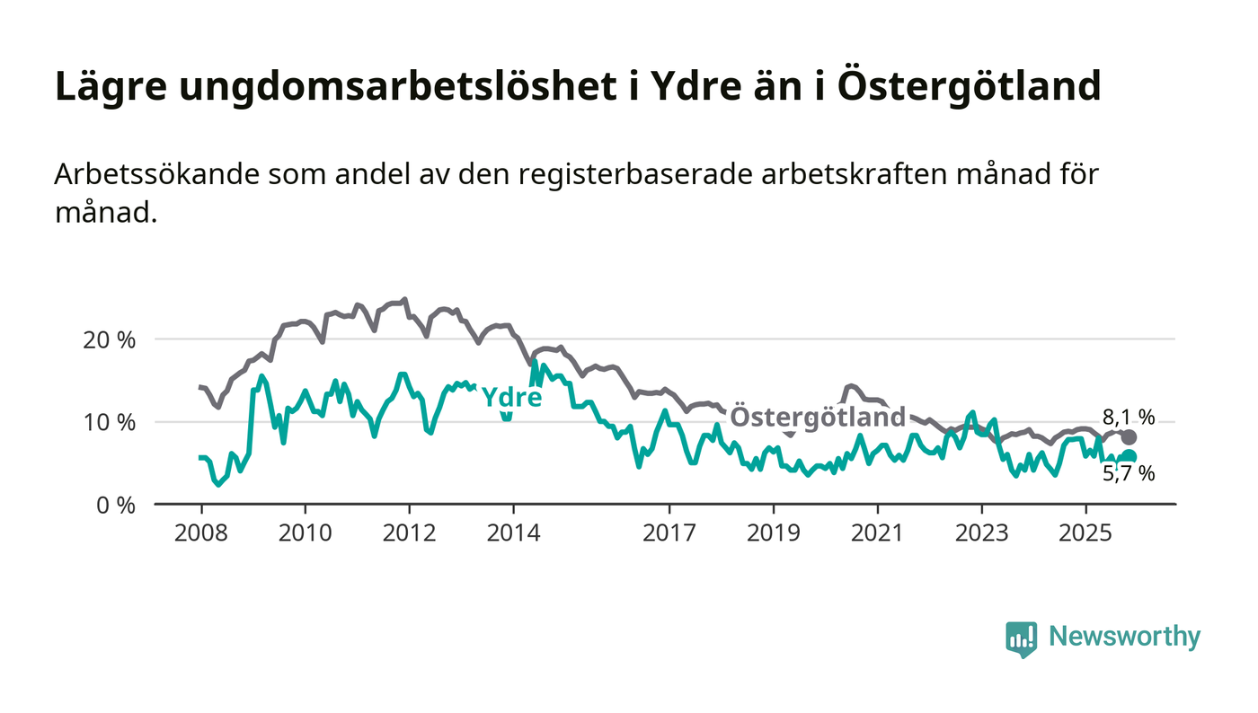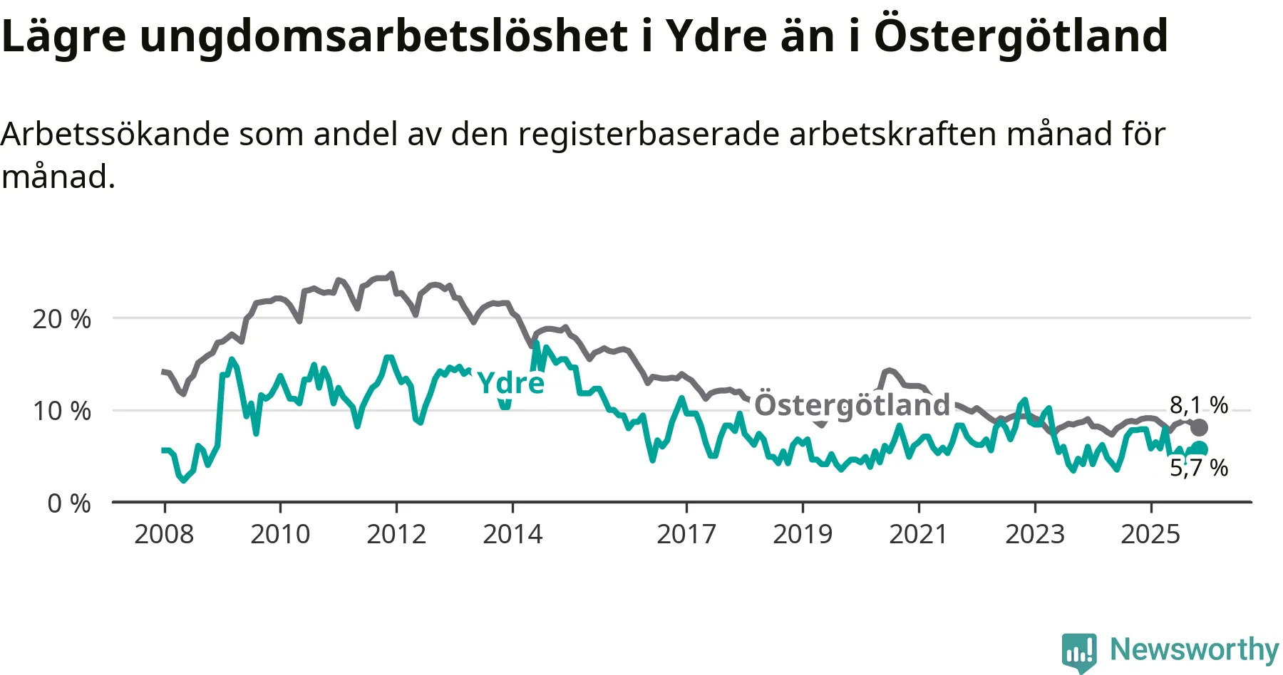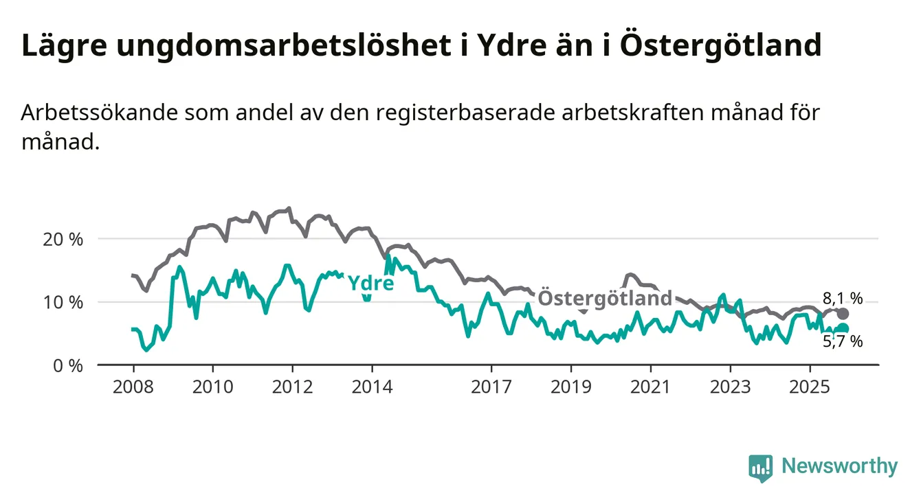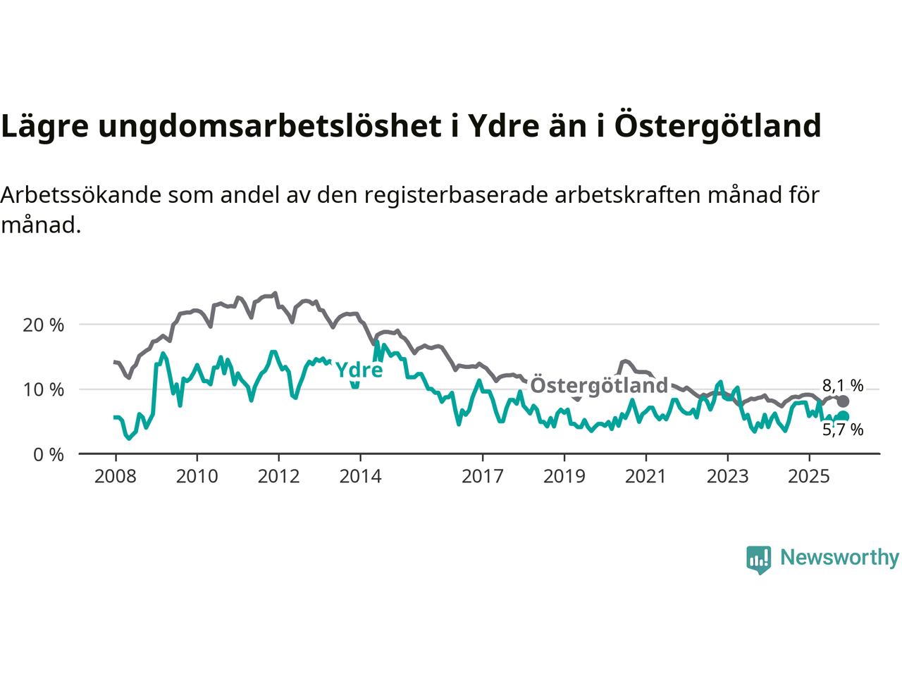 Precis som den totala arbetslösheten ligger ungdomsarbetslösheten i Ydre lägre än i Östergötland som helhet. Skillnaden mellan kommunen och länet är 2,4 procentenheter.