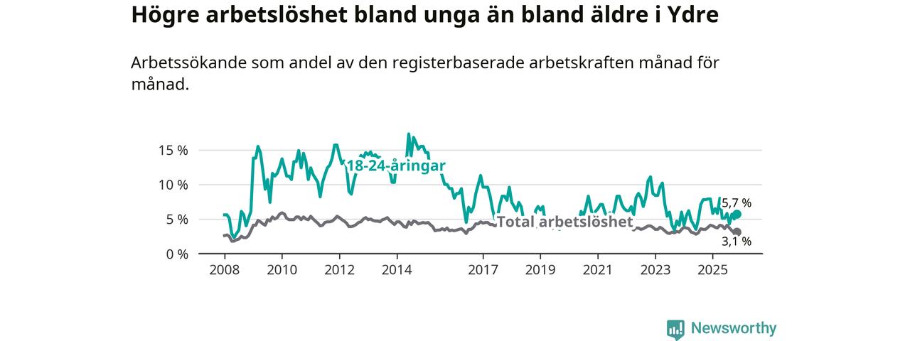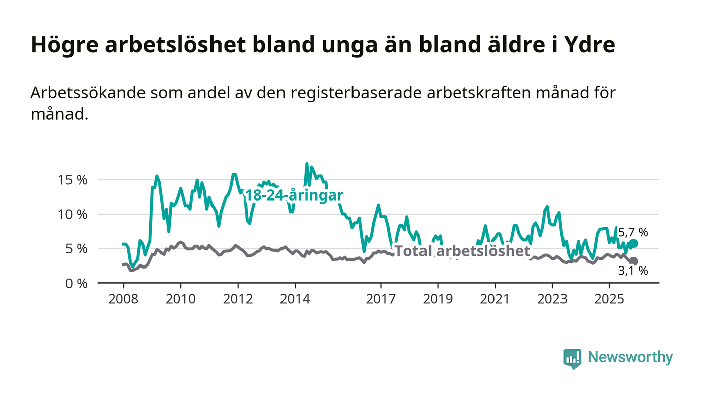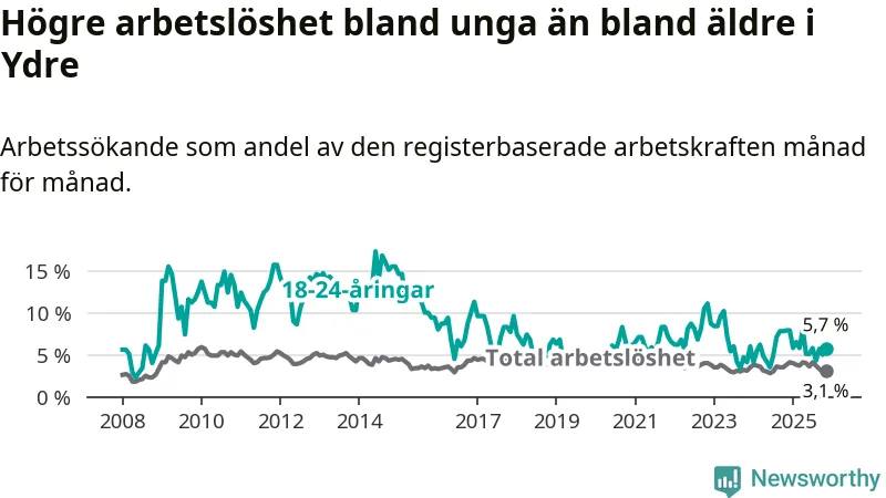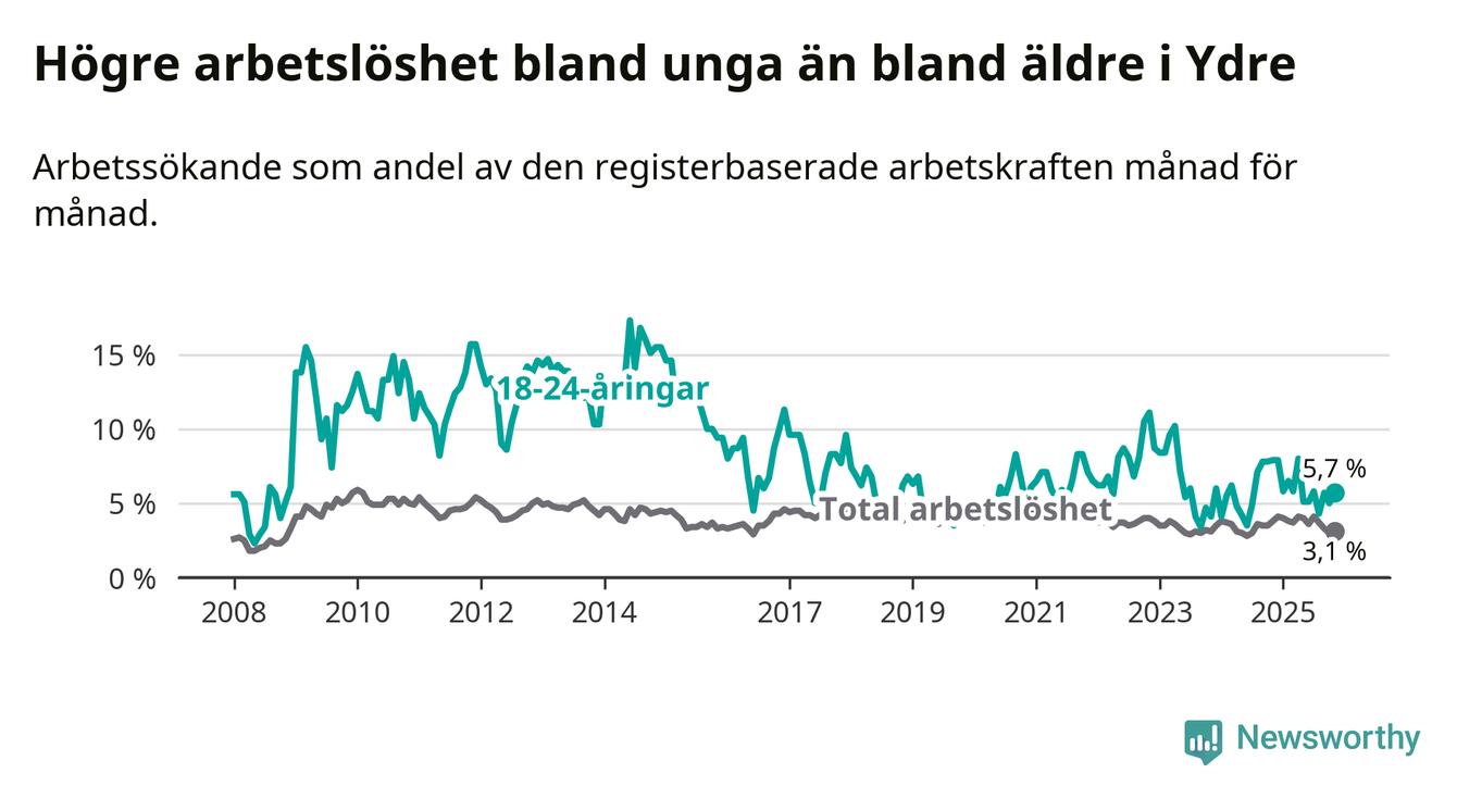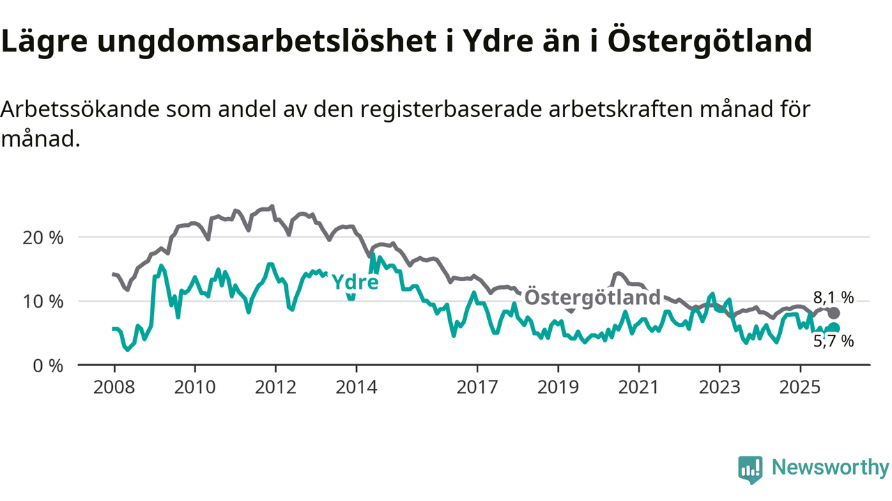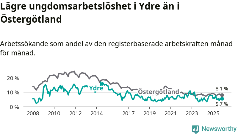 Precis som den totala arbetslösheten ligger ungdomsarbetslösheten i Ydre lägre än i Östergötland som helhet. Skillnaden mellan kommunen och länet är 2,4 procentenheter.