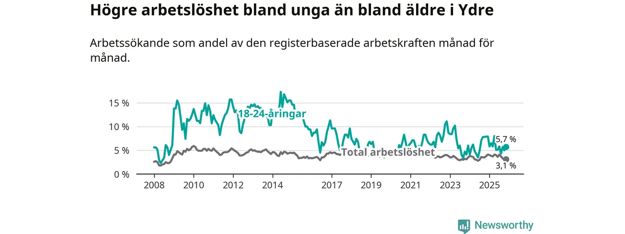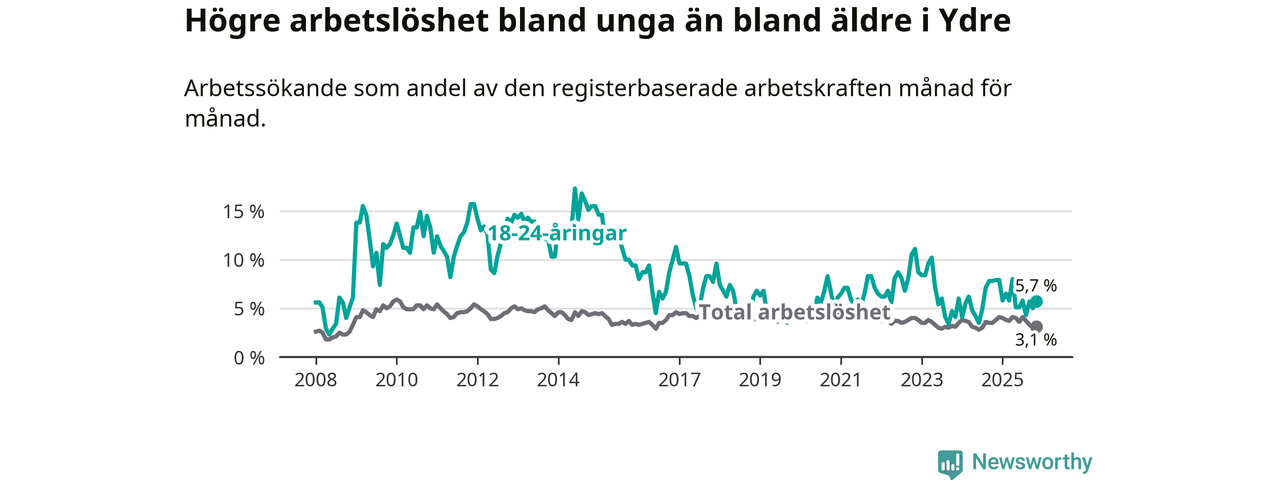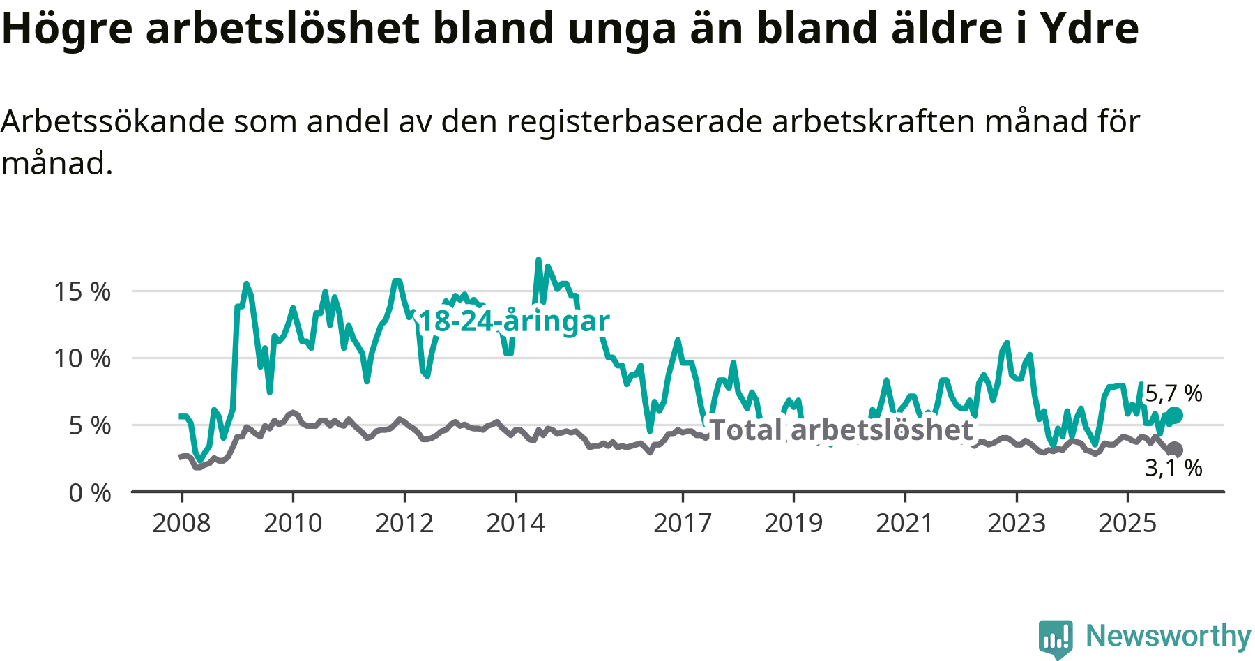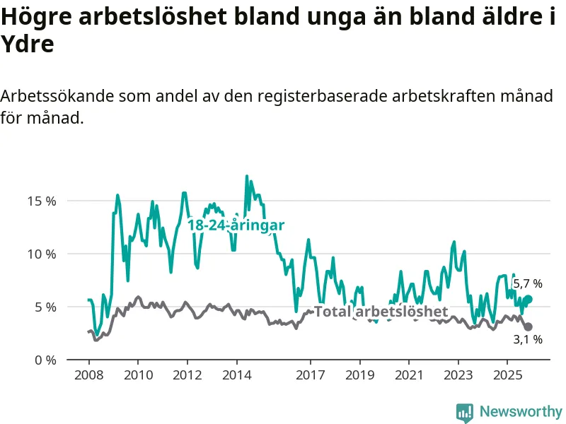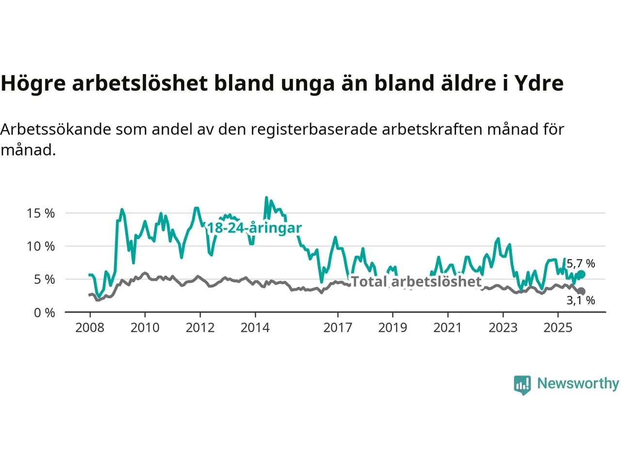 Precis som den totala arbetslösheten ligger ungdomsarbetslösheten i Ydre lägre än i Östergötland som helhet. Skillnaden mellan kommunen och länet är 2,4 procentenheter.