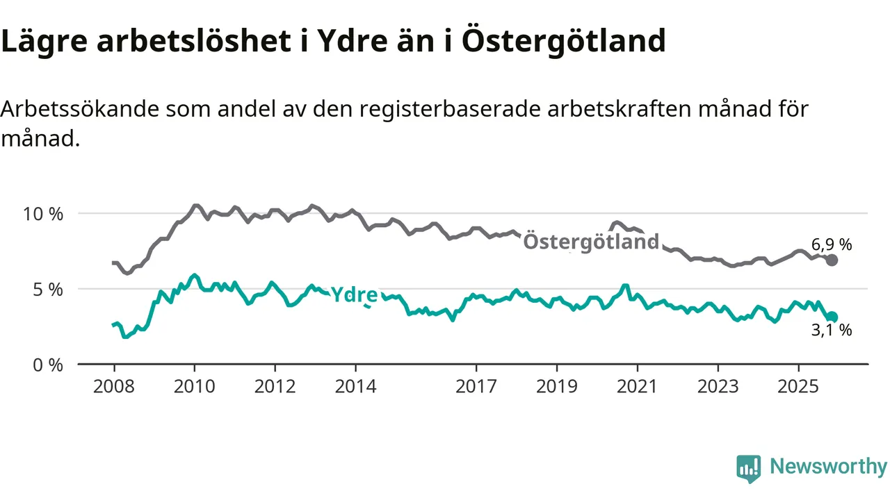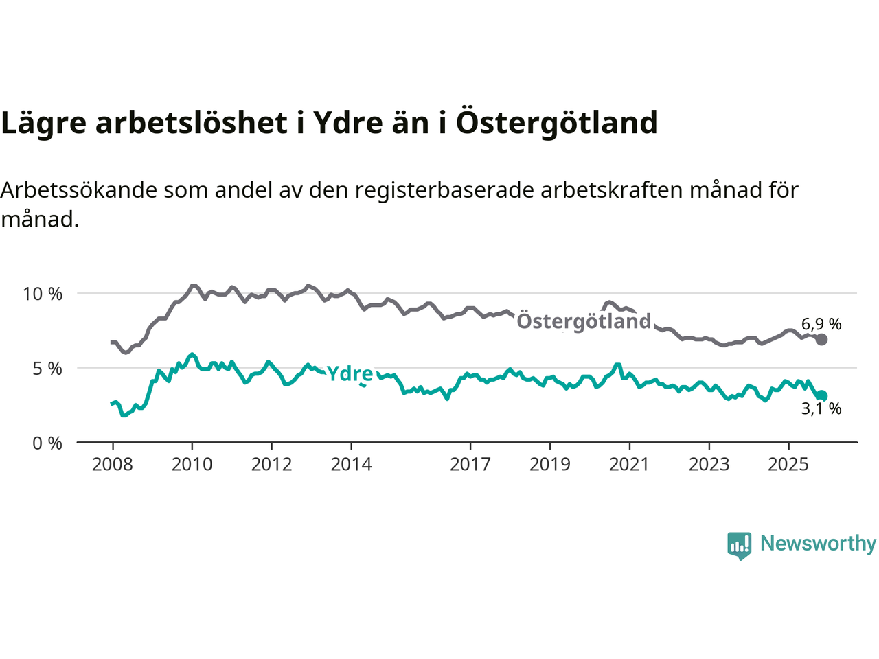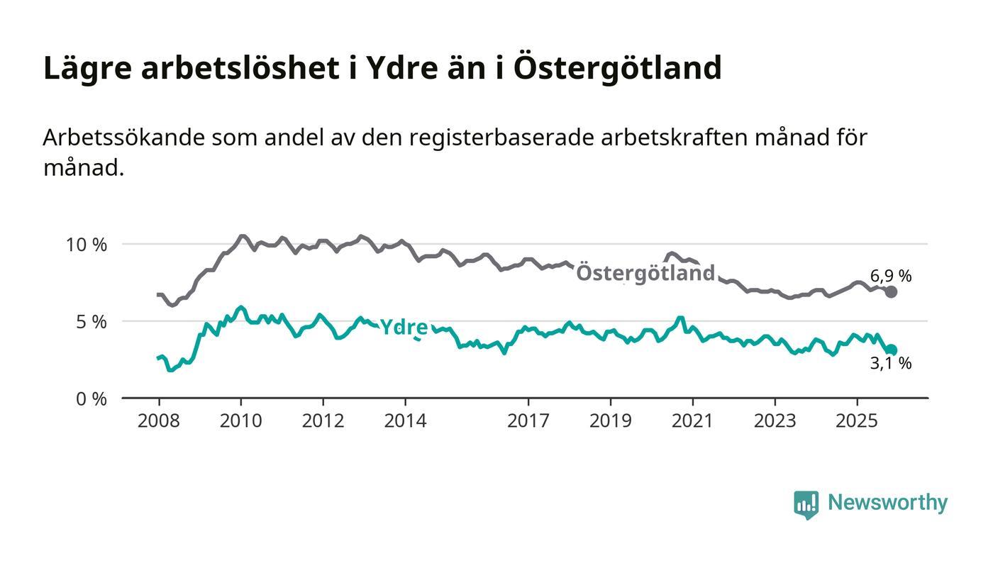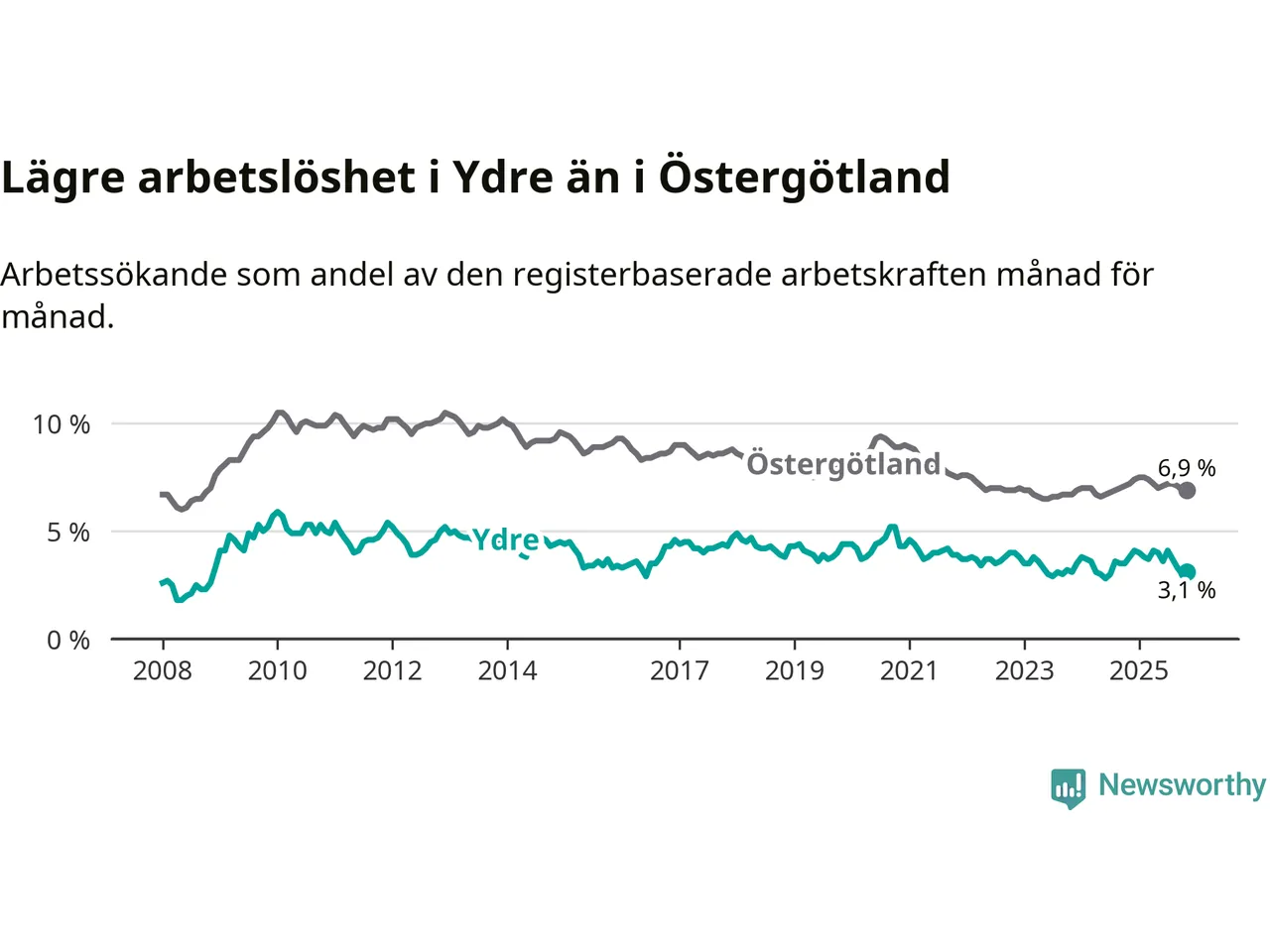 Under november månad rapporterade Ydre kommun en total arbetslöshet på 3,1 procent. Det är en minskning jämfört med samma tidpunkt i fjol (−0,7 procentenheter). Även i Östergötlands län sjunker arbetslösheten .