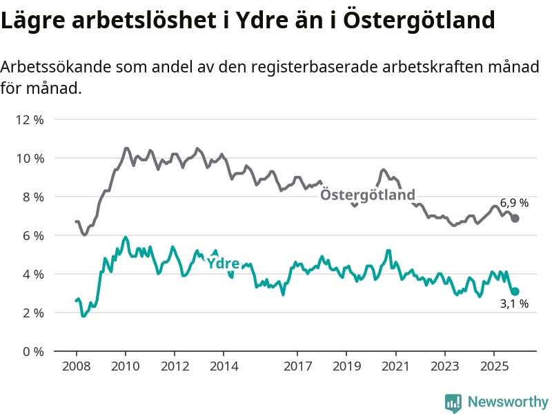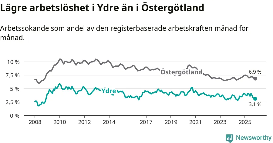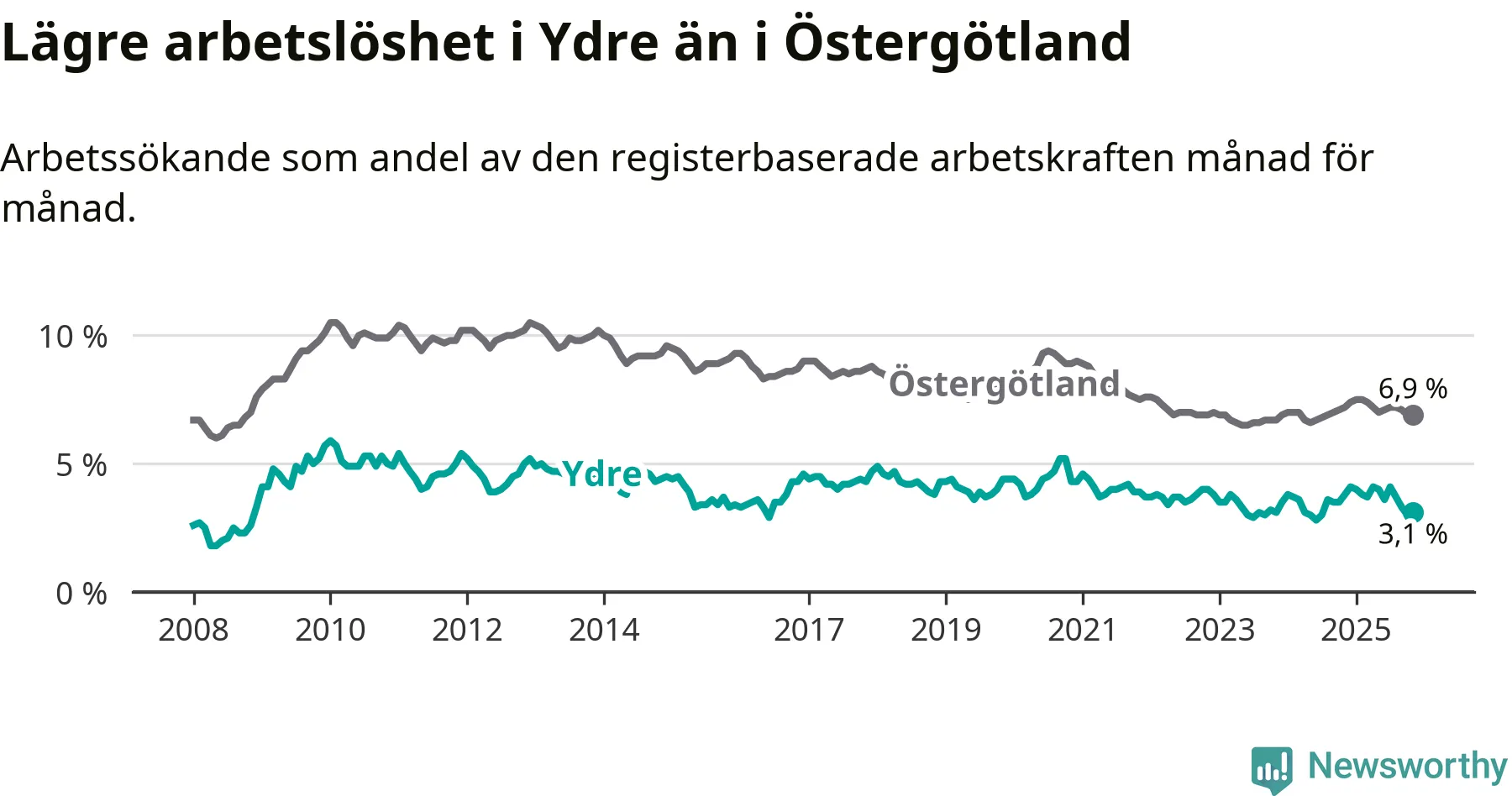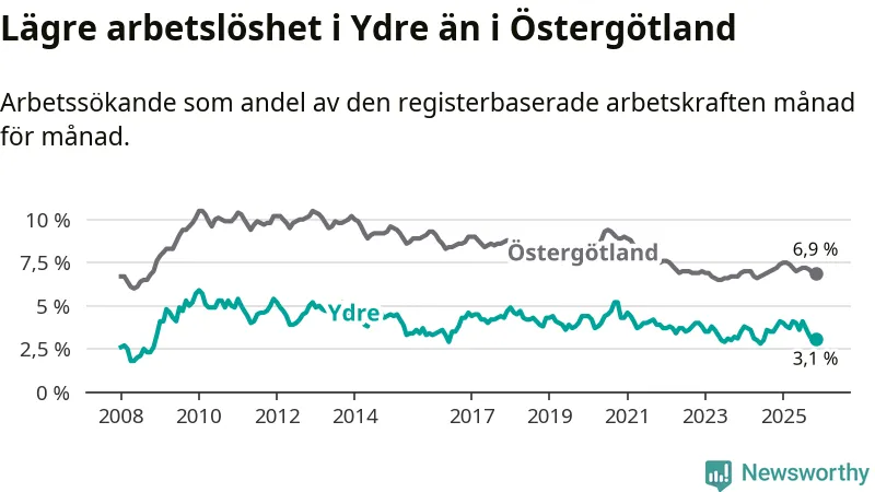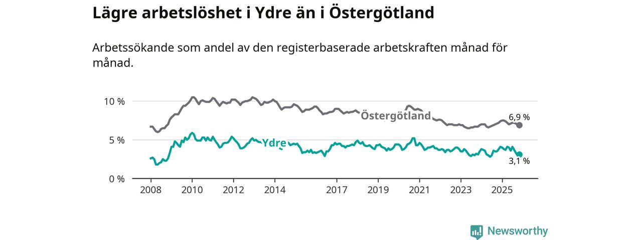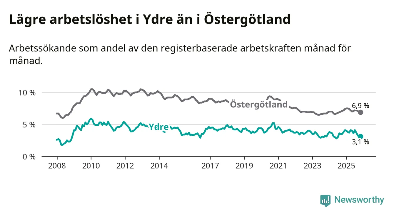 Under november månad rapporterade Ydre kommun en total arbetslöshet på 3,1 procent. Det är en minskning jämfört med samma tidpunkt i fjol (−0,7 procentenheter). Även i Östergötlands län sjunker arbetslösheten .