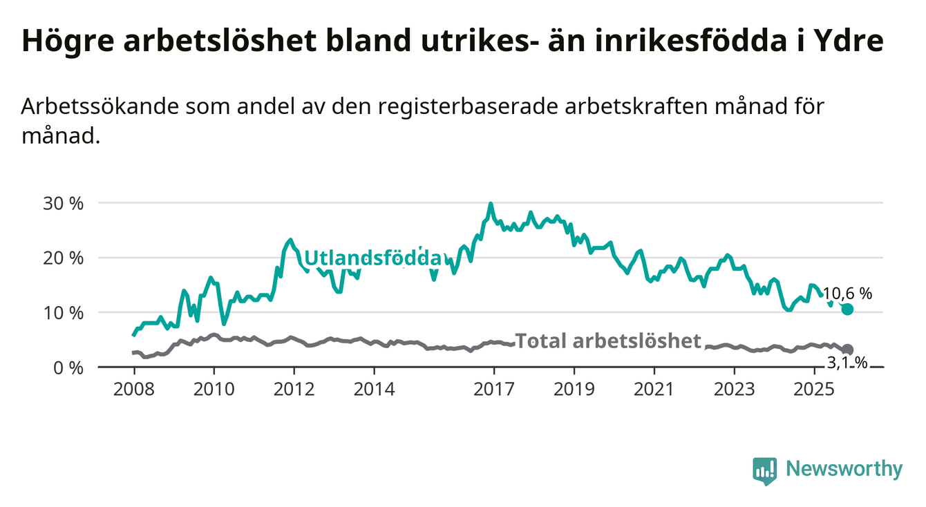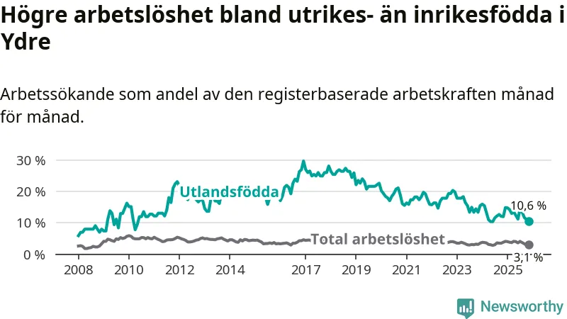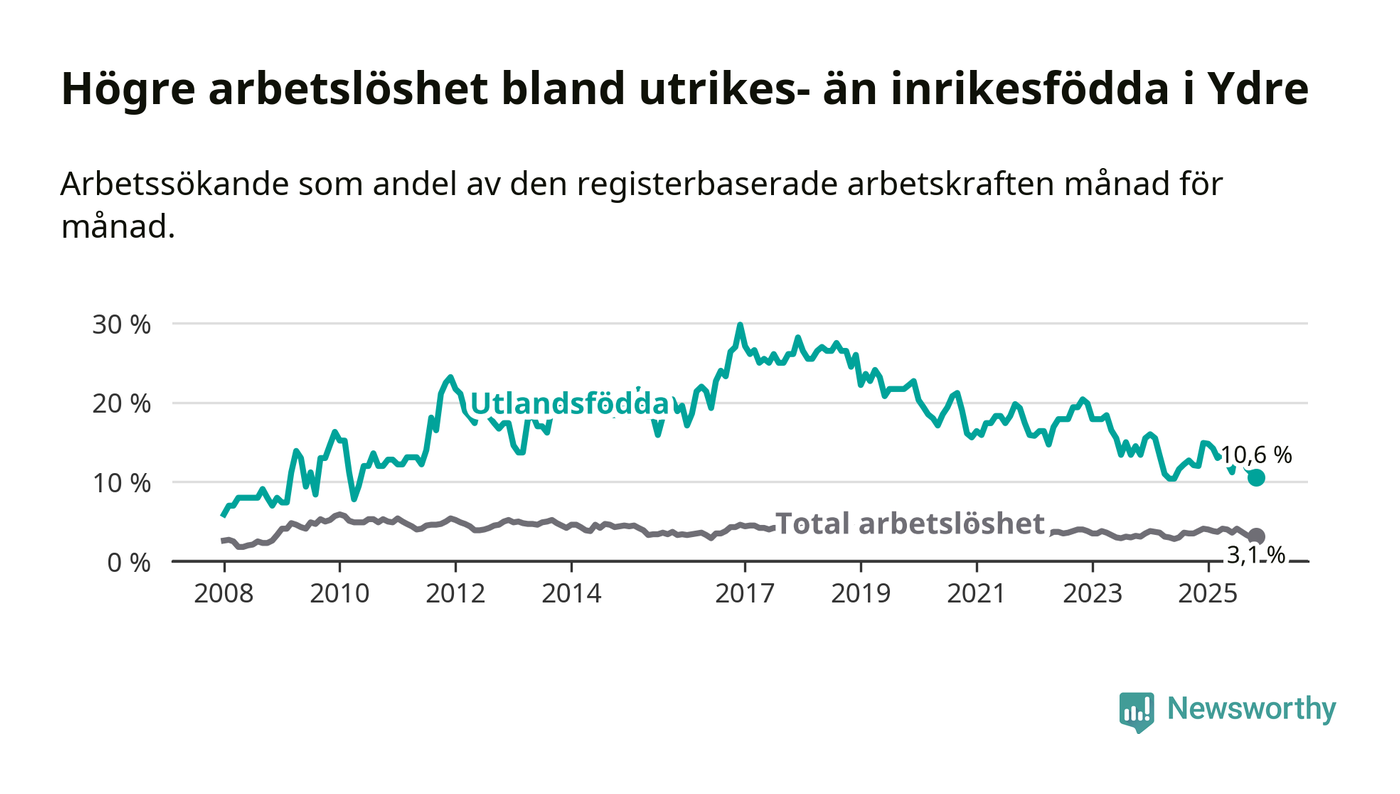 Skillnaden i arbetslöshet mellan utrikesfödda och hela befolkningen är 7,5 procentenheter i Ydre. Det är en mindre skillnad än för ett år sedan (−0,7 procentenheter).