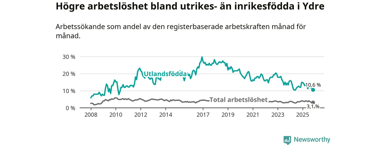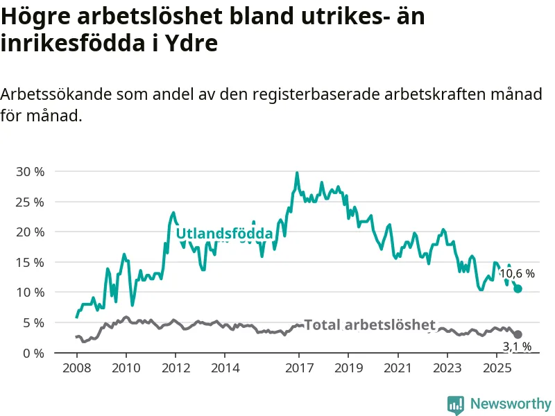 Arbetslösheten bland utlandsfödda var 10,6 procent i Ydre under november månad, motsvarande 19 av 179 personer. Det är 1,4 procentenheter färre än vid samma tidpunkt i fjol (−2 om man räknar personer).