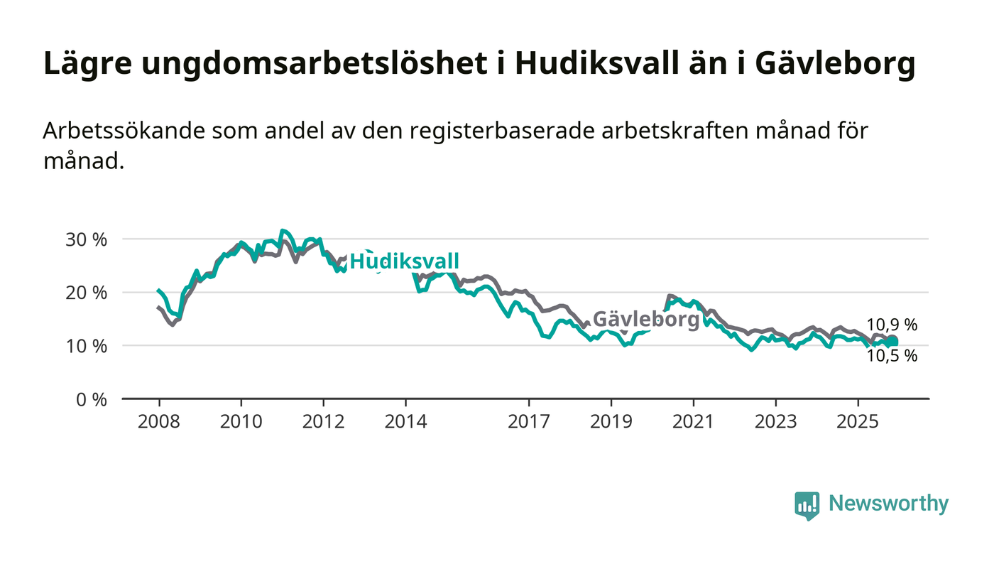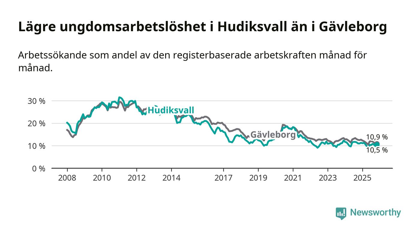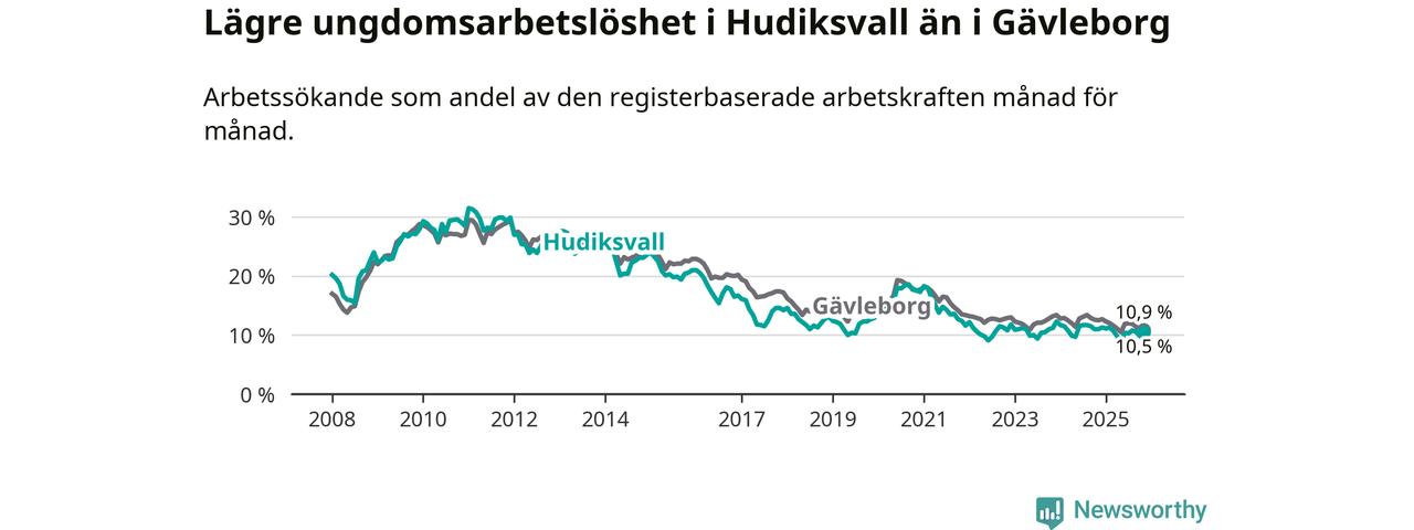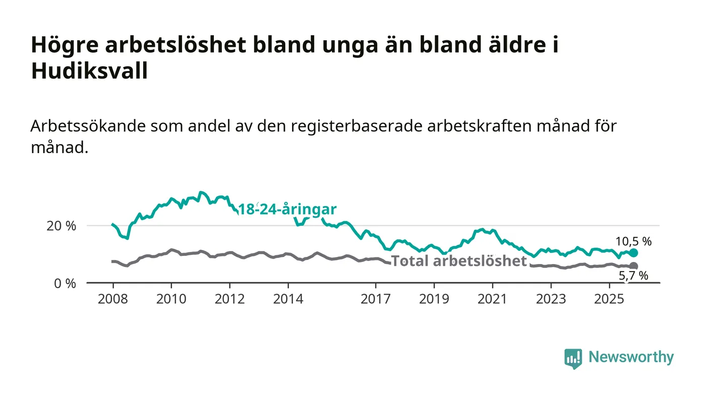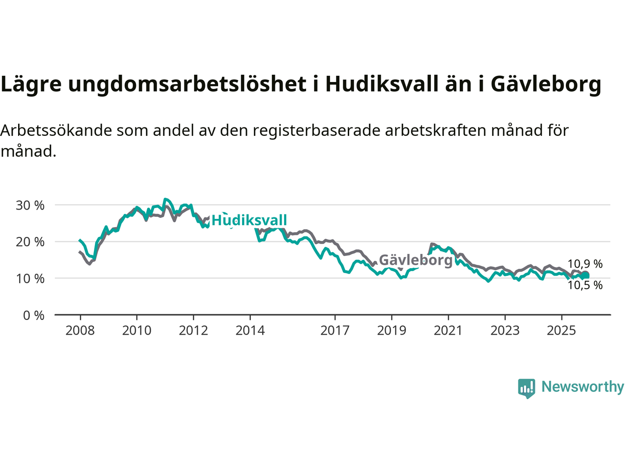 I och med den senaste månadens nedgång har de ungas arbetslöshet i Hudiksvall sjunkit 13 månader i följd (ner från 11,0 procent i oktober 2024 till 10,5 procent nu).