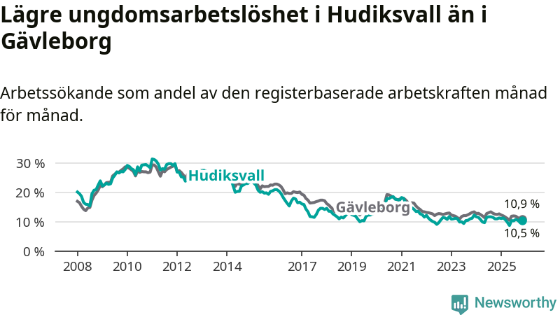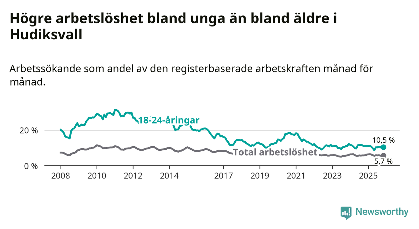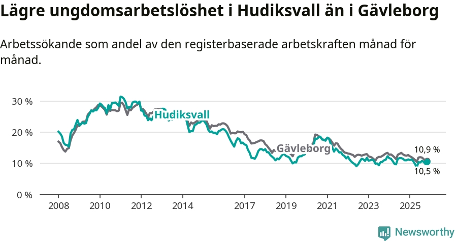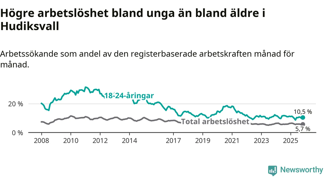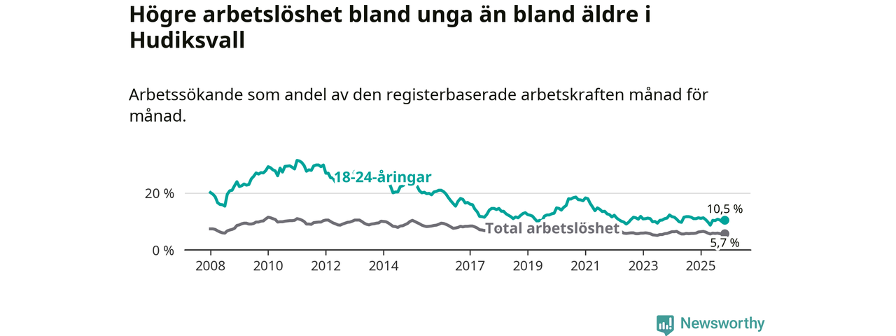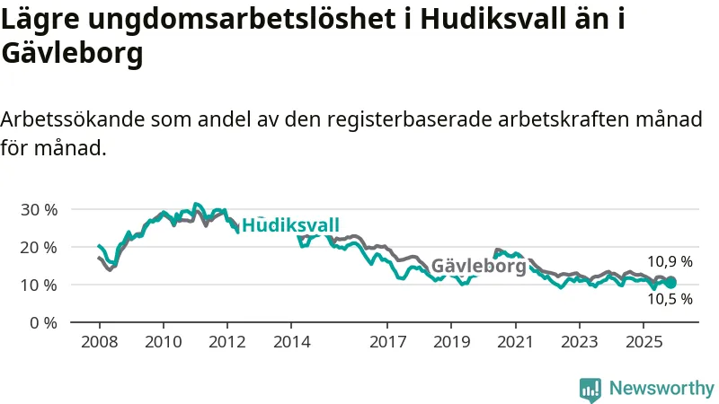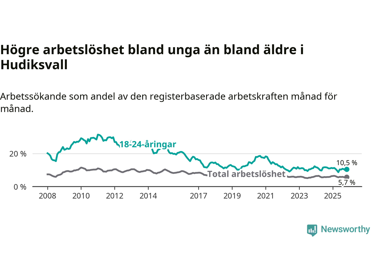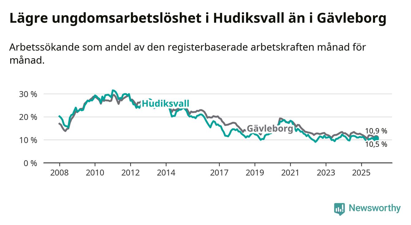 I och med den senaste månadens nedgång har de ungas arbetslöshet i Hudiksvall sjunkit 13 månader i följd (ner från 11,0 procent i oktober 2024 till 10,5 procent nu).