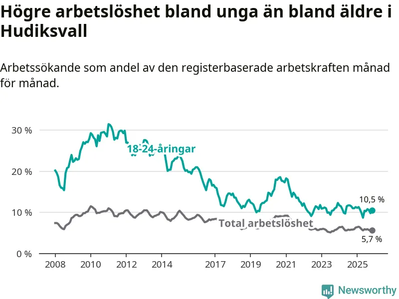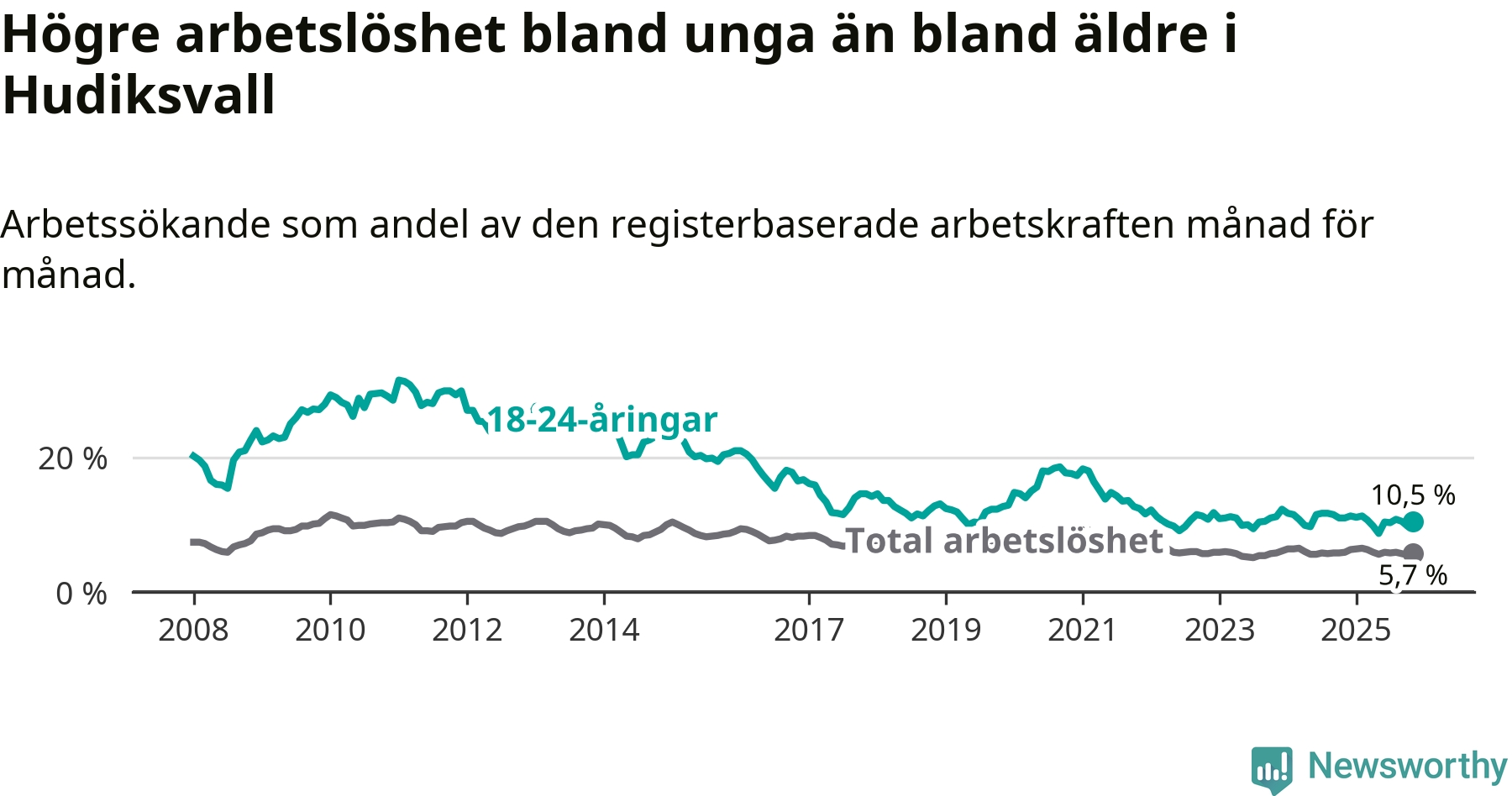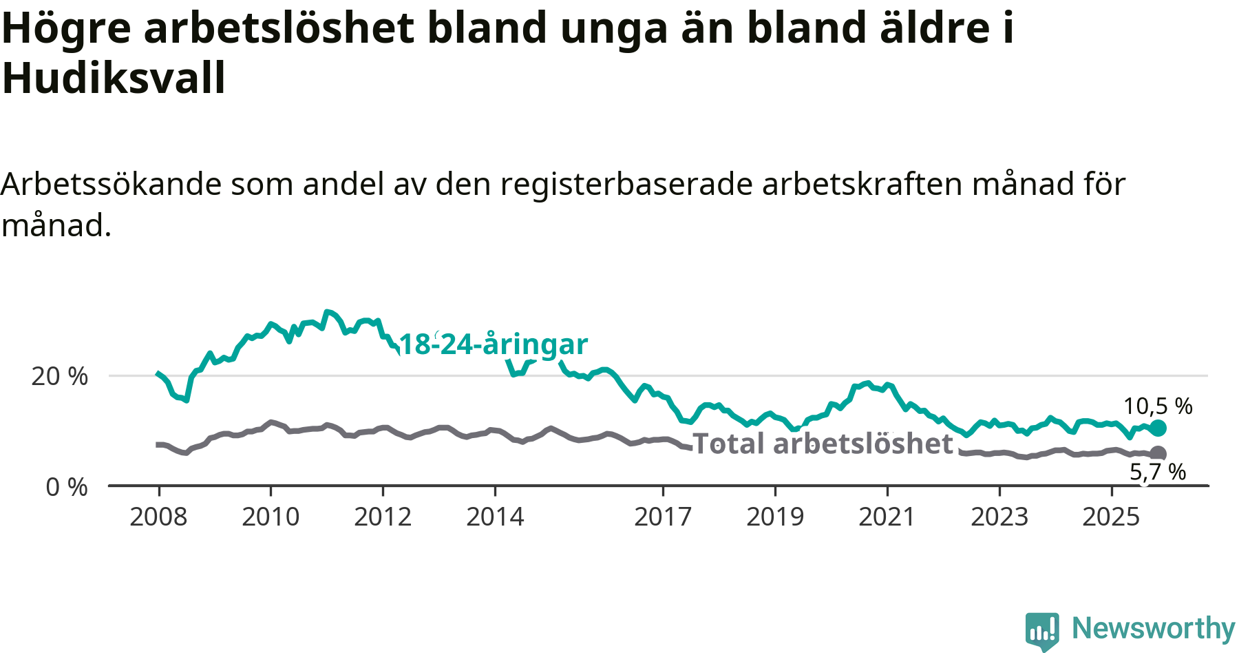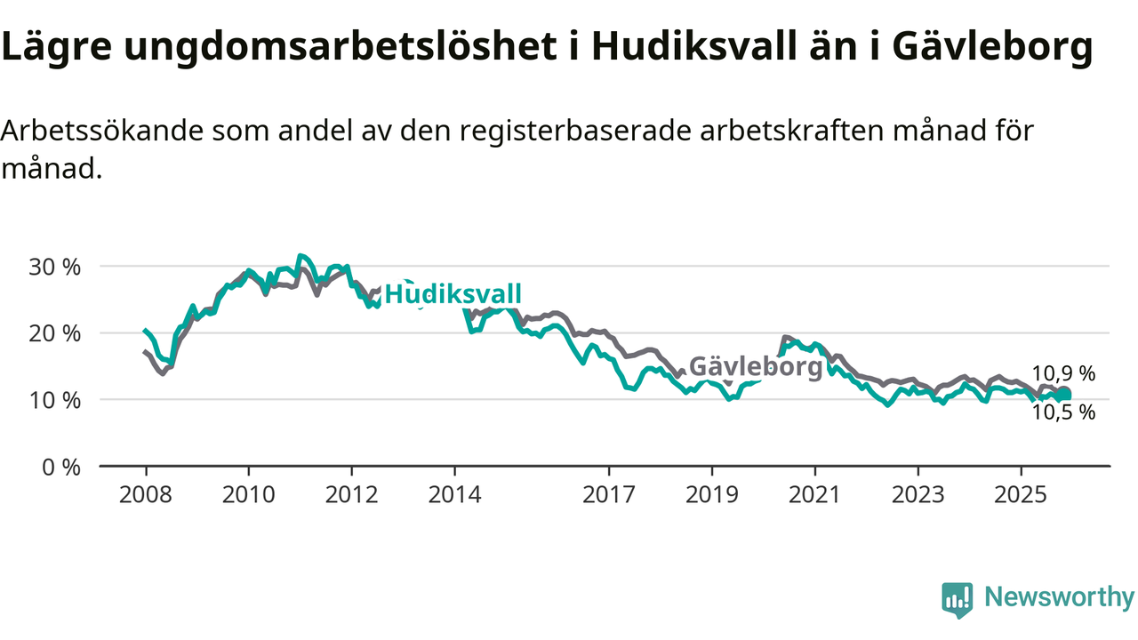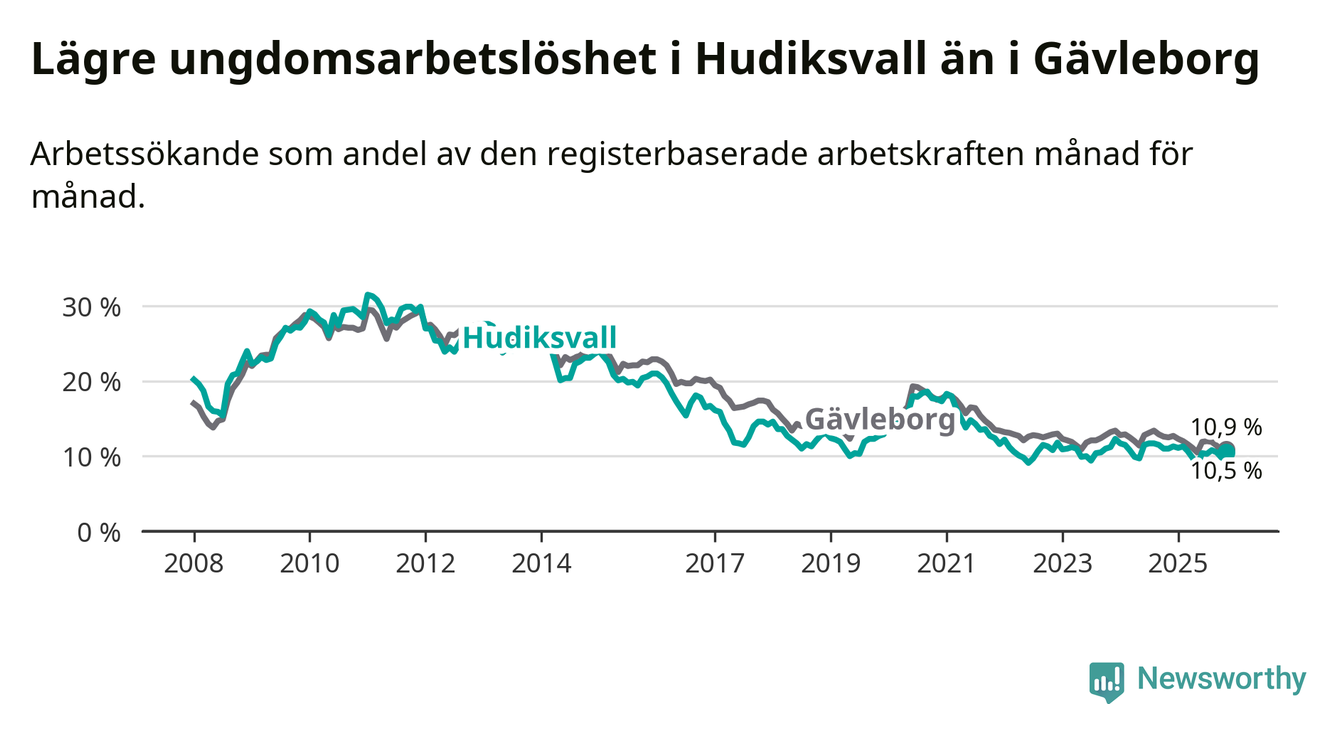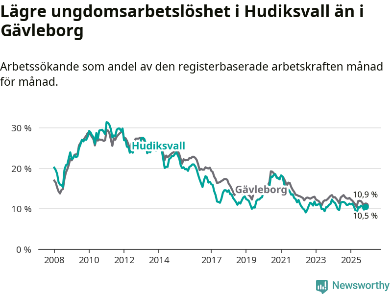 I och med den senaste månadens nedgång har de ungas arbetslöshet i Hudiksvall sjunkit 13 månader i följd (ner från 11,0 procent i oktober 2024 till 10,5 procent nu).