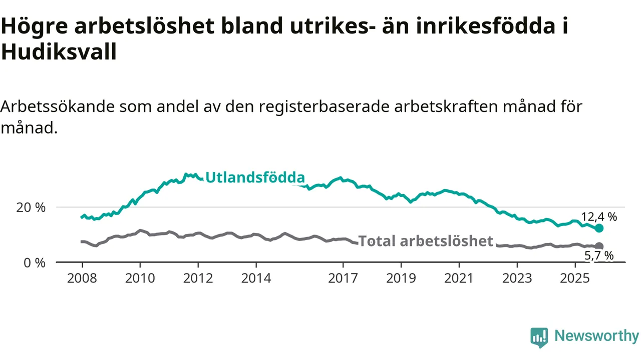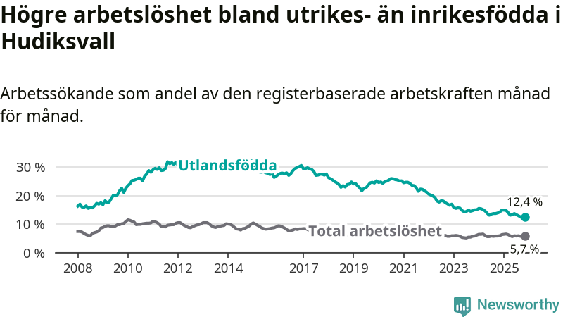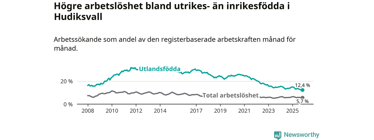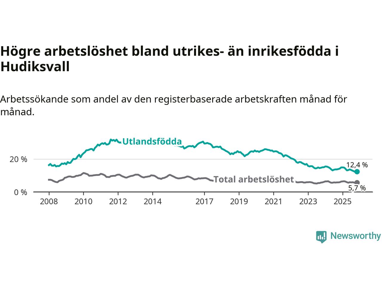 Arbetslösheten bland utlandsfödda var 12,4 procent i Hudiksvall under november månad, motsvarande 286 av 2 306 personer. Det är 1,8 procentenheter färre än vid samma tidpunkt i fjol (−38 om man räknar personer).