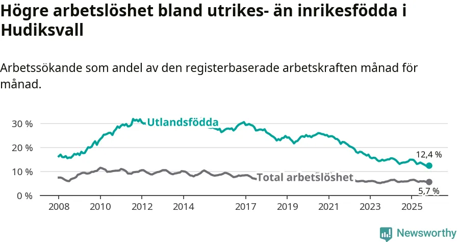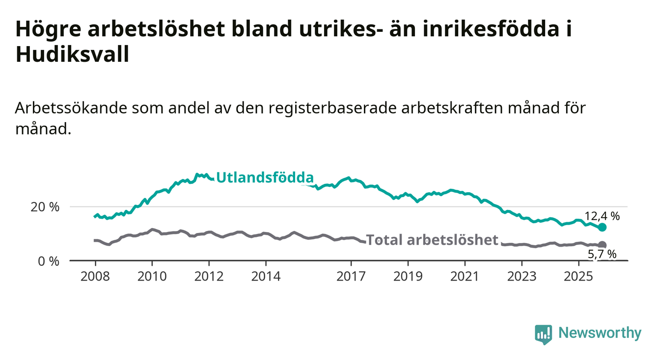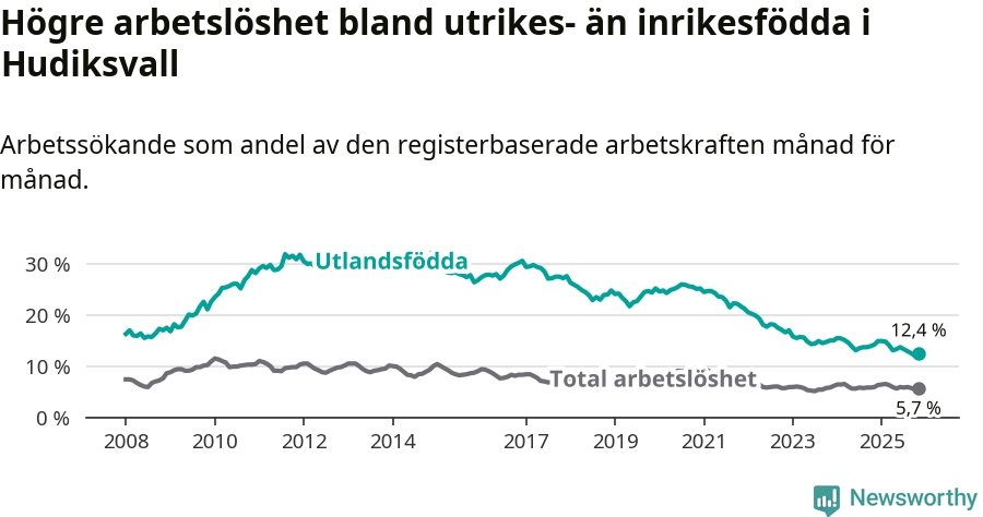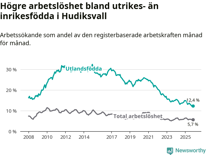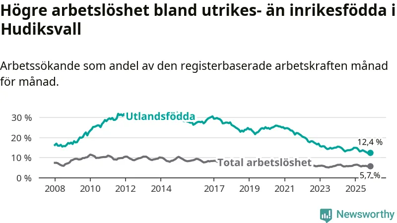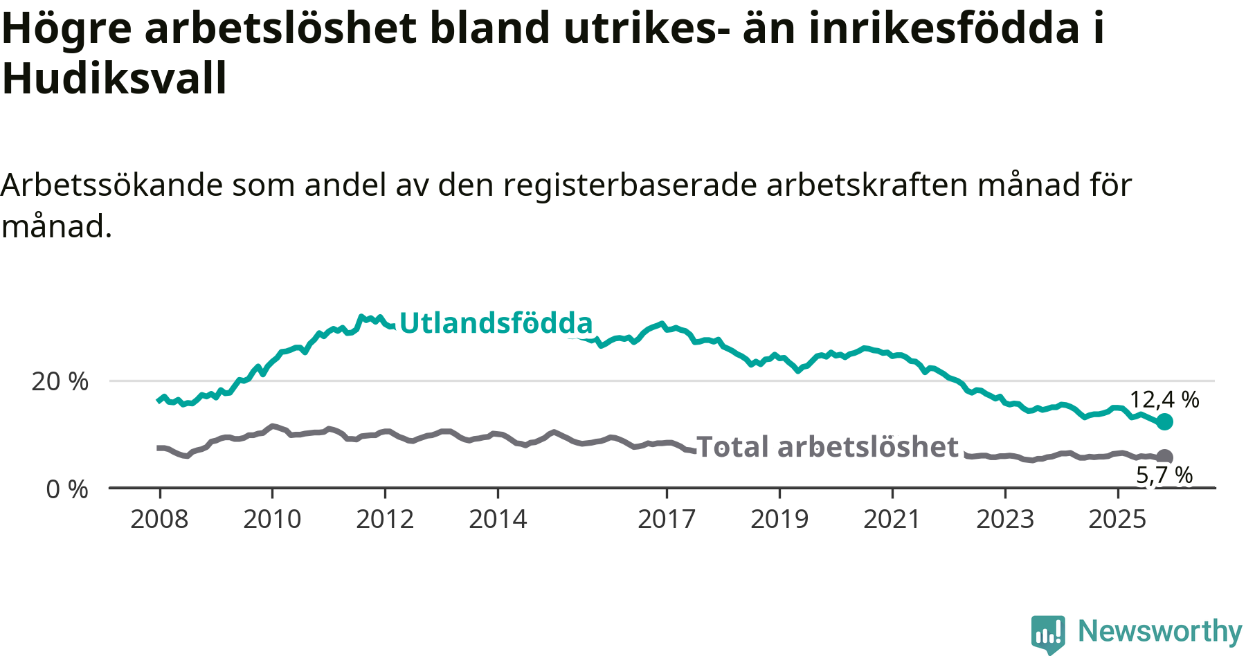 Arbetslösheten bland utlandsfödda var 12,4 procent i Hudiksvall under november månad, motsvarande 286 av 2 306 personer. Det är 1,8 procentenheter färre än vid samma tidpunkt i fjol (−38 om man räknar personer).