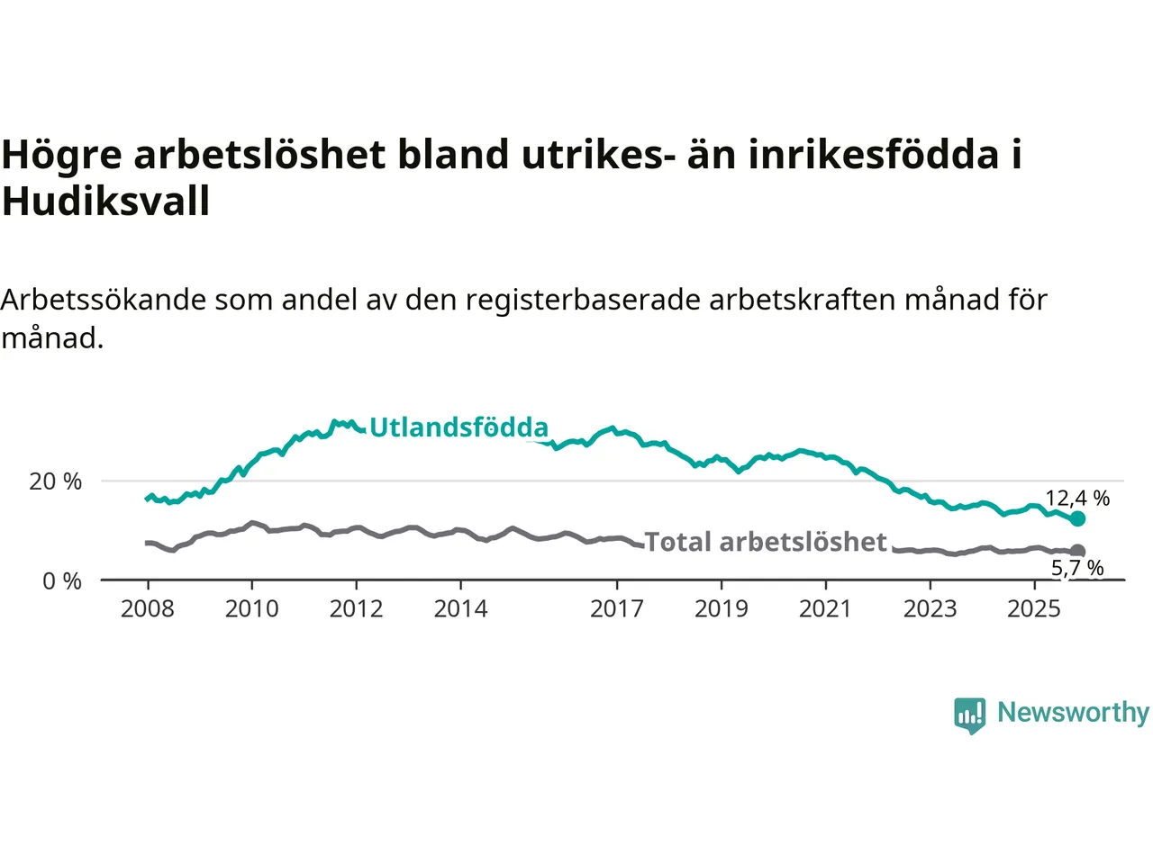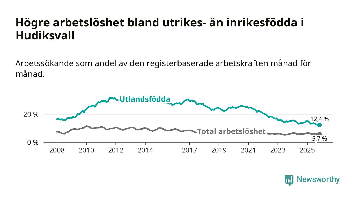 Skillnaden i arbetslöshet mellan utrikesfödda och hela befolkningen är 6,7 procentenheter i Hudiksvall. Det är en betydligt mindre skillnad än för ett år sedan (−1,6 procentenheter).