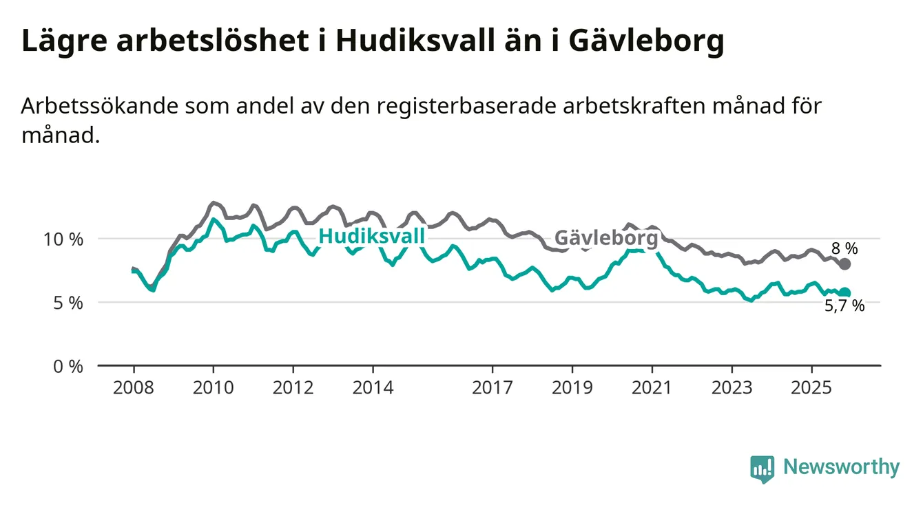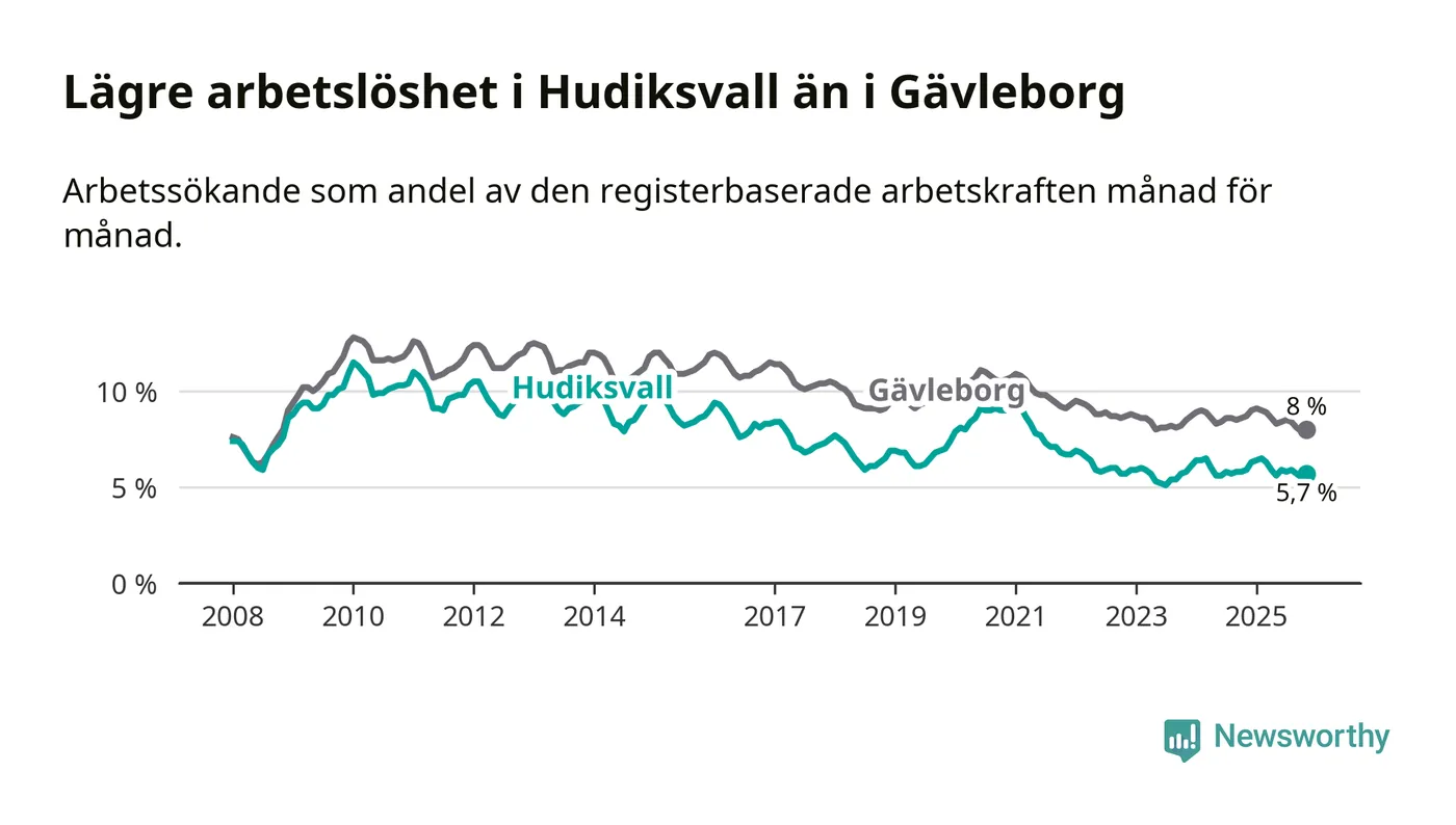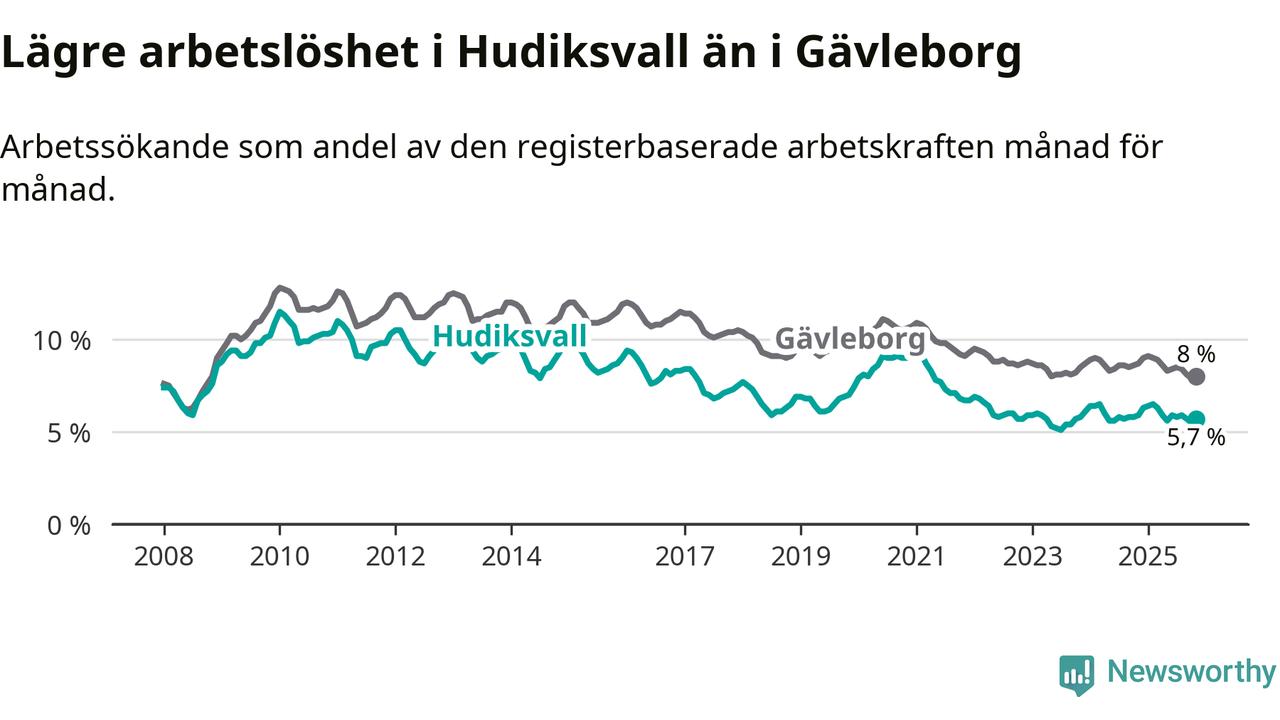 Hudiksvall hade redan tidigare lägre arbetslöshet än snittet i hela Gävleborgs län och nu växer klyftan (5,7 procent i kommunen, jämfört med 8,0 procent i hela länet). Hudiksvall har därmed även den lägsta arbetslöshetsnivån i länet. Söderhamn har den högsta (9,0 procent).