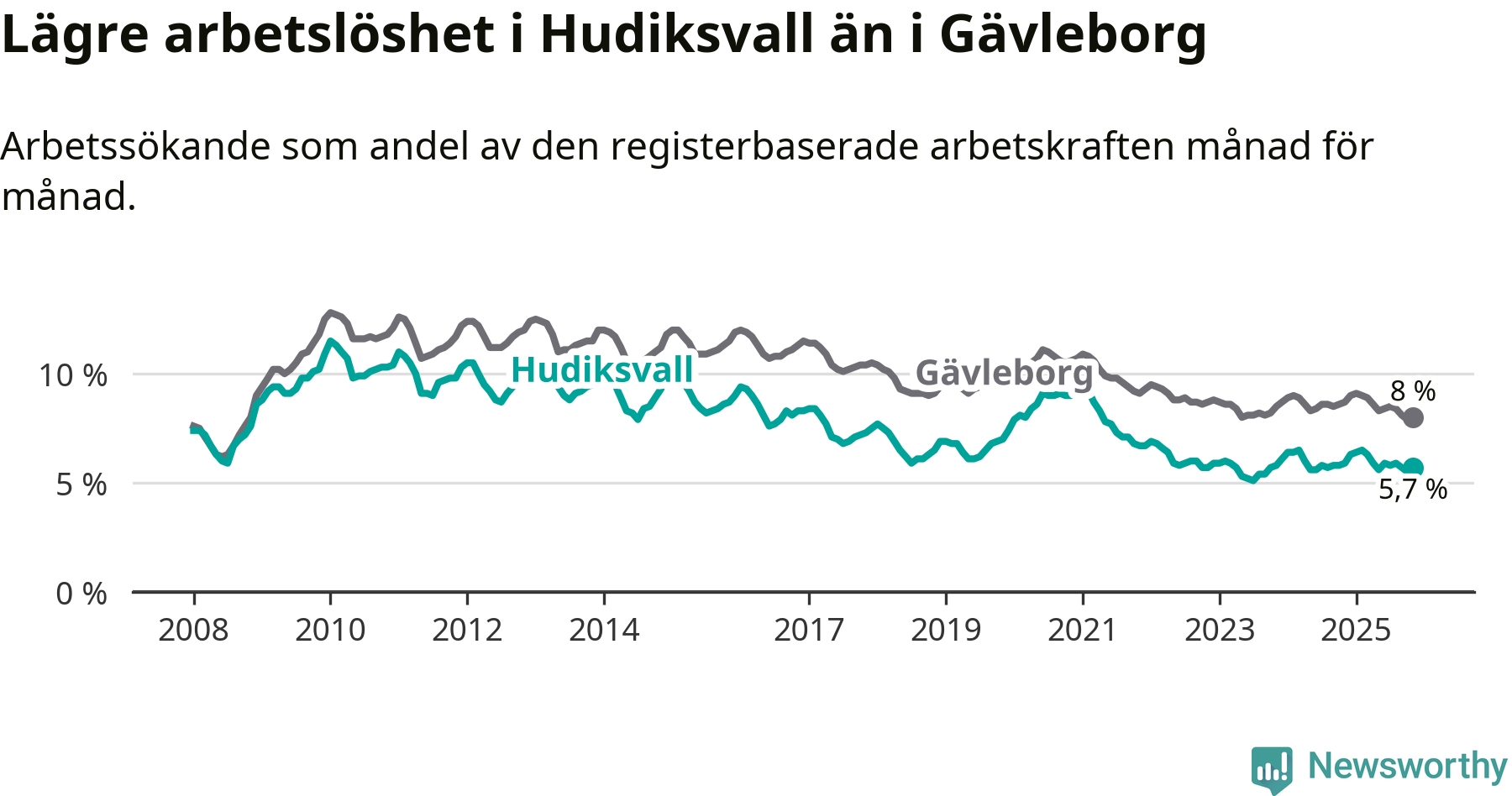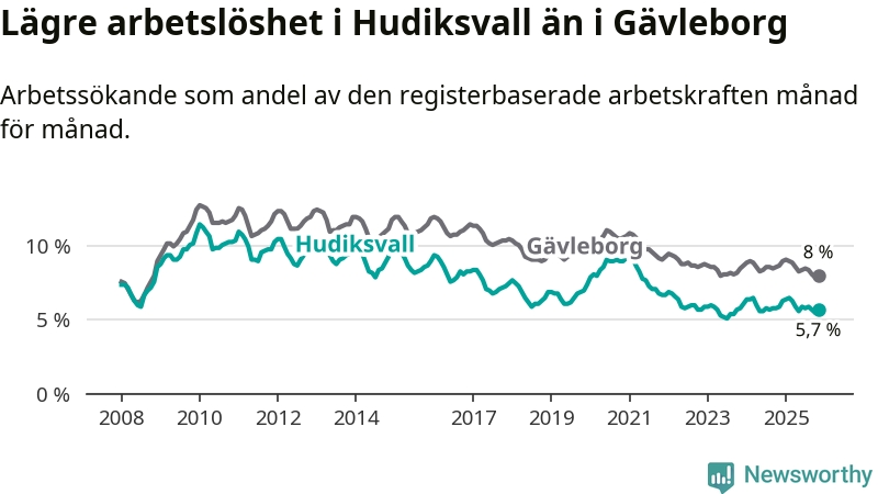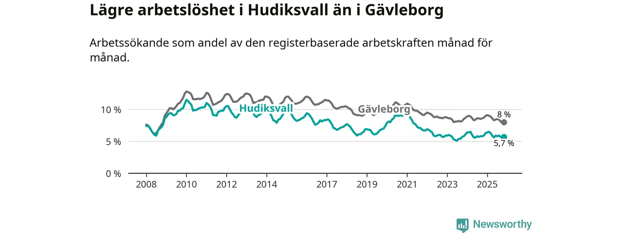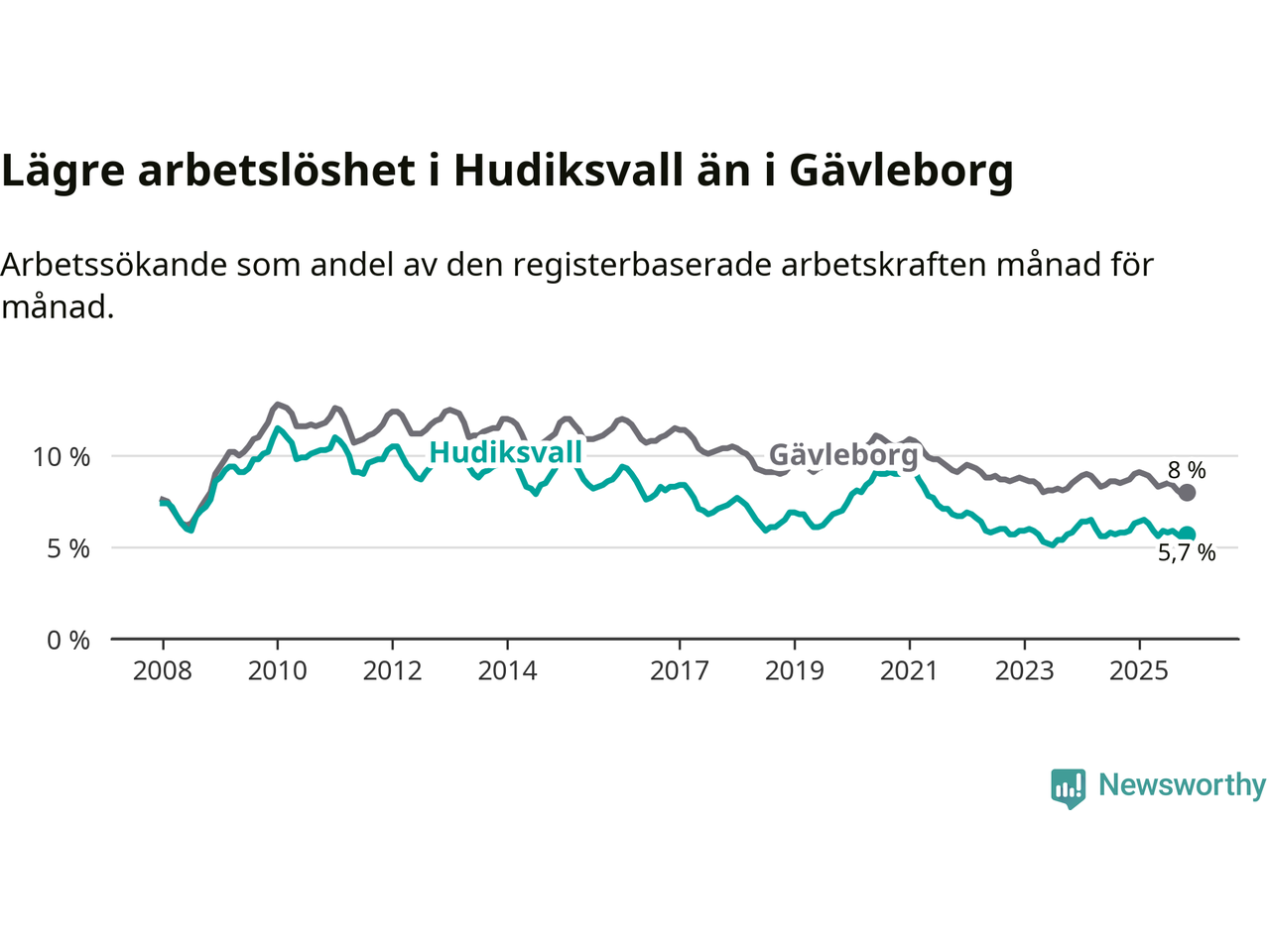 Hudiksvall hade redan tidigare lägre arbetslöshet än snittet i hela Gävleborgs län och nu växer klyftan (5,7 procent i kommunen, jämfört med 8,0 procent i hela länet). Hudiksvall har därmed även den lägsta arbetslöshetsnivån i länet. Söderhamn har den högsta (9,0 procent).