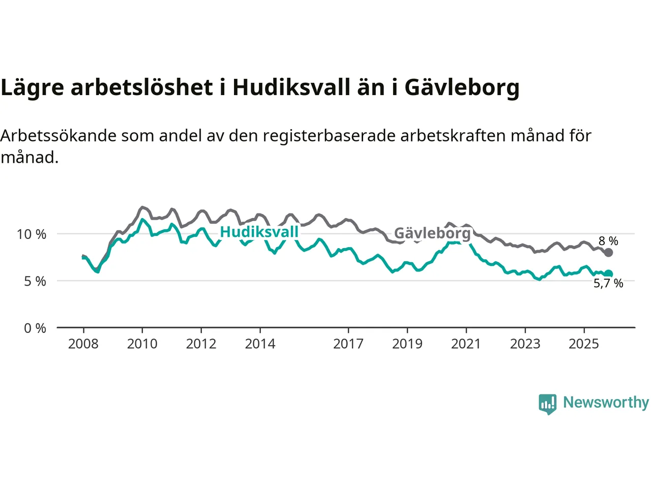 Under november månad rapporterade Hudiksvalls kommun en total arbetslöshet på 5,7 procent. Det är en minskning jämfört med samma tidpunkt i fjol (−0,2 procentenheter). Även i Gävleborgs län sjunker arbetslösheten .