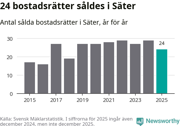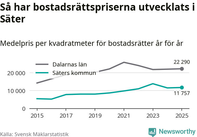 Det såldes totalt 24 bostadsrätter i Säters kommun under året. Genomsnittspriset per kvadratmeter landade på 11 757 kronor. Det är en ökning med två procent i kommunen på ett år.