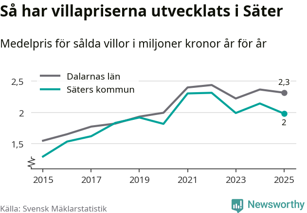 Två miljoner kronor är medelpriset för de villor som såldes i Säters kommun under året, eller 17 891 kronor per kvadratmeter. Det innebär en prisminskning med åtta procent på ett år.