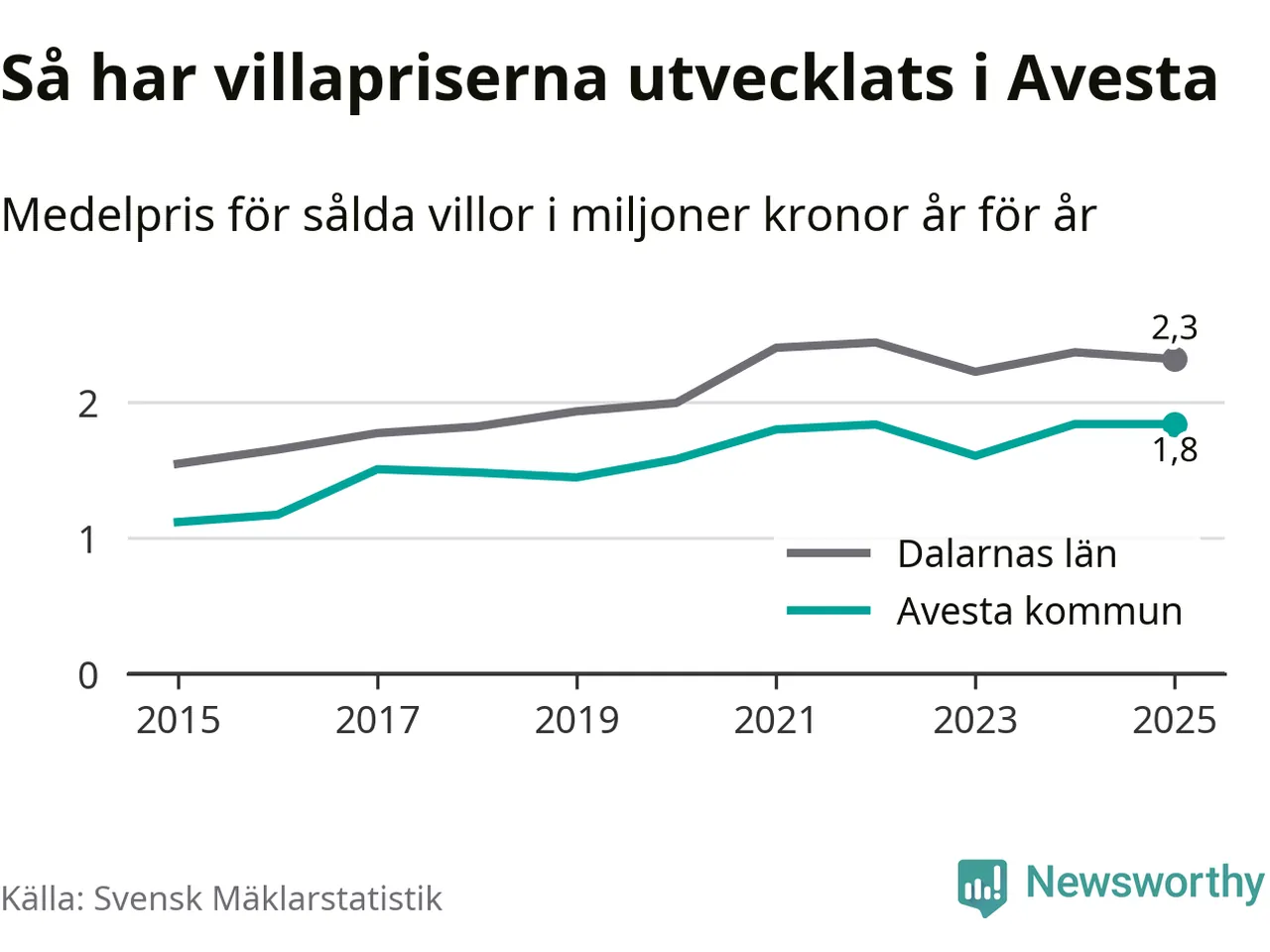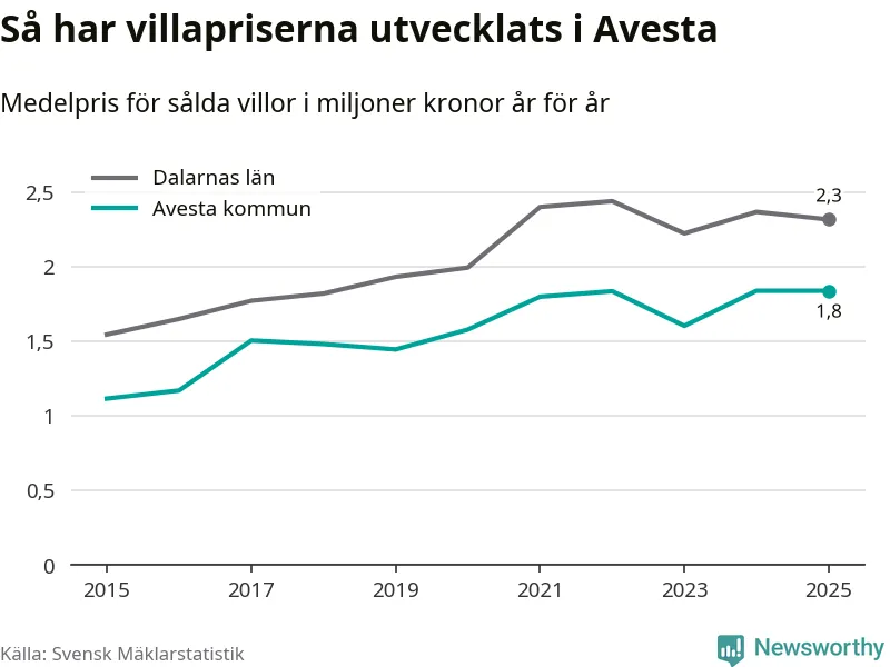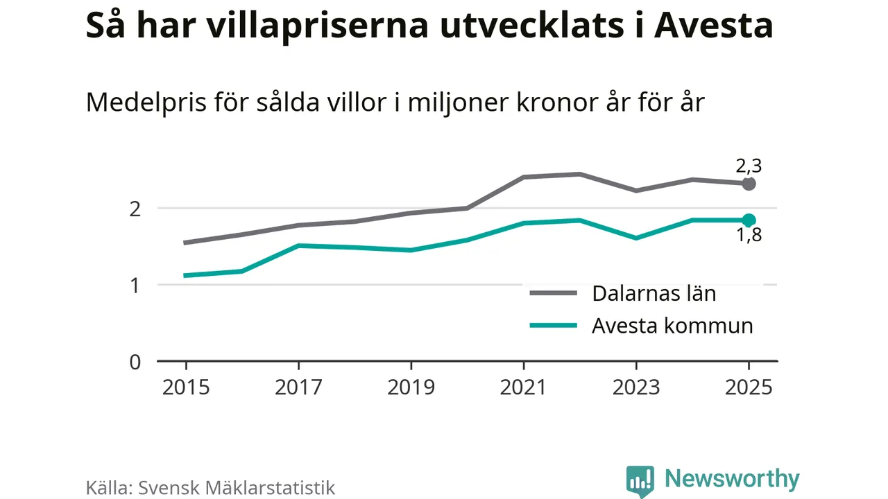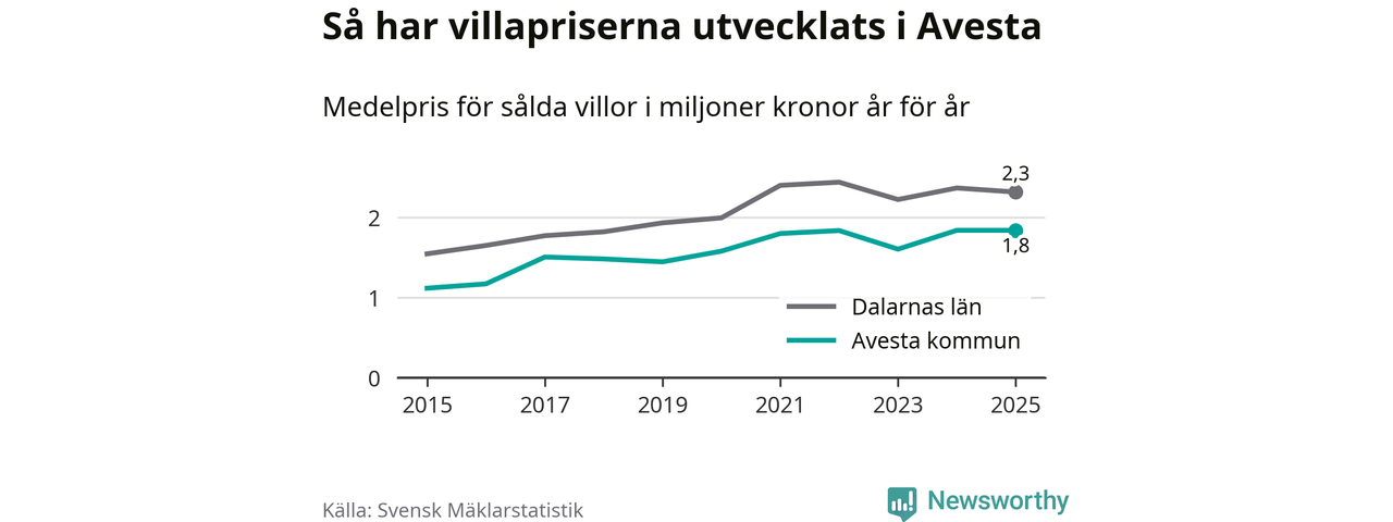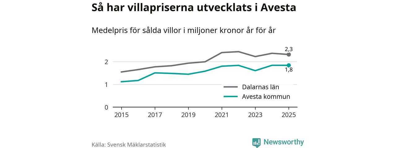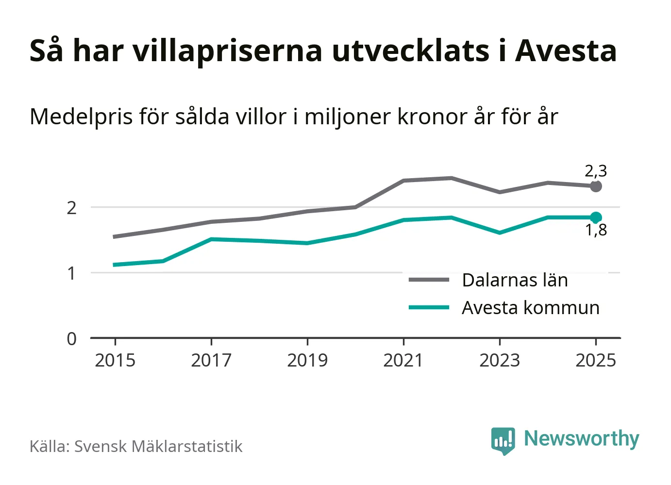 1,8 miljoner kronor är medelpriset för de villor som såldes i Avesta kommun under året, eller 15 560 kronor per kvadratmeter. Det innebär att priserna har legat i stort sett stilla sedan förra året.