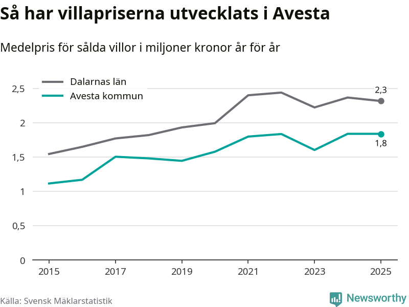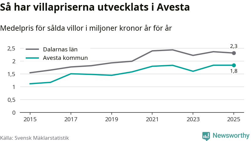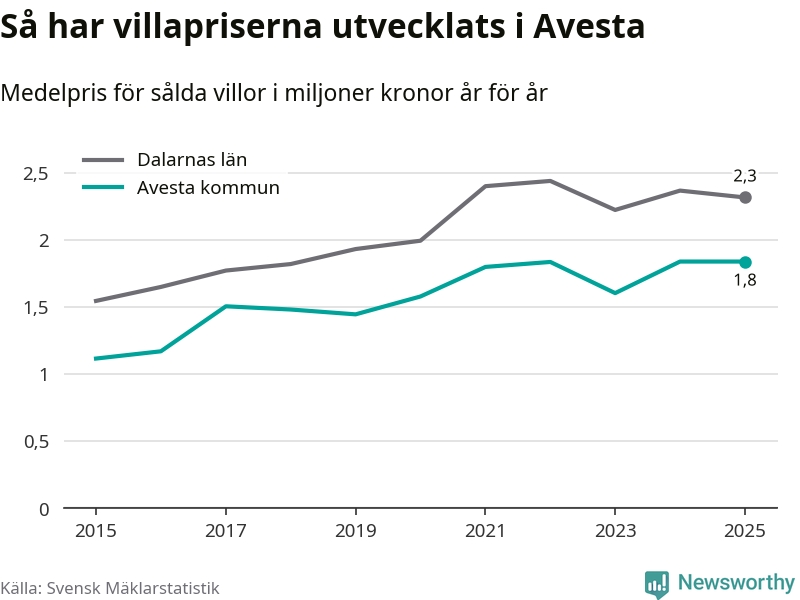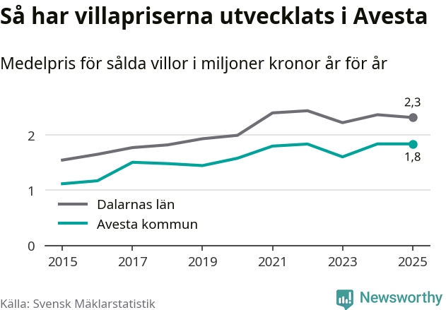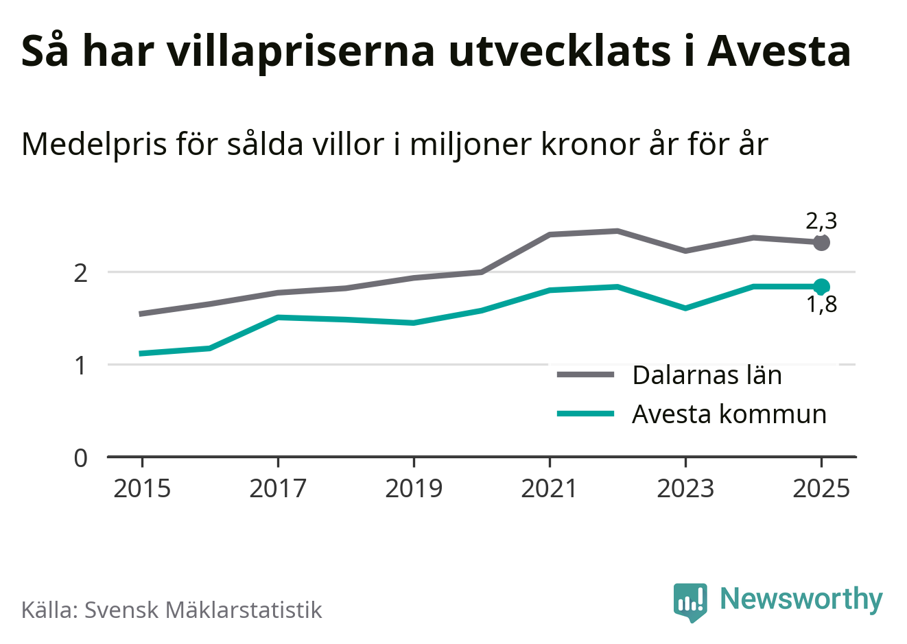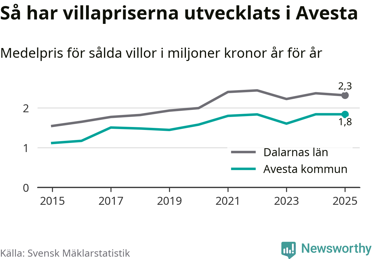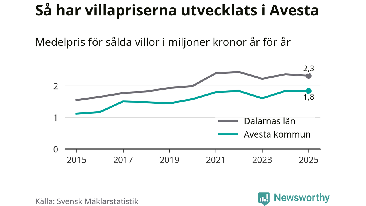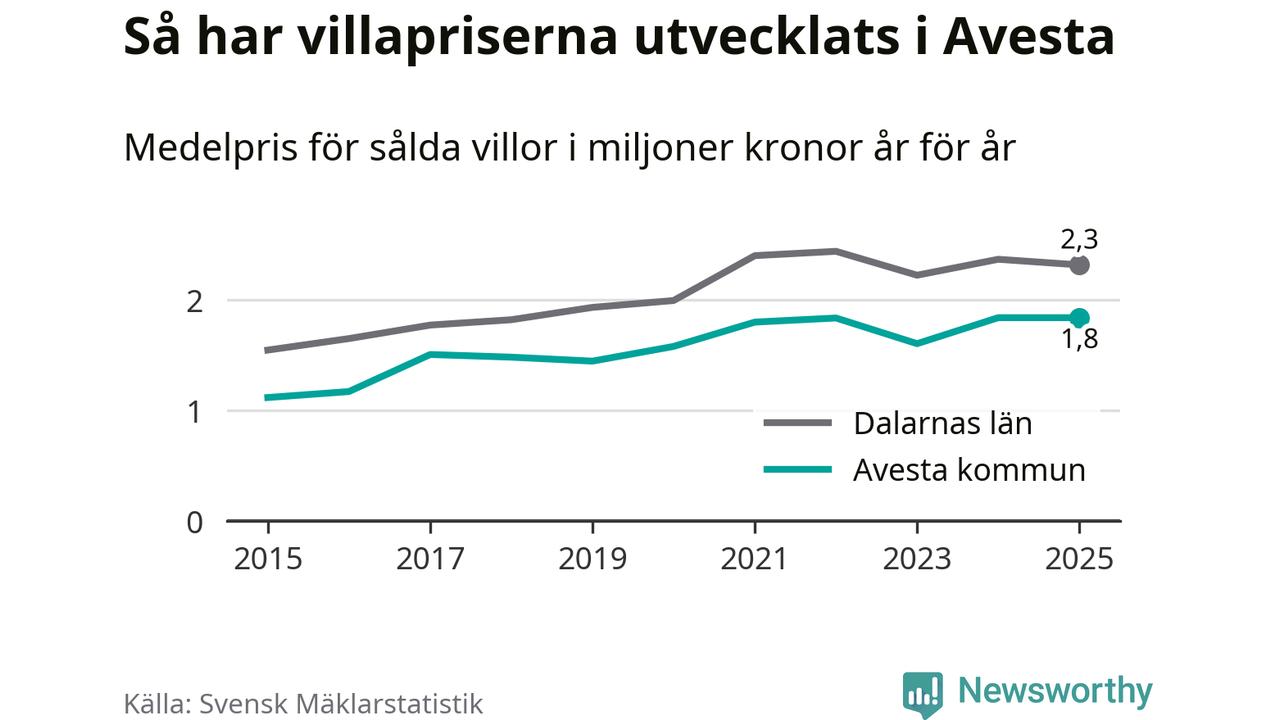 1,8 miljoner kronor är medelpriset för de villor som såldes i Avesta kommun under året, eller 15 560 kronor per kvadratmeter. Det innebär att priserna har legat i stort sett stilla sedan förra året.