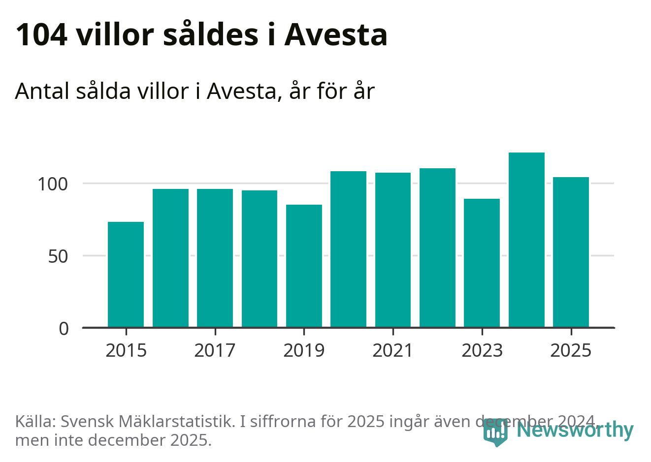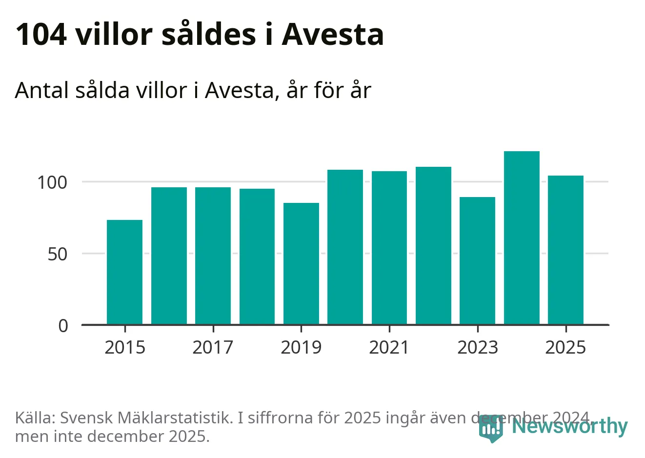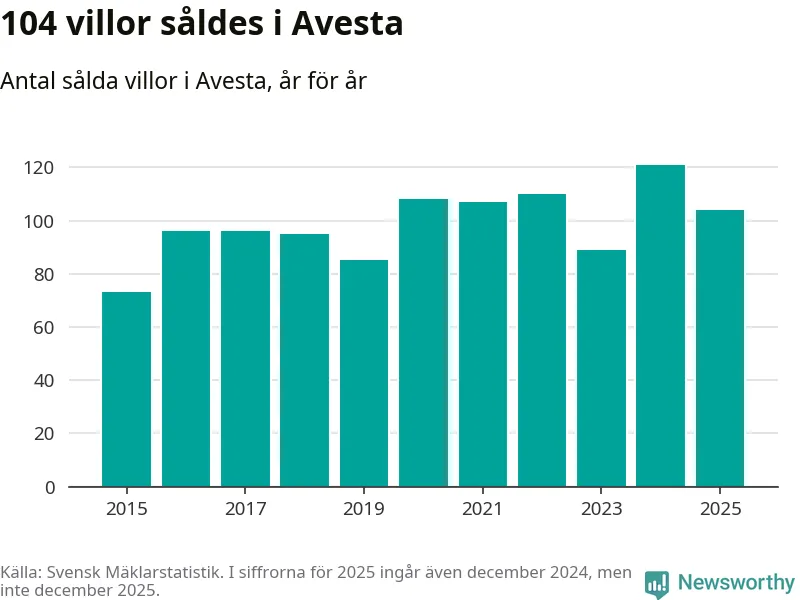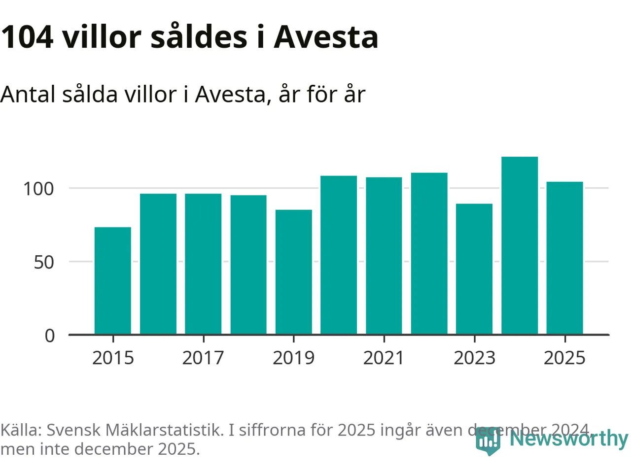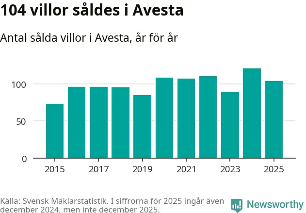 Däremot minskade antalet sålda villor. Totalt såldes 104 villor, att jämföra med 121 under 2024.