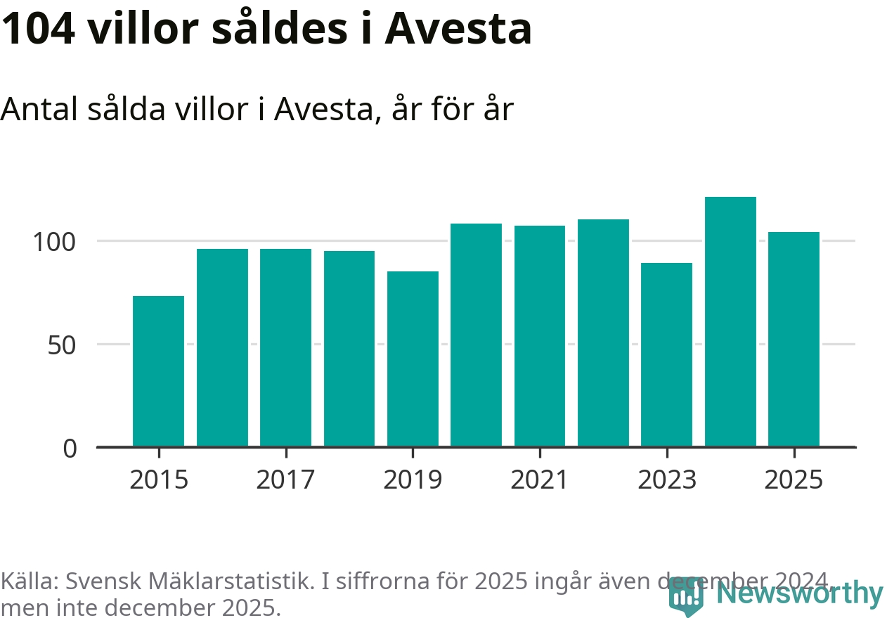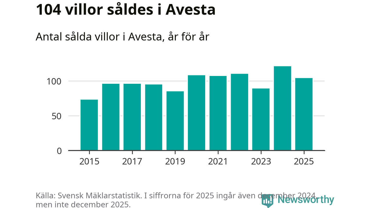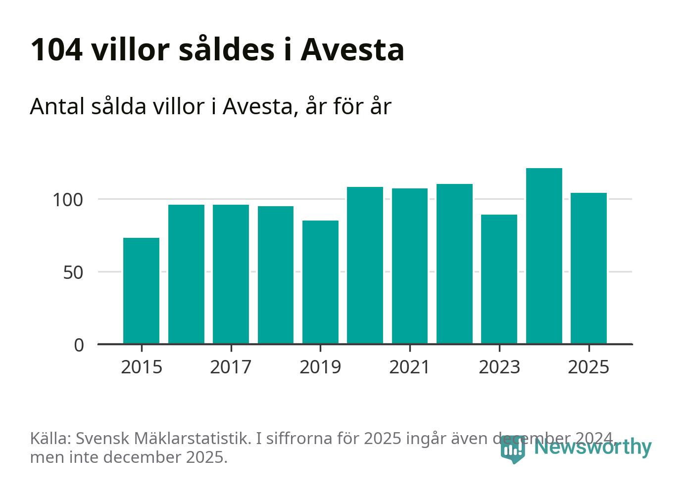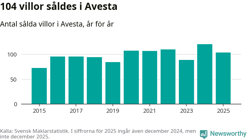 Däremot minskade antalet sålda villor. Totalt såldes 104 villor, att jämföra med 121 under 2024.