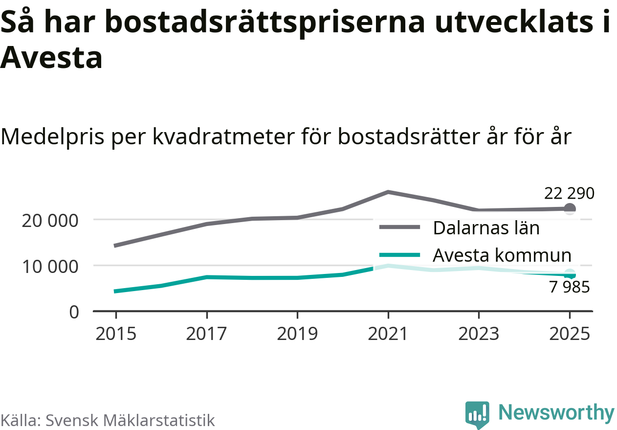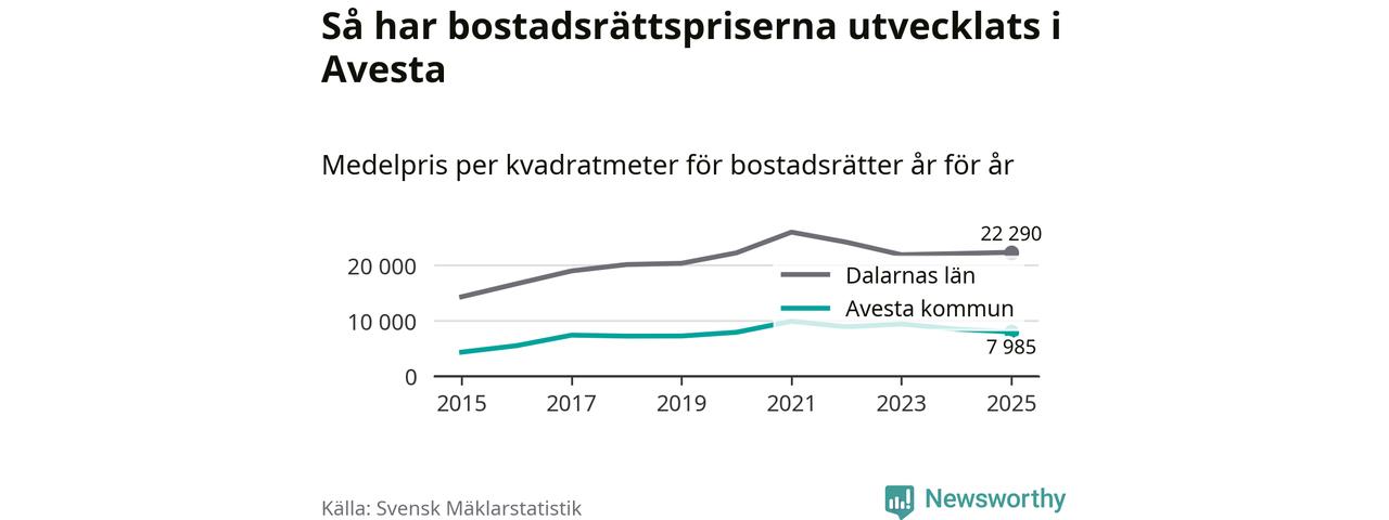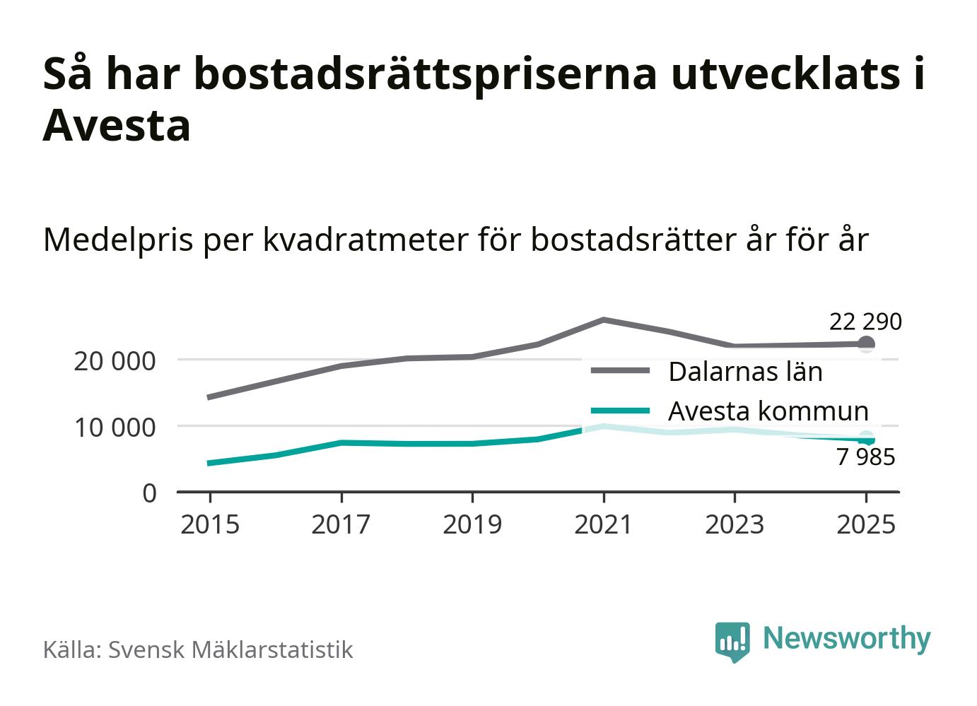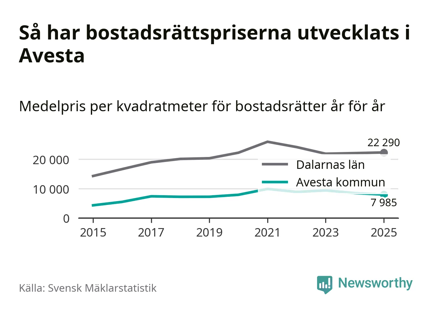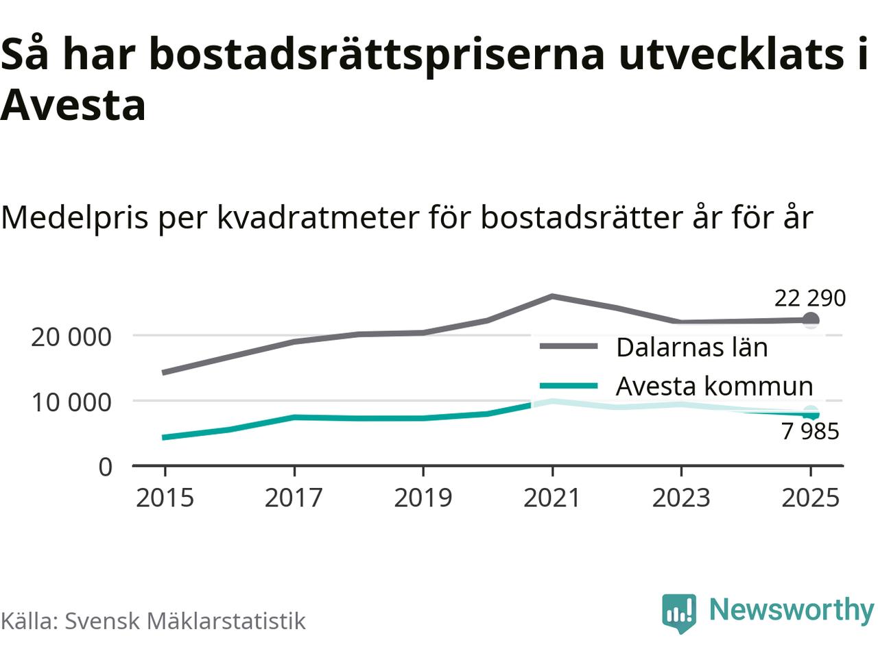 Det såldes totalt 160 bostadsrätter i Avesta kommun under året. Genomsnittspriset per kvadratmeter landade på 7 985 kronor. Det är en minskning med sex procent i kommunen på ett år.