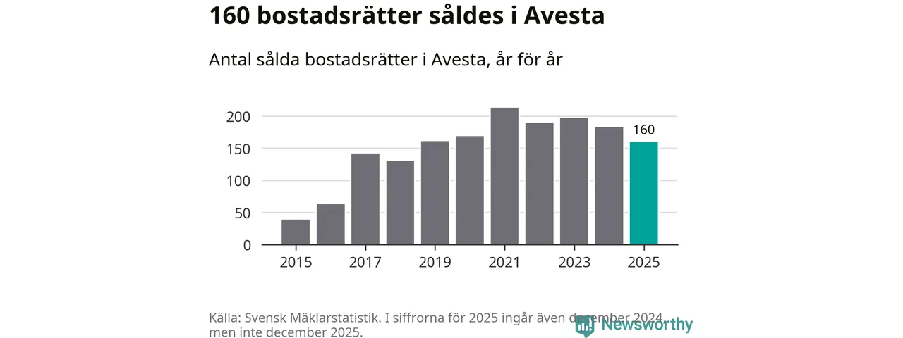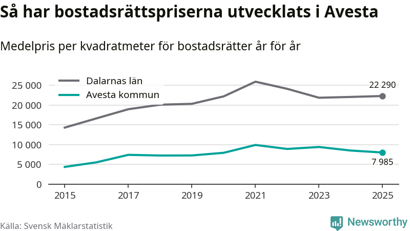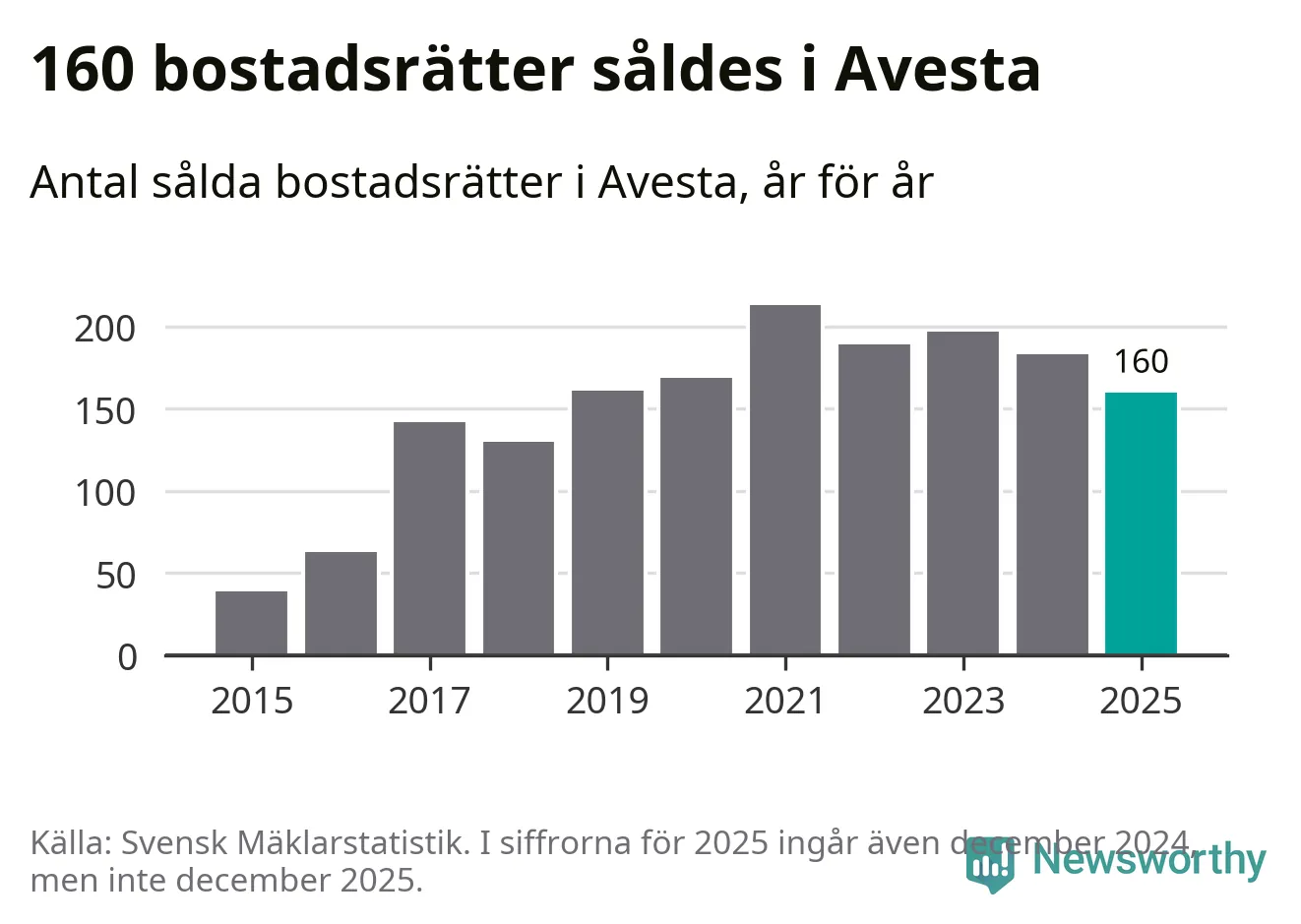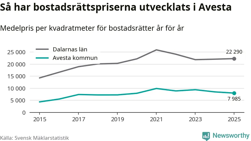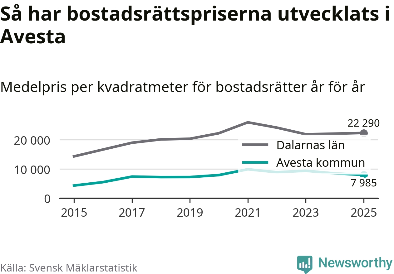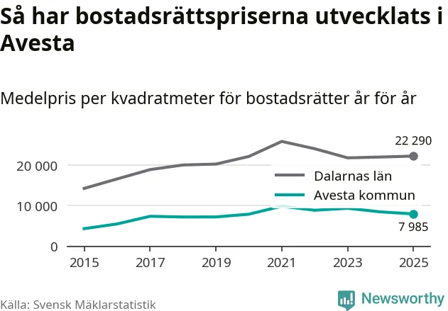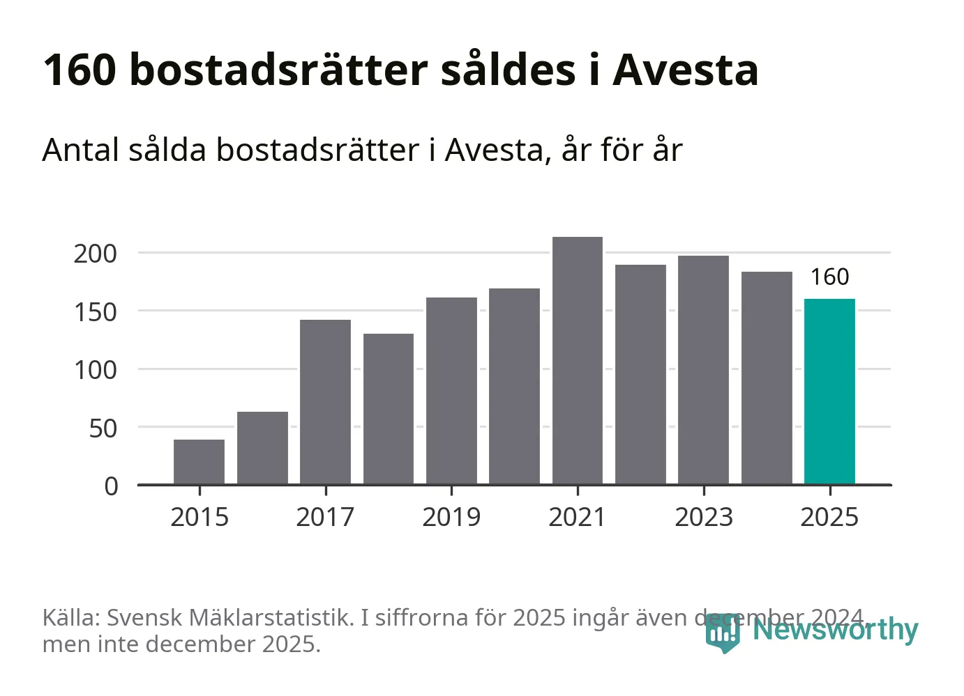 Det såldes totalt 160 bostadsrätter i Avesta kommun under året. Genomsnittspriset per kvadratmeter landade på 7 985 kronor. Det är en minskning med sex procent i kommunen på ett år.