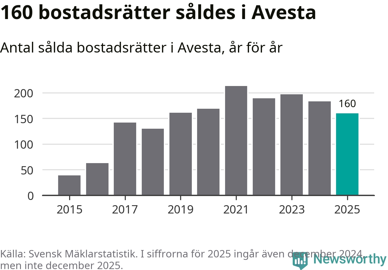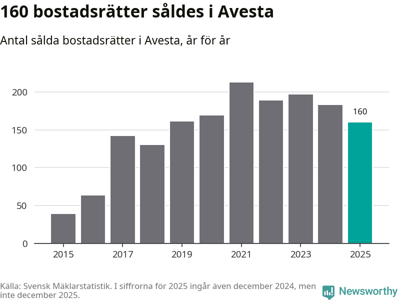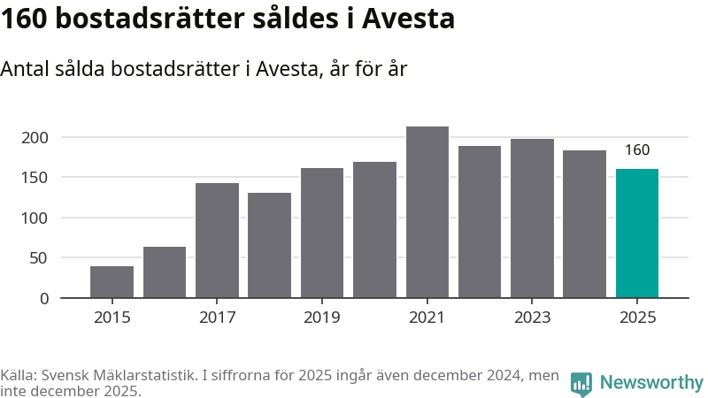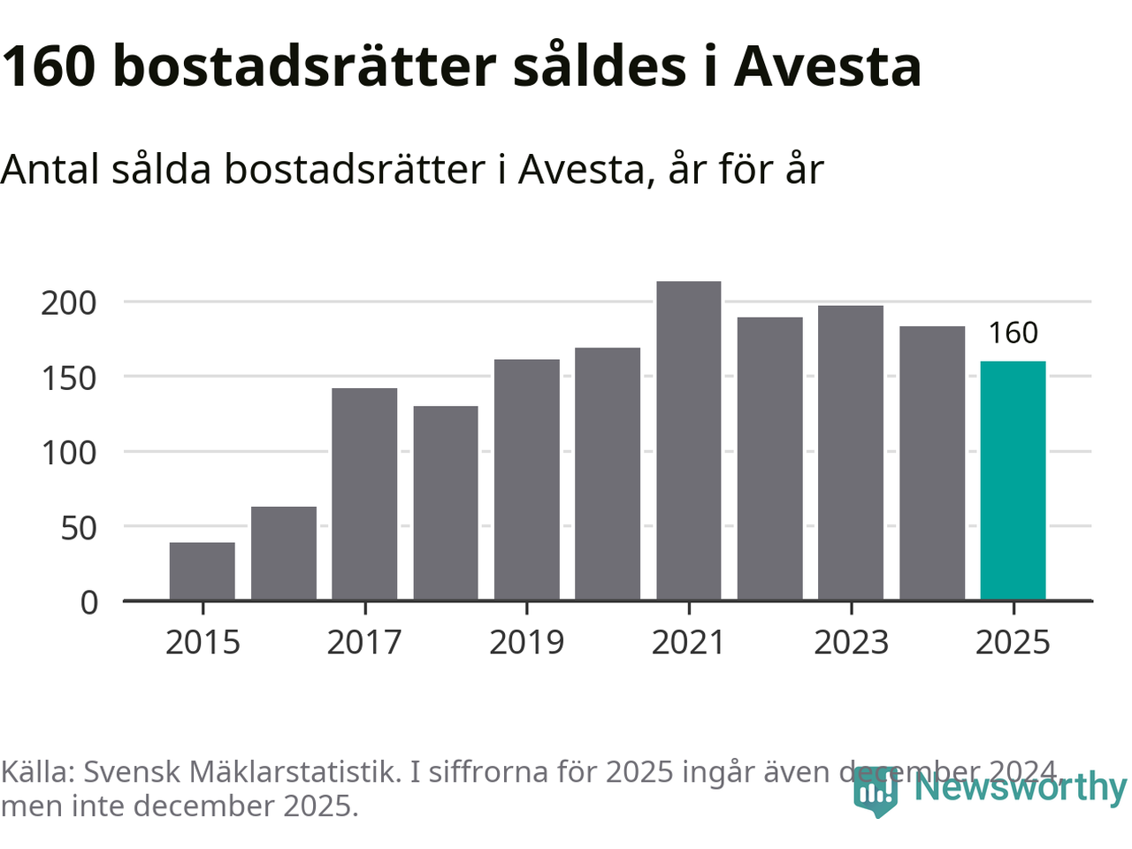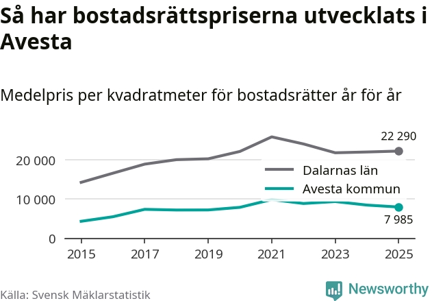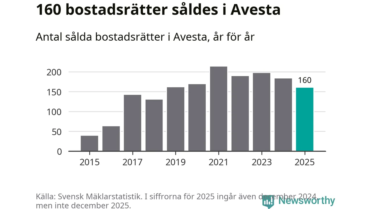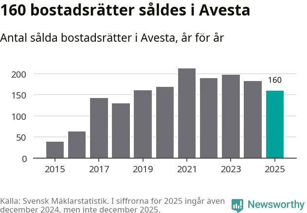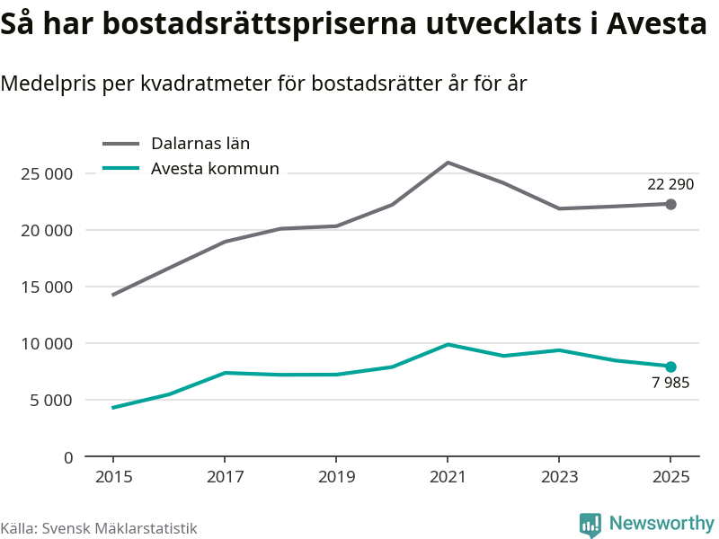Det såldes totalt 160 bostadsrätter i Avesta kommun under året. Genomsnittspriset per kvadratmeter landade på 7 985 kronor. Det är en minskning med sex procent i kommunen på ett år.