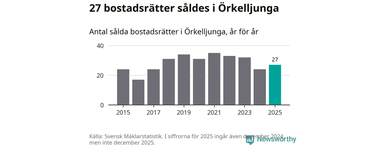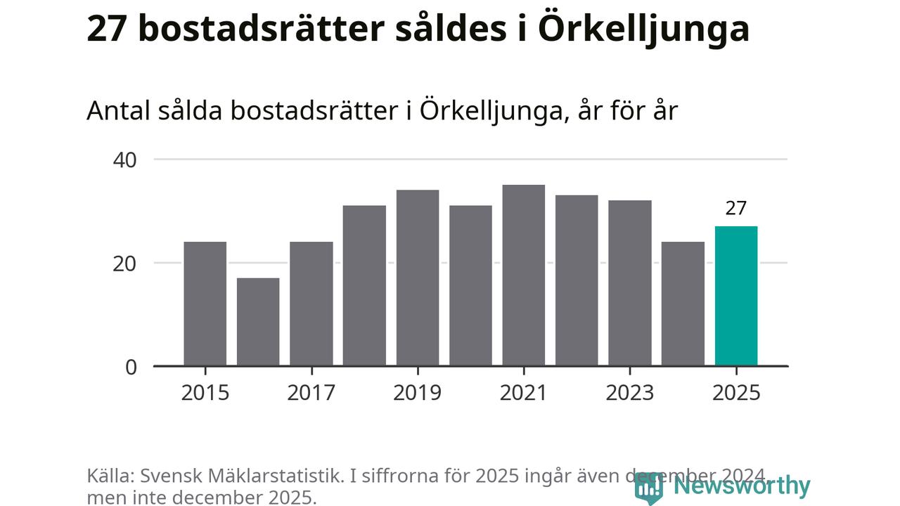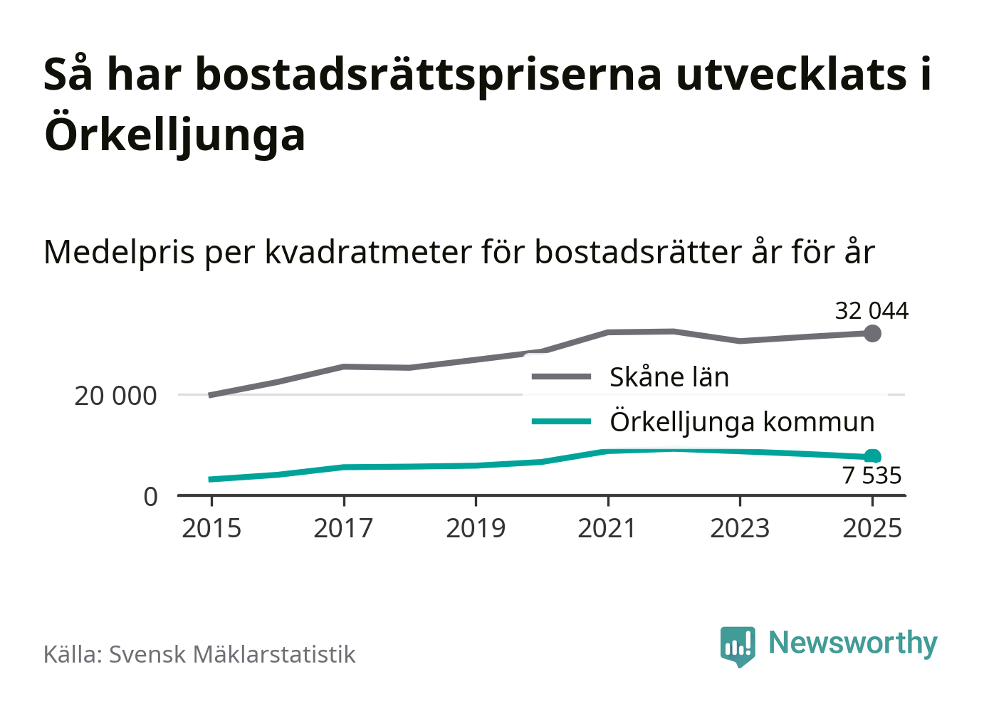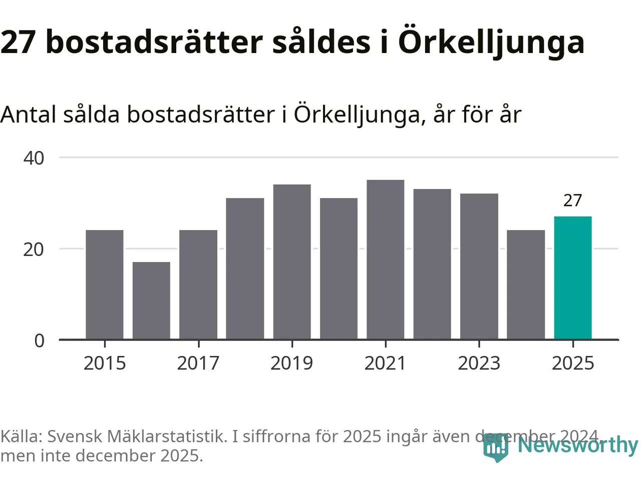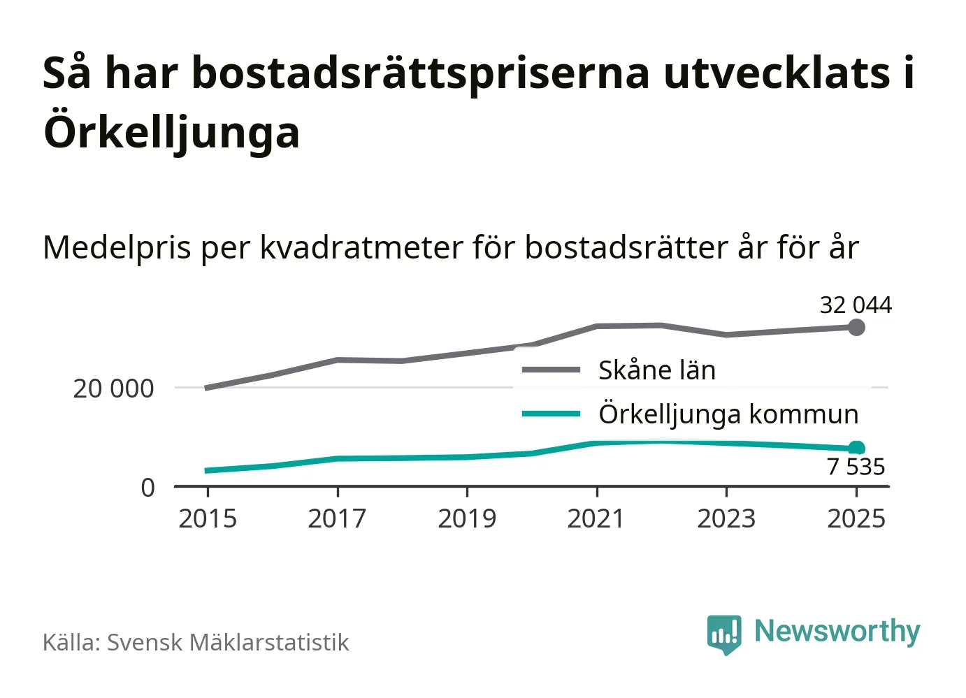 Det såldes totalt 27 bostadsrätter i Örkelljunga kommun under året. Genomsnittspriset per kvadratmeter landade på 7 535 kronor. Det är en minskning med åtta procent i kommunen på ett år.