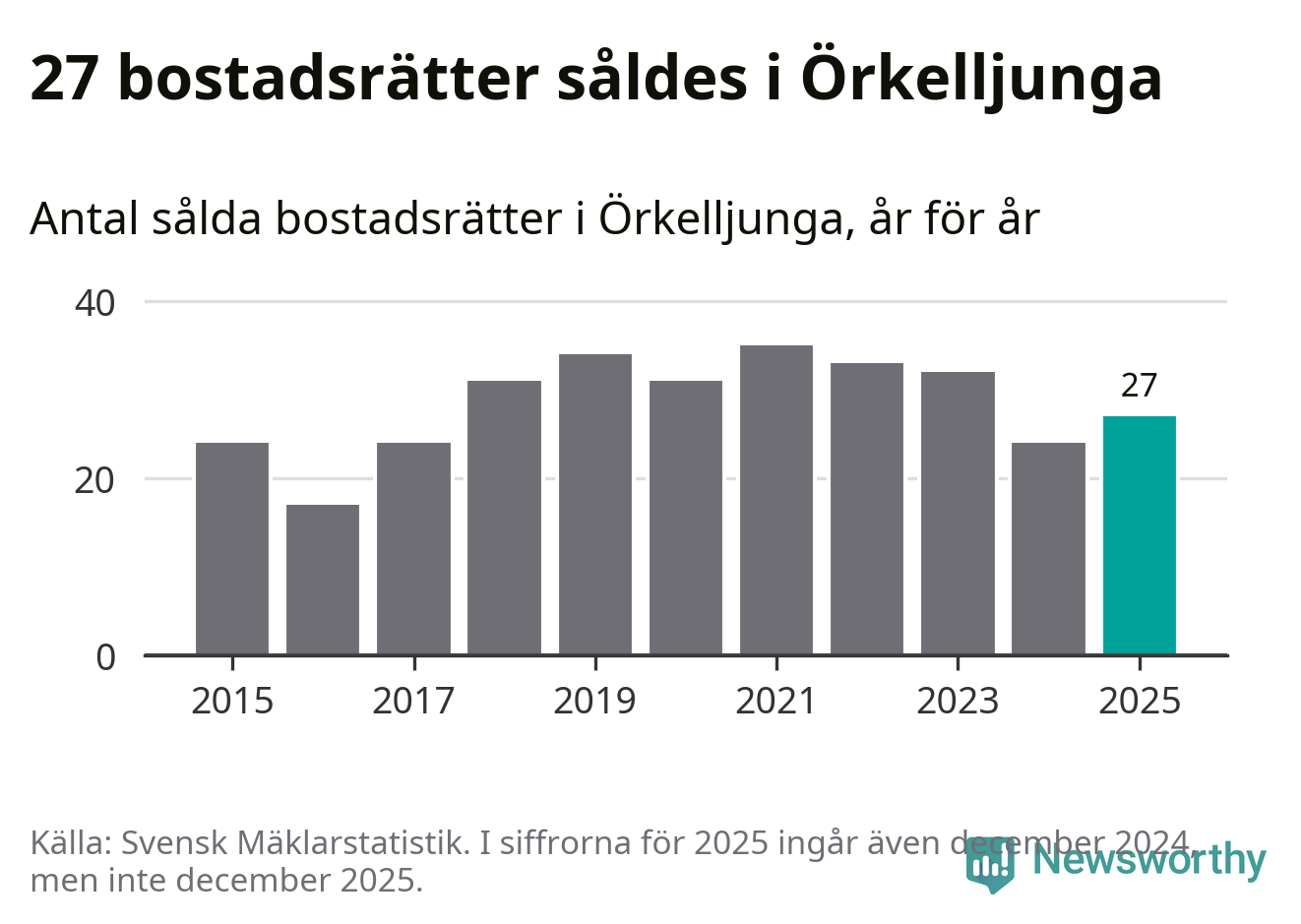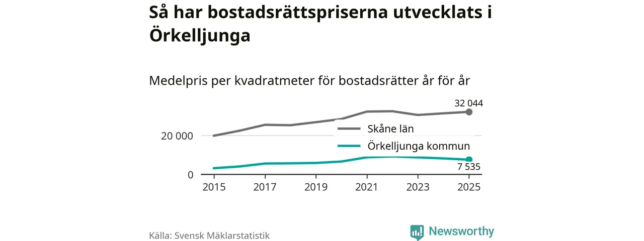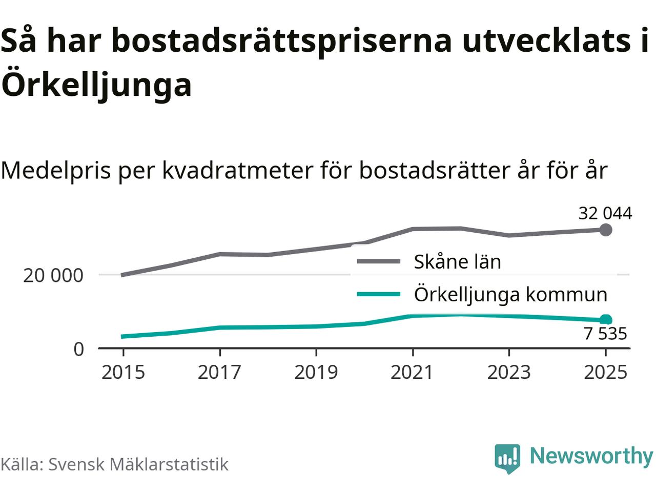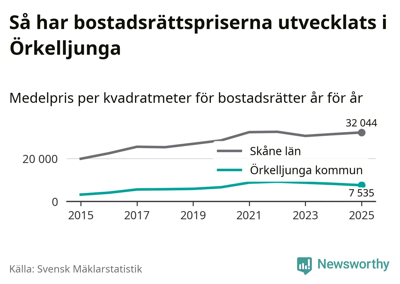 Det såldes totalt 27 bostadsrätter i Örkelljunga kommun under året. Genomsnittspriset per kvadratmeter landade på 7 535 kronor. Det är en minskning med åtta procent i kommunen på ett år.