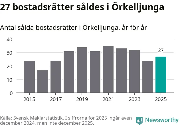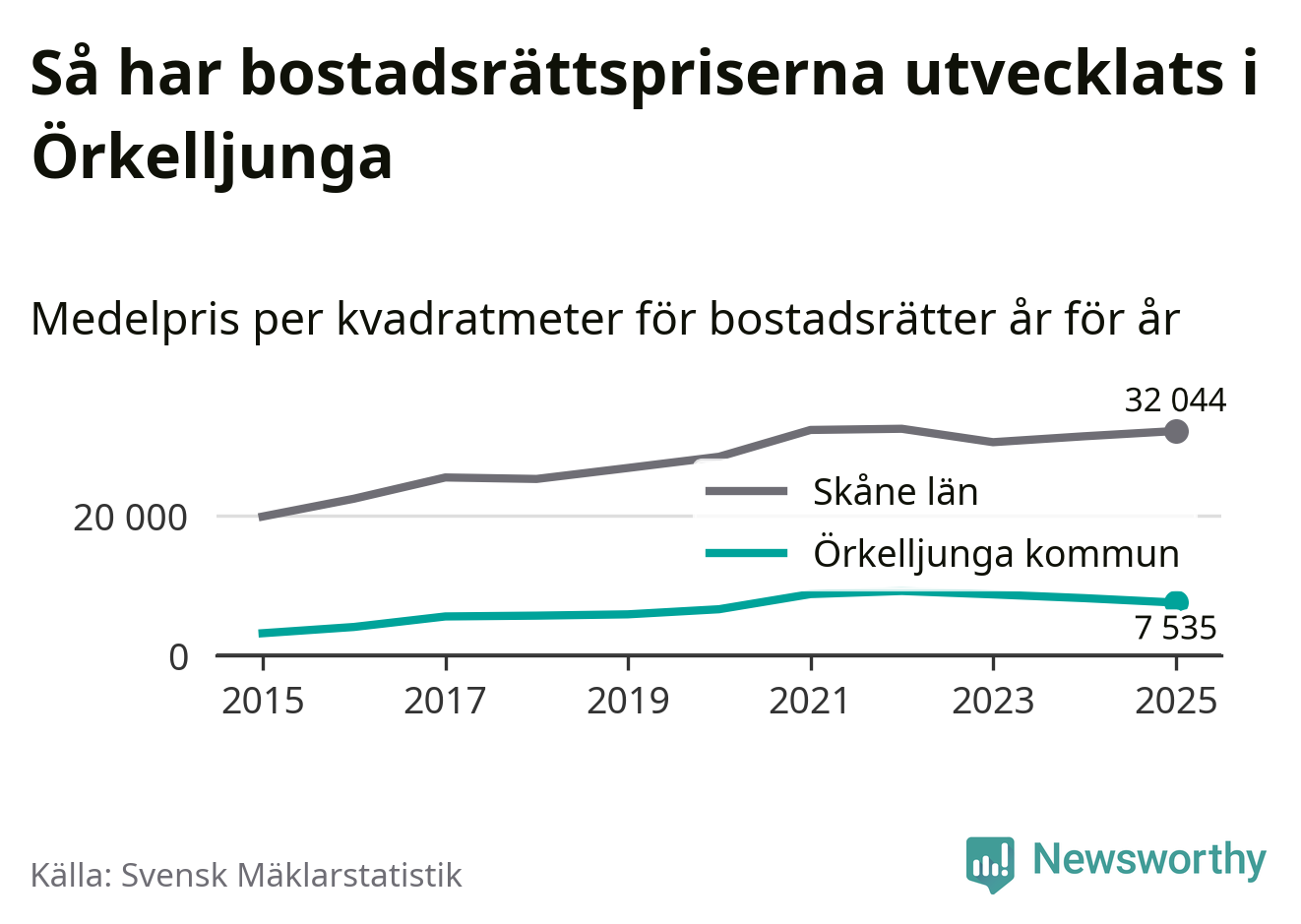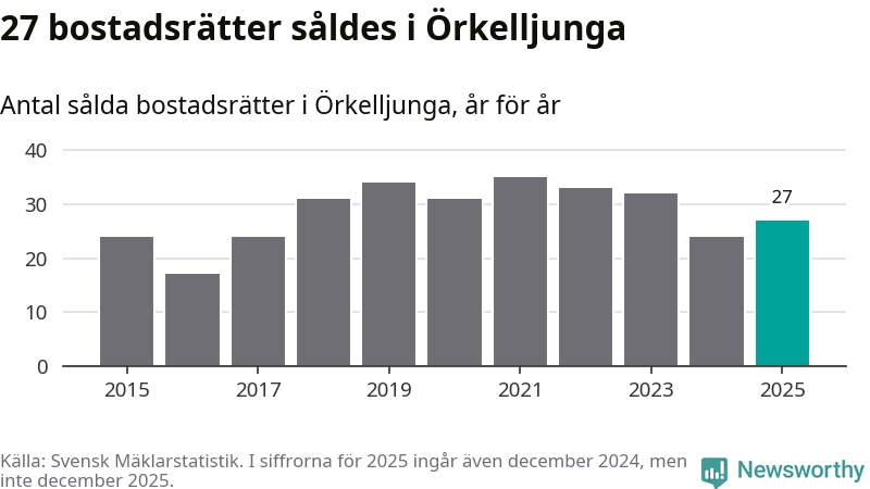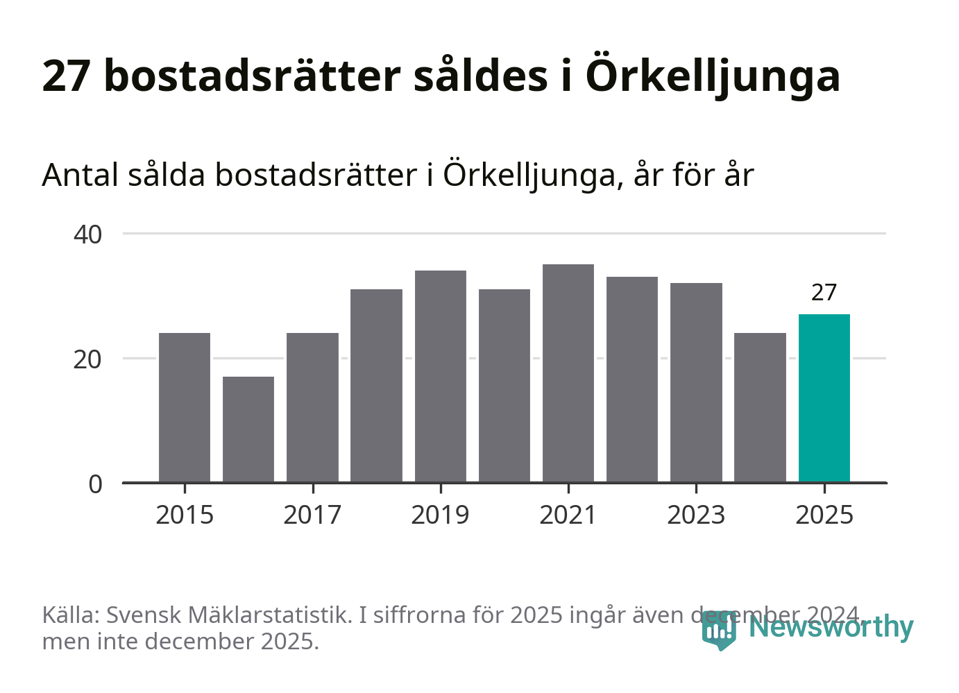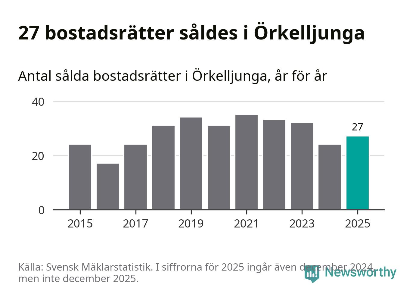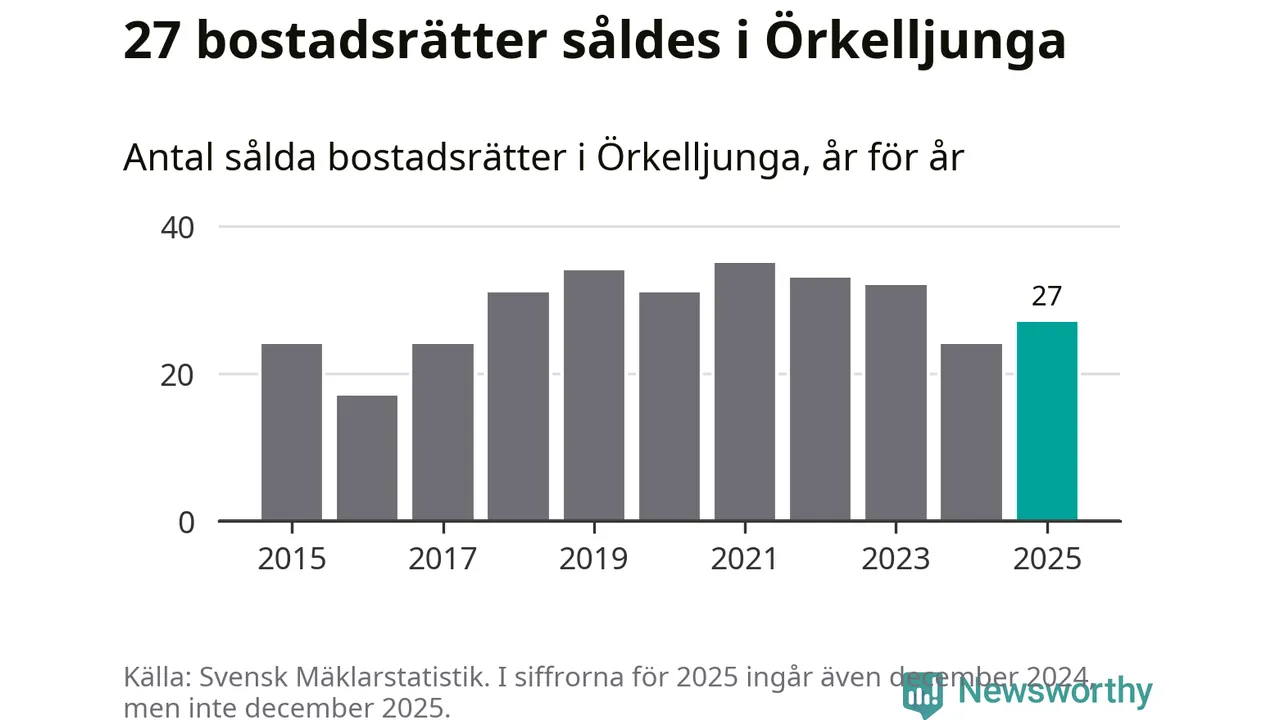 Det såldes totalt 27 bostadsrätter i Örkelljunga kommun under året. Genomsnittspriset per kvadratmeter landade på 7 535 kronor. Det är en minskning med åtta procent i kommunen på ett år.