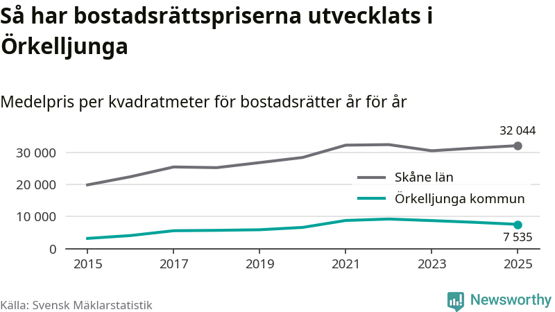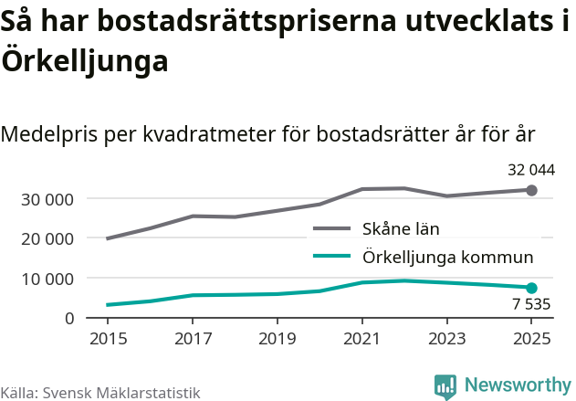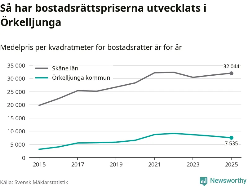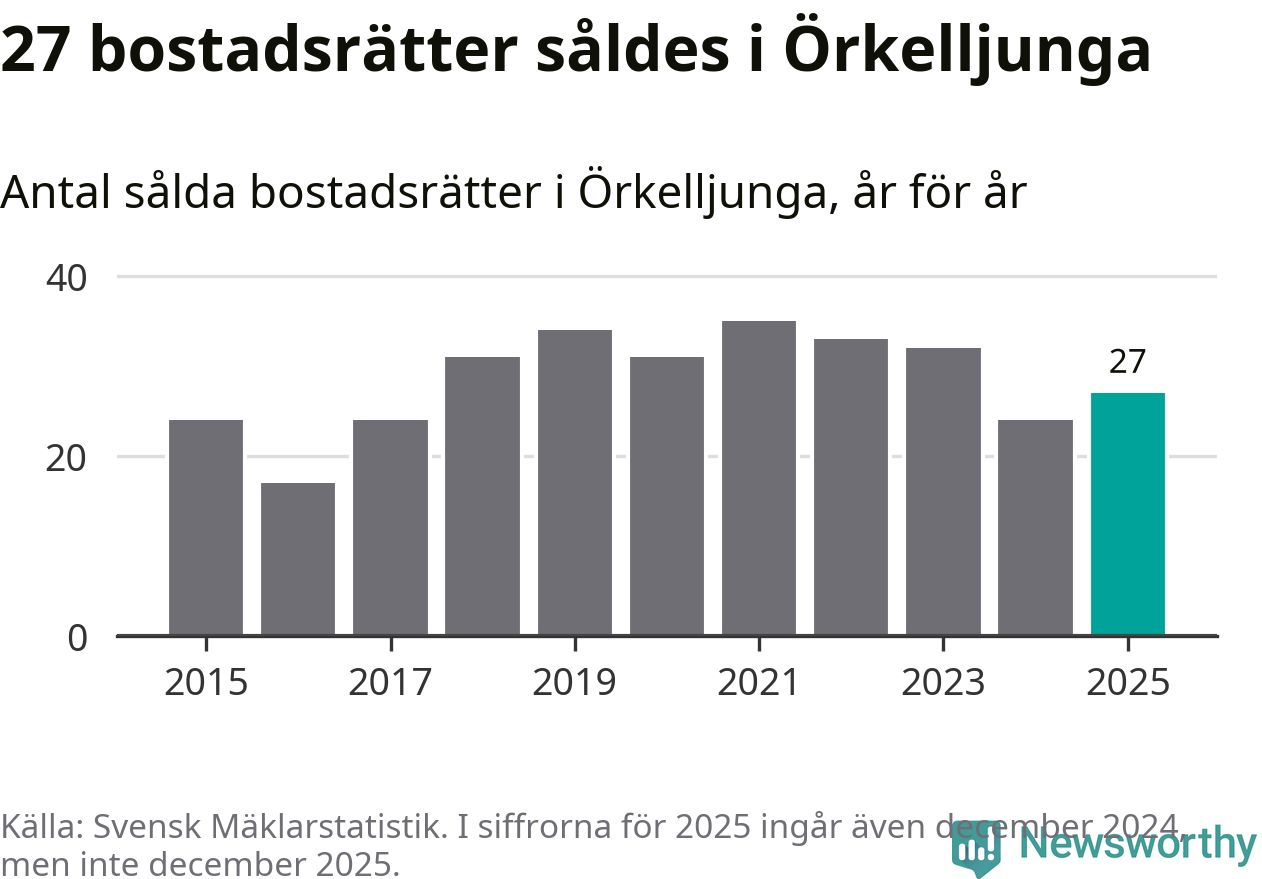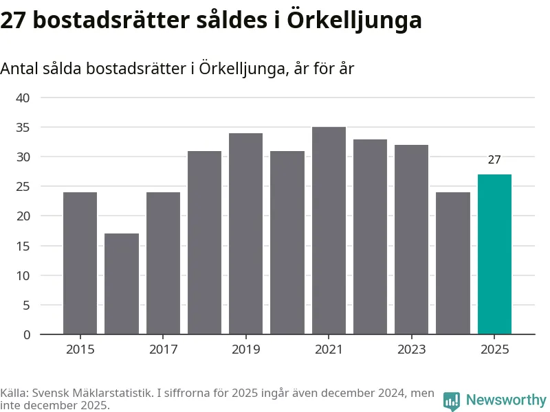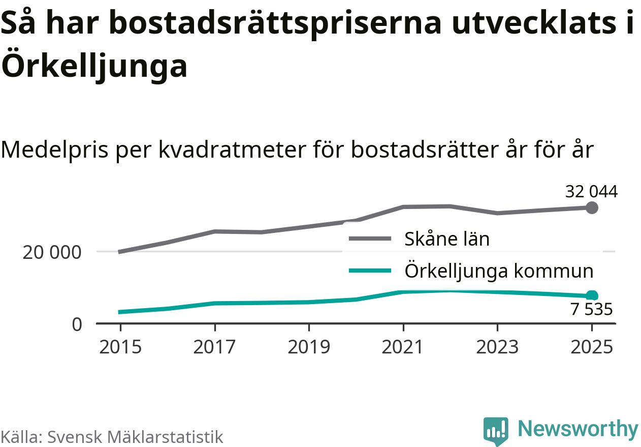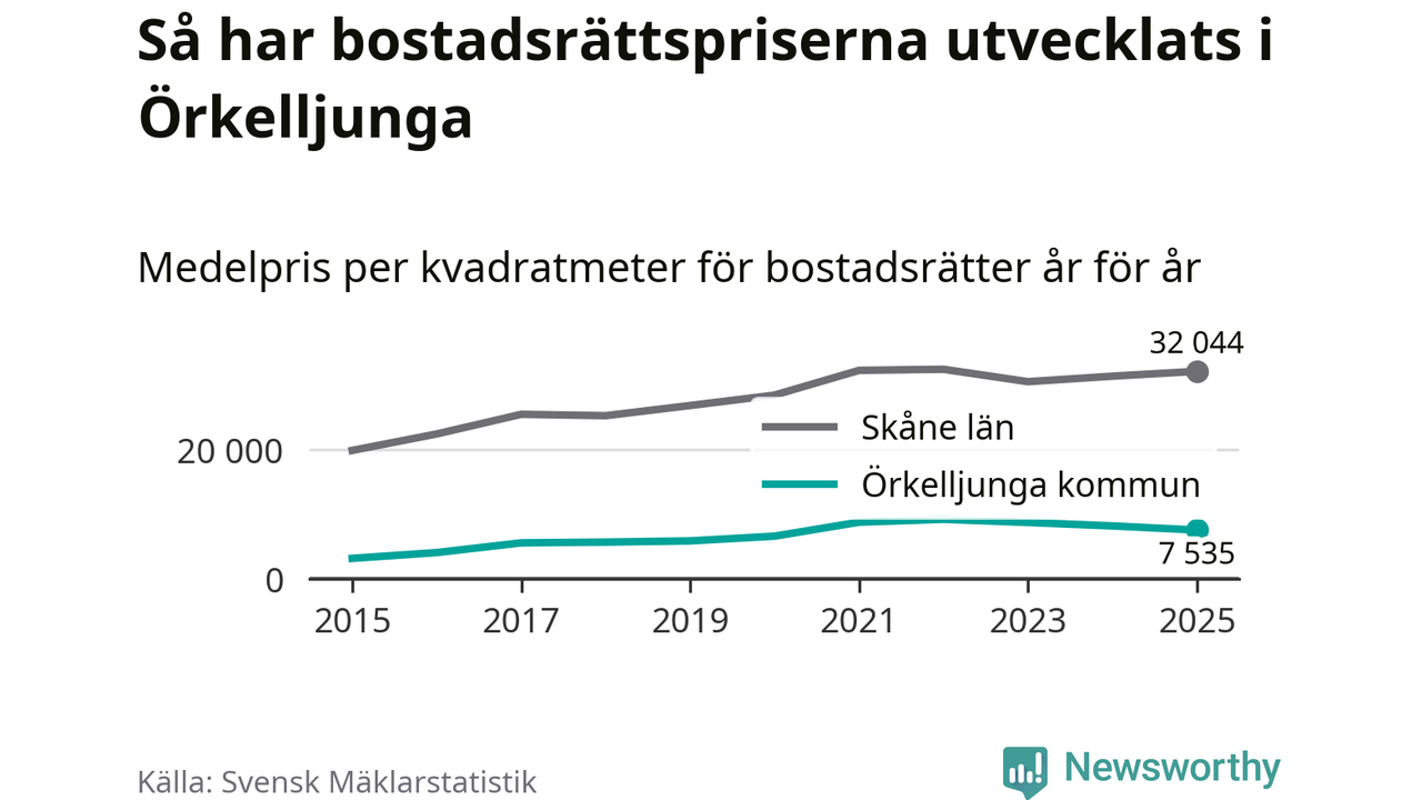Det såldes totalt 27 bostadsrätter i Örkelljunga kommun under året. Genomsnittspriset per kvadratmeter landade på 7 535 kronor. Det är en minskning med åtta procent i kommunen på ett år.
