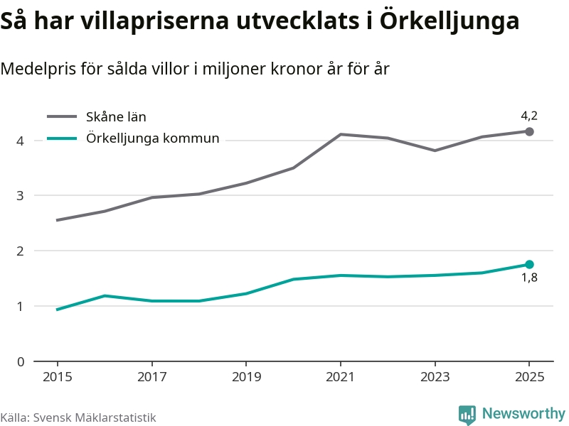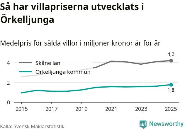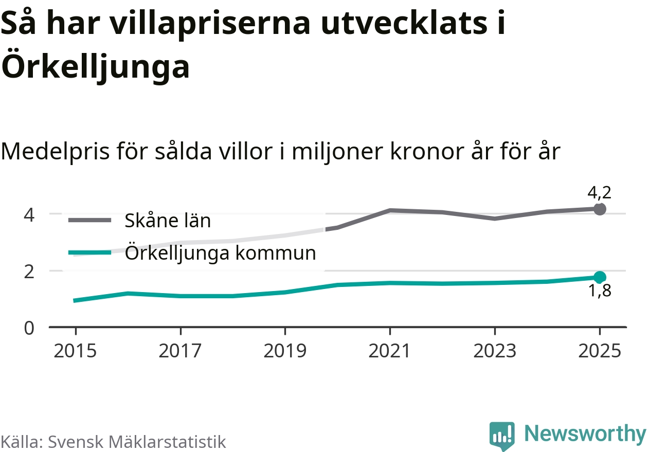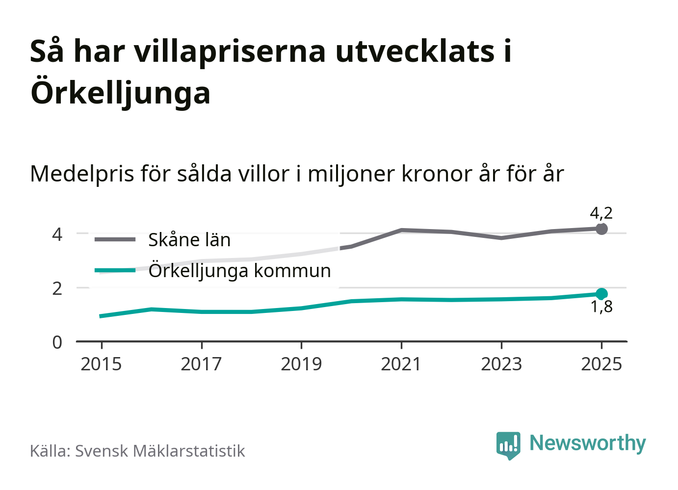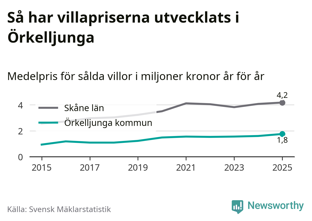 1,8 miljoner kronor är medelpriset för de villor som såldes i Örkelljunga kommun under året, eller 15 588 kronor per kvadratmeter. Det innebär en prisökning med tio procent på ett år. Det är det högsta årssnittet på åtminstone tio år.