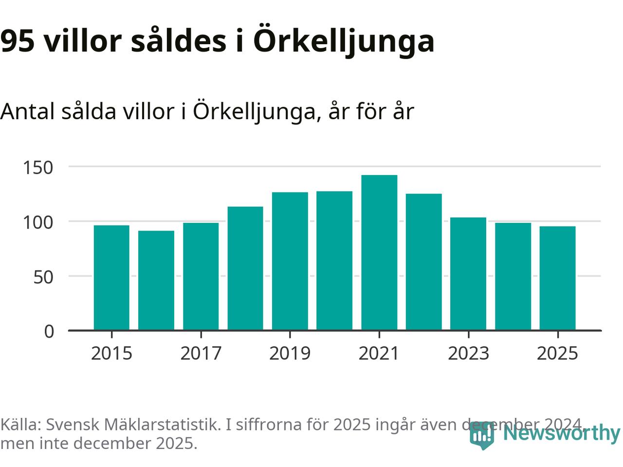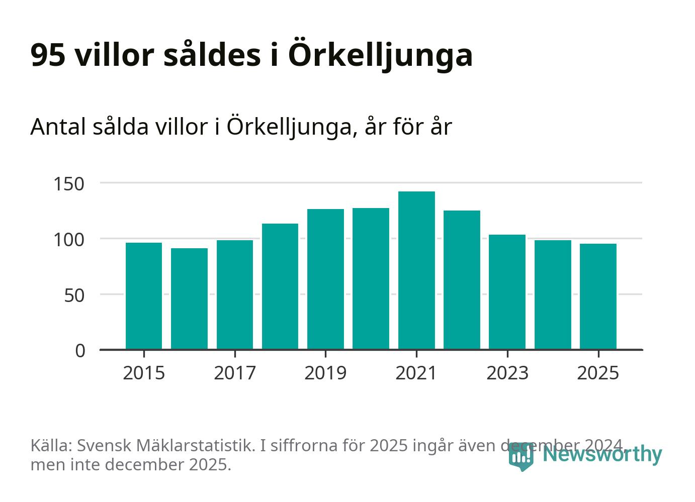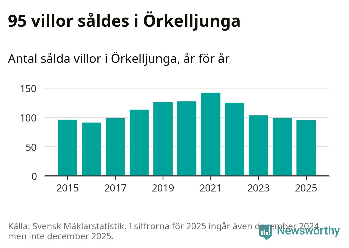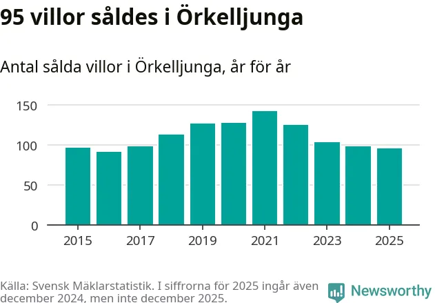 Däremot minskade antalet sålda villor något. Totalt såldes 95 villor, att jämföra med 98 under 2024. Det är fjärde året i rad som antalet sålda villor minskar i kommunen.