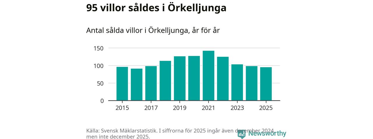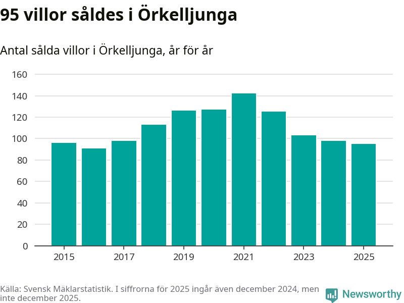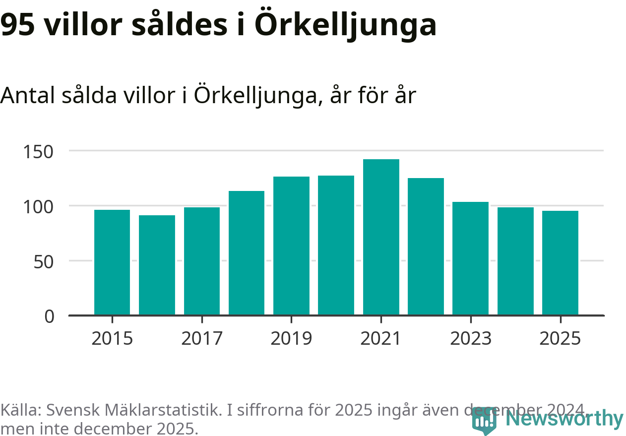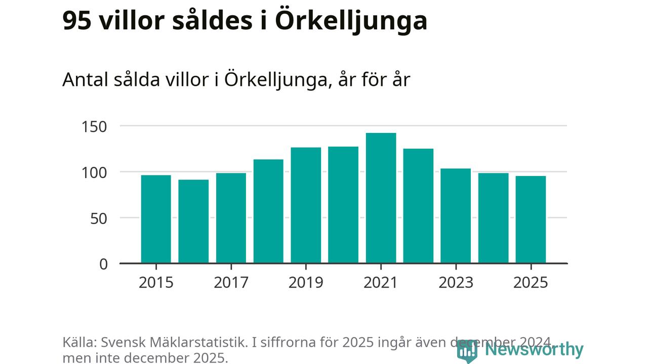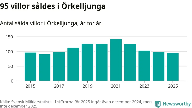 Däremot minskade antalet sålda villor något. Totalt såldes 95 villor, att jämföra med 98 under 2024. Det är fjärde året i rad som antalet sålda villor minskar i kommunen.