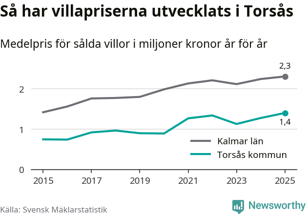 1,4 miljoner kronor är medelpriset för de villor som såldes i Torsås kommun under året, eller 12 078 kronor per kvadratmeter. Det innebär en prisökning med tio procent på ett år. Det är det högsta årssnittet på åtminstone tio år.